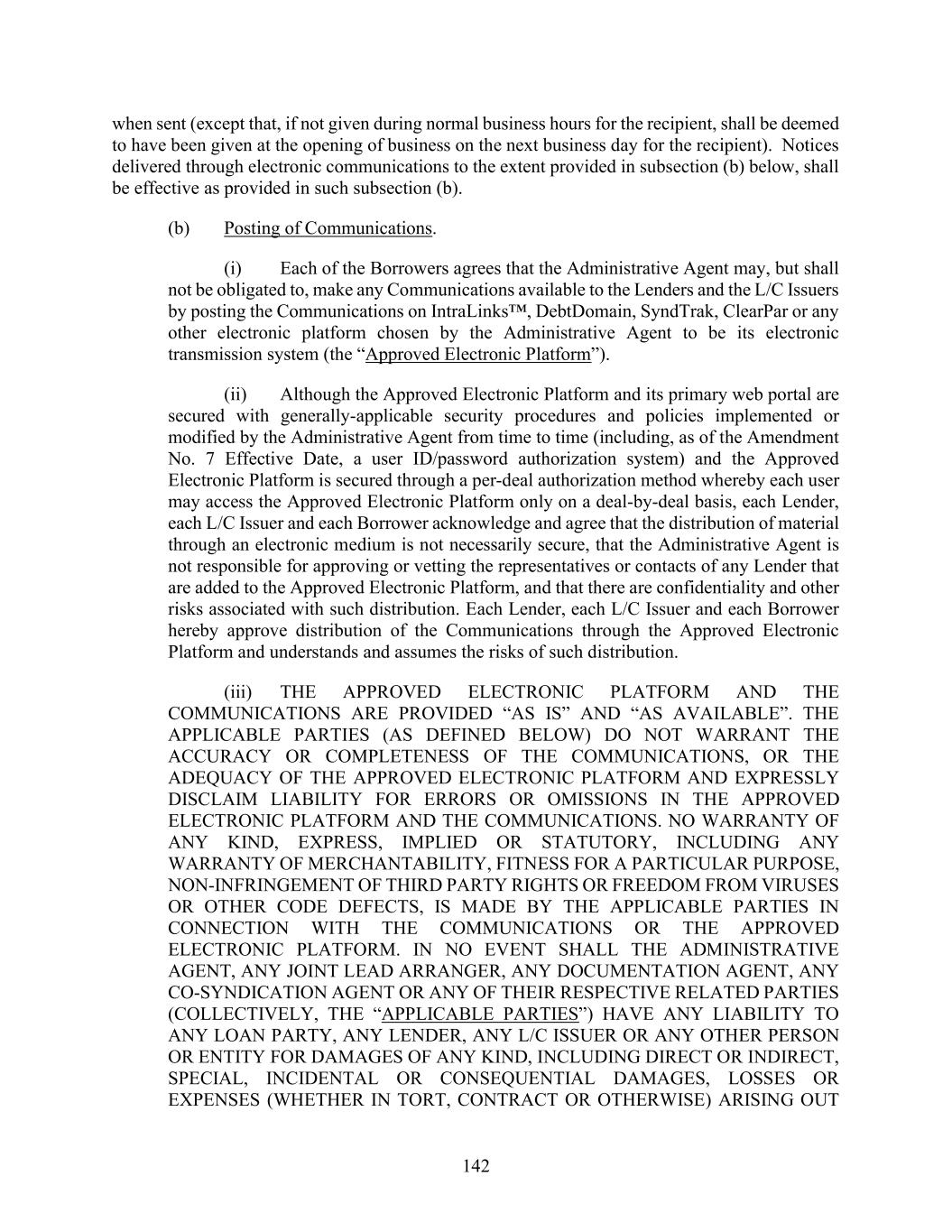 142 when sent (except that, if not given during normal business hours for the recipient, shall be deemed to have been given at the opening of business on the next business day for the recipient). Notices delivered through electronic communications to the extent provided in subsection (b) below, shall be effective as provided in such subsection (b). (b) Posting of Communications. (i) Each of the Borrowers agrees that the Administrative Agent may, but shall not be obligated to, make any Communications available to the Lenders and the L/C Issuers by posting the Communications on IntraLinks™, DebtDomain, SyndTrak, ClearPar or any other electronic platform chosen by the Administrative Agent to be its electronic transmission system (the “Approved Electronic Platform”). (ii) Although the Approved Electronic Platform and its primary web portal are secured with generally-applicable security procedures and policies implemented or modified by the Administrative Agent from time to time (including, as of the Amendment No. 7 Effective Date, a user ID/password authorization system) and the Approved Electronic Platform is secured through a per-deal authorization method whereby each user may access the Approved Electronic Platform only on a deal-by-deal basis, each Lender, each L/C Issuer and each Borrower acknowledge and agree that the distribution of material through an electronic medium is not necessarily secure, that the Administrative Agent is not responsible for approving or vetting the representatives or contacts of any Lender that are added to the Approved Electronic Platform, and that there are confidentiality and other risks associated with such distribution. Each Lender, each L/C Issuer and each Borrower hereby approve distribution of the Communications through the Approved Electronic Platform and understands and assumes the risks of such distribution. (iii) THE APPROVED ELECTRONIC PLATFORM AND THE COMMUNICATIONS ARE PROVIDED “AS IS” AND “AS AVAILABLE”. THE APPLICABLE PARTIES (AS DEFINED BELOW) DO NOT WARRANT THE ACCURACY OR COMPLETENESS OF THE COMMUNICATIONS, OR THE ADEQUACY OF THE APPROVED ELECTRONIC PLATFORM AND EXPRESSLY DISCLAIM LIABILITY FOR ERRORS OR OMISSIONS IN THE APPROVED ELECTRONIC PLATFORM AND THE COMMUNICATIONS. NO WARRANTY OF ANY KIND, EXPRESS, IMPLIED OR STATUTORY, INCLUDING ANY WARRANTY OF MERCHANTABILITY, FITNESS FOR A PARTICULAR PURPOSE, NON-INFRINGEMENT OF THIRD PARTY RIGHTS OR FREEDOM FROM VIRUSES OR OTHER CODE DEFECTS, IS MADE BY THE APPLICABLE PARTIES IN CONNECTION WITH THE COMMUNICATIONS OR THE APPROVED ELECTRONIC PLATFORM. IN NO EVENT SHALL THE ADMINISTRATIVE AGENT, ANY JOINT LEAD ARRANGER, ANY DOCUMENTATION AGENT, ANY CO-SYNDICATION AGENT OR ANY OF THEIR RESPECTIVE RELATED PARTIES (COLLECTIVELY, THE “APPLICABLE PARTIES”) HAVE ANY LIABILITY TO ANY LOAN PARTY, ANY LENDER, ANY L/C ISSUER OR ANY OTHER PERSON OR ENTITY FOR DAMAGES OF ANY KIND, INCLUDING DIRECT OR INDIRECT, SPECIAL, INCIDENTAL OR CONSEQUENTIAL DAMAGES, LOSSES OR EXPENSES (WHETHER IN TORT, CONTRACT OR OTHERWISE) ARISING OUT