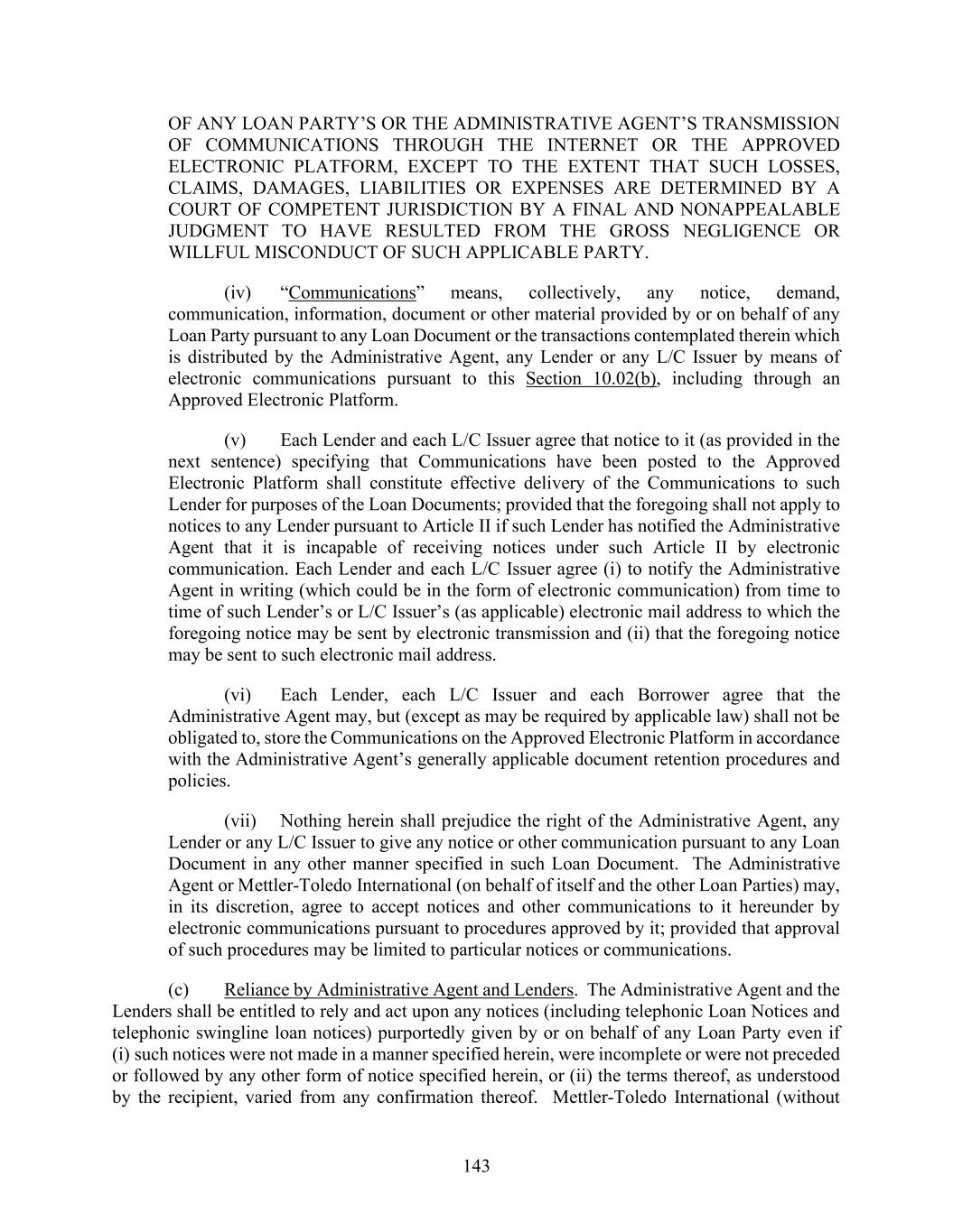 143 OF ANY LOAN PARTY’S OR THE ADMINISTRATIVE AGENT’S TRANSMISSION OF COMMUNICATIONS THROUGH THE INTERNET OR THE APPROVED ELECTRONIC PLATFORM, EXCEPT TO THE EXTENT THAT SUCH LOSSES, CLAIMS, DAMAGES, LIABILITIES OR EXPENSES ARE DETERMINED BY A COURT OF COMPETENT JURISDICTION BY A FINAL AND NONAPPEALABLE JUDGMENT TO HAVE RESULTED FROM THE GROSS NEGLIGENCE OR WILLFUL MISCONDUCT OF SUCH APPLICABLE PARTY. (iv) “Communications” means, collectively, any notice, demand, communication, information, document or other material provided by or on behalf of any Loan Party pursuant to any Loan Document or the transactions contemplated therein which is distributed by the Administrative Agent, any Lender or any L/C Issuer by means of electronic communications pursuant to this Section 10.02(b), including through an Approved Electronic Platform. (v) Each Lender and each L/C Issuer agree that notice to it (as provided in the next sentence) specifying that Communications have been posted to the Approved Electronic Platform shall constitute effective delivery of the Communications to such Lender for purposes of the Loan Documents; provided that the foregoing shall not apply to notices to any Lender pursuant to Article II if such Lender has notified the Administrative Agent that it is incapable of receiving notices under such Article II by electronic communication. Each Lender and each L/C Issuer agree (i) to notify the Administrative Agent in writing (which could be in the form of electronic communication) from time to time of such Lender’s or L/C Issuer’s (as applicable) electronic mail address to which the foregoing notice may be sent by electronic transmission and (ii) that the foregoing notice may be sent to such electronic mail address. (vi) Each Lender, each L/C Issuer and each Borrower agree that the Administrative Agent may, but (except as may be required by applicable law) shall not be obligated to, store the Communications on the Approved Electronic Platform in accordance with the Administrative Agent’s generally applicable document retention procedures and policies. (vii) Nothing herein shall prejudice the right of the Administrative Agent, any Lender or any L/C Issuer to give any notice or other communication pursuant to any Loan Document in any other manner specified in such Loan Document. The Administrative Agent or Mettler-Toledo International (on behalf of itself and the other Loan Parties) may, in its discretion, agree to accept notices and other communications to it hereunder by electronic communications pursuant to procedures approved by it; provided that approval of such procedures may be limited to particular notices or communications. (c) Reliance by Administrative Agent and Lenders. The Administrative Agent and the Lenders shall be entitled to rely and act upon any notices (including telephonic Loan Notices and telephonic swingline loan notices) purportedly given by or on behalf of any Loan Party even if (i) such notices were not made in a manner specified herein, were incomplete or were not preceded or followed by any other form of notice specified herein, or (ii) the terms thereof, as understood by the recipient, varied from any confirmation thereof. Mettler-Toledo International (without