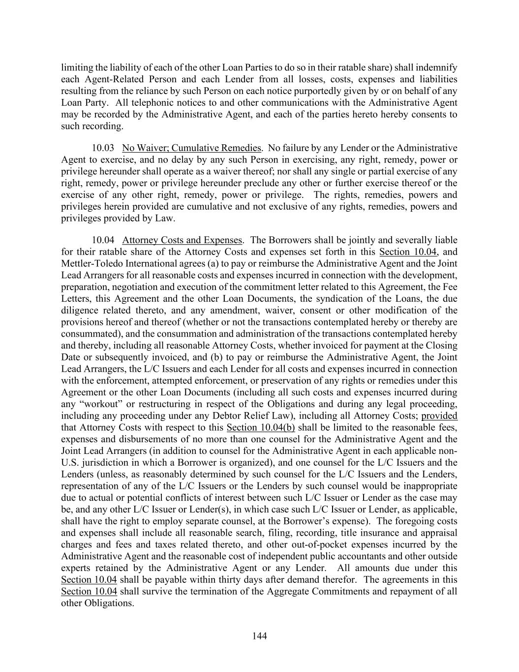144 limiting the liability of each of the other Loan Parties to do so in their ratable share) shall indemnify each Agent-Related Person and each Lender from all losses, costs, expenses and liabilities resulting from the reliance by such Person on each notice purportedly given by or on behalf of any Loan Party. All telephonic notices to and other communications with the Administrative Agent may be recorded by the Administrative Agent, and each of the parties hereto hereby consents to such recording. 10.03 No Waiver; Cumulative Remedies. No failure by any Lender or the Administrative Agent to exercise, and no delay by any such Person in exercising, any right, remedy, power or privilege hereunder shall operate as a waiver thereof; nor shall any single or partial exercise of any right, remedy, power or privilege hereunder preclude any other or further exercise thereof or the exercise of any other right, remedy, power or privilege. The rights, remedies, powers and privileges herein provided are cumulative and not exclusive of any rights, remedies, powers and privileges provided by Law. 10.04 Attorney Costs and Expenses. The Borrowers shall be jointly and severally liable for their ratable share of the Attorney Costs and expenses set forth in this Section 10.04, and Mettler-Toledo International agrees (a) to pay or reimburse the Administrative Agent and the Joint Lead Arrangers for all reasonable costs and expenses incurred in connection with the development, preparation, negotiation and execution of the commitment letter related to this Agreement, the Fee Letters, this Agreement and the other Loan Documents, the syndication of the Loans, the due diligence related thereto, and any amendment, waiver, consent or other modification of the provisions hereof and thereof (whether or not the transactions contemplated hereby or thereby are consummated), and the consummation and administration of the transactions contemplated hereby and thereby, including all reasonable Attorney Costs, whether invoiced for payment at the Closing Date or subsequently invoiced, and (b) to pay or reimburse the Administrative Agent, the Joint Lead Arrangers, the L/C Issuers and each Lender for all costs and expenses incurred in connection with the enforcement, attempted enforcement, or preservation of any rights or remedies under this Agreement or the other Loan Documents (including all such costs and expenses incurred during any “workout” or restructuring in respect of the Obligations and during any legal proceeding, including any proceeding under any Debtor Relief Law), including all Attorney Costs; provided that Attorney Costs with respect to this Section 10.04(b) shall be limited to the reasonable fees, expenses and disbursements of no more than one counsel for the Administrative Agent and the Joint Lead Arrangers (in addition to counsel for the Administrative Agent in each applicable non- U.S. jurisdiction in which a Borrower is organized), and one counsel for the L/C Issuers and the Lenders (unless, as reasonably determined by such counsel for the L/C Issuers and the Lenders, representation of any of the L/C Issuers or the Lenders by such counsel would be inappropriate due to actual or potential conflicts of interest between such L/C Issuer or Lender as the case may be, and any other L/C Issuer or Lender(s), in which case such L/C Issuer or Lender, as applicable, shall have the right to employ separate counsel, at the Borrower’s expense). The foregoing costs and expenses shall include all reasonable search, filing, recording, title insurance and appraisal charges and fees and taxes related thereto, and other out-of-pocket expenses incurred by the Administrative Agent and the reasonable cost of independent public accountants and other outside experts retained by the Administrative Agent or any Lender. All amounts due under this Section 10.04 shall be payable within thirty days after demand therefor. The agreements in this Section 10.04 shall survive the termination of the Aggregate Commitments and repayment of all other Obligations.