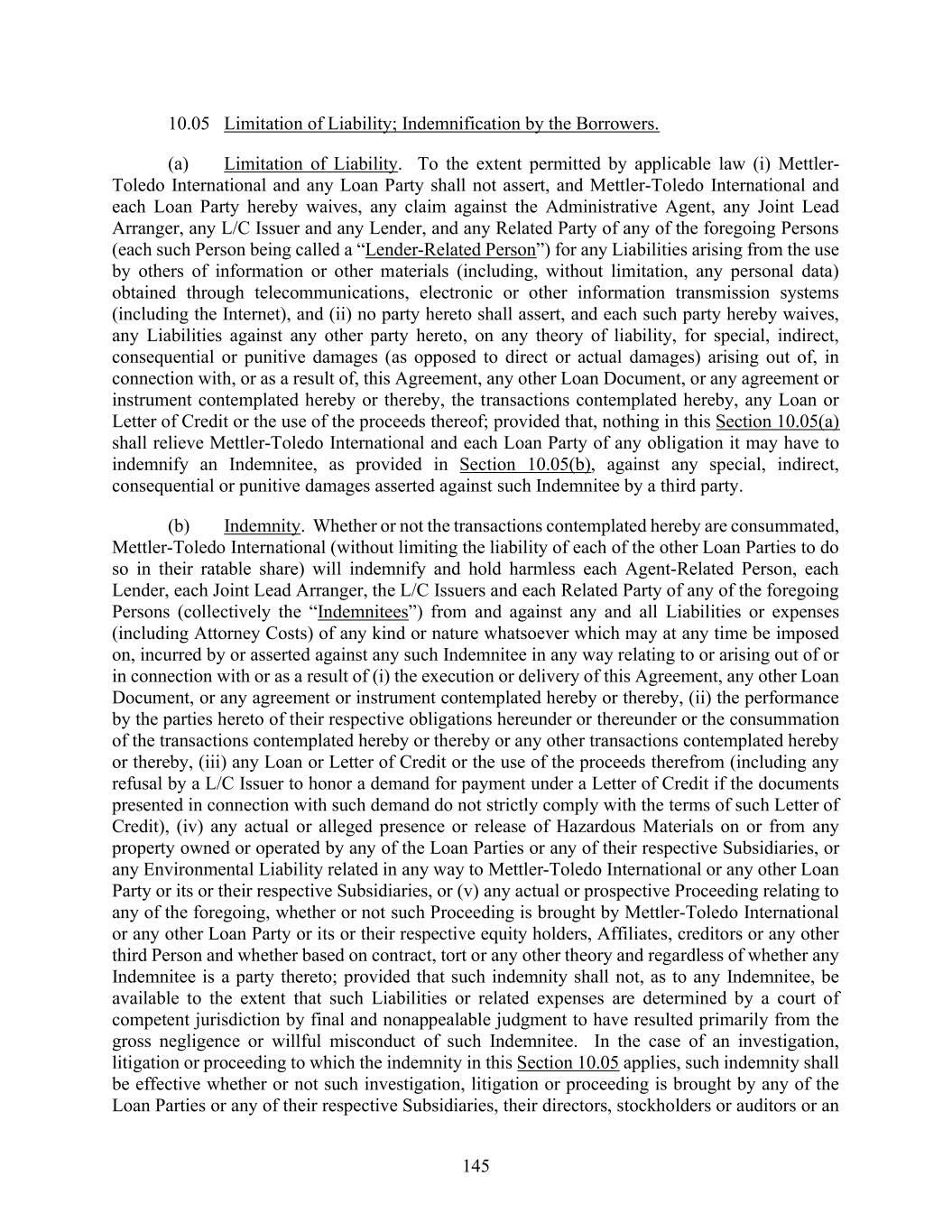 145 10.05 Limitation of Liability; Indemnification by the Borrowers. (a) Limitation of Liability. To the extent permitted by applicable law (i) Mettler- Toledo International and any Loan Party shall not assert, and Mettler-Toledo International and each Loan Party hereby waives, any claim against the Administrative Agent, any Joint Lead Arranger, any L/C Issuer and any Lender, and any Related Party of any of the foregoing Persons (each such Person being called a “Lender-Related Person”) for any Liabilities arising from the use by others of information or other materials (including, without limitation, any personal data) obtained through telecommunications, electronic or other information transmission systems (including the Internet), and (ii) no party hereto shall assert, and each such party hereby waives, any Liabilities against any other party hereto, on any theory of liability, for special, indirect, consequential or punitive damages (as opposed to direct or actual damages) arising out of, in connection with, or as a result of, this Agreement, any other Loan Document, or any agreement or instrument contemplated hereby or thereby, the transactions contemplated hereby, any Loan or Letter of Credit or the use of the proceeds thereof; provided that, nothing in this Section 10.05(a) shall relieve Mettler-Toledo International and each Loan Party of any obligation it may have to indemnify an Indemnitee, as provided in Section 10.05(b), against any special, indirect, consequential or punitive damages asserted against such Indemnitee by a third party. (b) Indemnity. Whether or not the transactions contemplated hereby are consummated, Mettler-Toledo International (without limiting the liability of each of the other Loan Parties to do so in their ratable share) will indemnify and hold harmless each Agent-Related Person, each Lender, each Joint Lead Arranger, the L/C Issuers and each Related Party of any of the foregoing Persons (collectively the “Indemnitees”) from and against any and all Liabilities or expenses (including Attorney Costs) of any kind or nature whatsoever which may at any time be imposed on, incurred by or asserted against any such Indemnitee in any way relating to or arising out of or in connection with or as a result of (i) the execution or delivery of this Agreement, any other Loan Document, or any agreement or instrument contemplated hereby or thereby, (ii) the performance by the parties hereto of their respective obligations hereunder or thereunder or the consummation of the transactions contemplated hereby or thereby or any other transactions contemplated hereby or thereby, (iii) any Loan or Letter of Credit or the use of the proceeds therefrom (including any refusal by a L/C Issuer to honor a demand for payment under a Letter of Credit if the documents presented in connection with such demand do not strictly comply with the terms of such Letter of Credit), (iv) any actual or alleged presence or release of Hazardous Materials on or from any property owned or operated by any of the Loan Parties or any of their respective Subsidiaries, or any Environmental Liability related in any way to Mettler-Toledo International or any other Loan Party or its or their respective Subsidiaries, or (v) any actual or prospective Proceeding relating to any of the foregoing, whether or not such Proceeding is brought by Mettler-Toledo International or any other Loan Party or its or their respective equity holders, Affiliates, creditors or any other third Person and whether based on contract, tort or any other theory and regardless of whether any Indemnitee is a party thereto; provided that such indemnity shall not, as to any Indemnitee, be available to the extent that such Liabilities or related expenses are determined by a court of competent jurisdiction by final and nonappealable judgment to have resulted primarily from the gross negligence or willful misconduct of such Indemnitee. In the case of an investigation, litigation or proceeding to which the indemnity in this Section 10.05 applies, such indemnity shall be effective whether or not such investigation, litigation or proceeding is brought by any of the Loan Parties or any of their respective Subsidiaries, their directors, stockholders or auditors or an