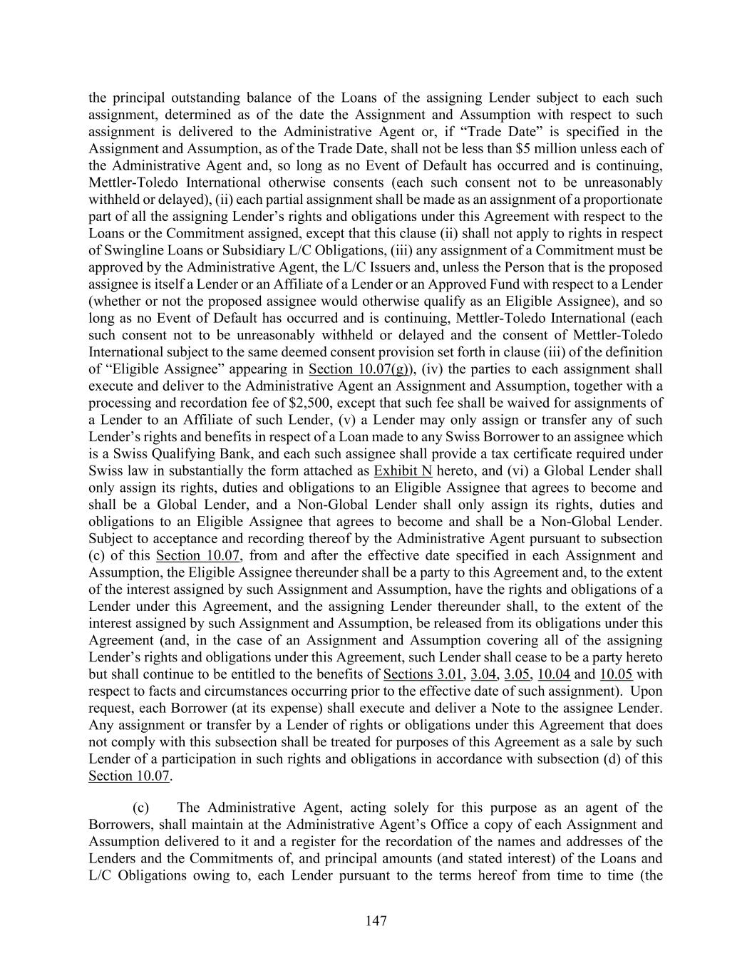 147 the principal outstanding balance of the Loans of the assigning Lender subject to each such assignment, determined as of the date the Assignment and Assumption with respect to such assignment is delivered to the Administrative Agent or, if “Trade Date” is specified in the Assignment and Assumption, as of the Trade Date, shall not be less than $5 million unless each of the Administrative Agent and, so long as no Event of Default has occurred and is continuing, Mettler-Toledo International otherwise consents (each such consent not to be unreasonably withheld or delayed), (ii) each partial assignment shall be made as an assignment of a proportionate part of all the assigning Lender’s rights and obligations under this Agreement with respect to the Loans or the Commitment assigned, except that this clause (ii) shall not apply to rights in respect of Swingline Loans or Subsidiary L/C Obligations, (iii) any assignment of a Commitment must be approved by the Administrative Agent, the L/C Issuers and, unless the Person that is the proposed assignee is itself a Lender or an Affiliate of a Lender or an Approved Fund with respect to a Lender (whether or not the proposed assignee would otherwise qualify as an Eligible Assignee), and so long as no Event of Default has occurred and is continuing, Mettler-Toledo International (each such consent not to be unreasonably withheld or delayed and the consent of Mettler-Toledo International subject to the same deemed consent provision set forth in clause (iii) of the definition of “Eligible Assignee” appearing in Section 10.07(g)), (iv) the parties to each assignment shall execute and deliver to the Administrative Agent an Assignment and Assumption, together with a processing and recordation fee of $2,500, except that such fee shall be waived for assignments of a Lender to an Affiliate of such Lender, (v) a Lender may only assign or transfer any of such Lender’s rights and benefits in respect of a Loan made to any Swiss Borrower to an assignee which is a Swiss Qualifying Bank, and each such assignee shall provide a tax certificate required under Swiss law in substantially the form attached as Exhibit N hereto, and (vi) a Global Lender shall only assign its rights, duties and obligations to an Eligible Assignee that agrees to become and shall be a Global Lender, and a Non-Global Lender shall only assign its rights, duties and obligations to an Eligible Assignee that agrees to become and shall be a Non-Global Lender. Subject to acceptance and recording thereof by the Administrative Agent pursuant to subsection (c) of this Section 10.07, from and after the effective date specified in each Assignment and Assumption, the Eligible Assignee thereunder shall be a party to this Agreement and, to the extent of the interest assigned by such Assignment and Assumption, have the rights and obligations of a Lender under this Agreement, and the assigning Lender thereunder shall, to the extent of the interest assigned by such Assignment and Assumption, be released from its obligations under this Agreement (and, in the case of an Assignment and Assumption covering all of the assigning Lender’s rights and obligations under this Agreement, such Lender shall cease to be a party hereto but shall continue to be entitled to the benefits of Sections 3.01, 3.04, 3.05, 10.04 and 10.05 with respect to facts and circumstances occurring prior to the effective date of such assignment). Upon request, each Borrower (at its expense) shall execute and deliver a Note to the assignee Lender. Any assignment or transfer by a Lender of rights or obligations under this Agreement that does not comply with this subsection shall be treated for purposes of this Agreement as a sale by such Lender of a participation in such rights and obligations in accordance with subsection (d) of this Section 10.07. (c) The Administrative Agent, acting solely for this purpose as an agent of the Borrowers, shall maintain at the Administrative Agent’s Office a copy of each Assignment and Assumption delivered to it and a register for the recordation of the names and addresses of the Lenders and the Commitments of, and principal amounts (and stated interest) of the Loans and L/C Obligations owing to, each Lender pursuant to the terms hereof from time to time (the