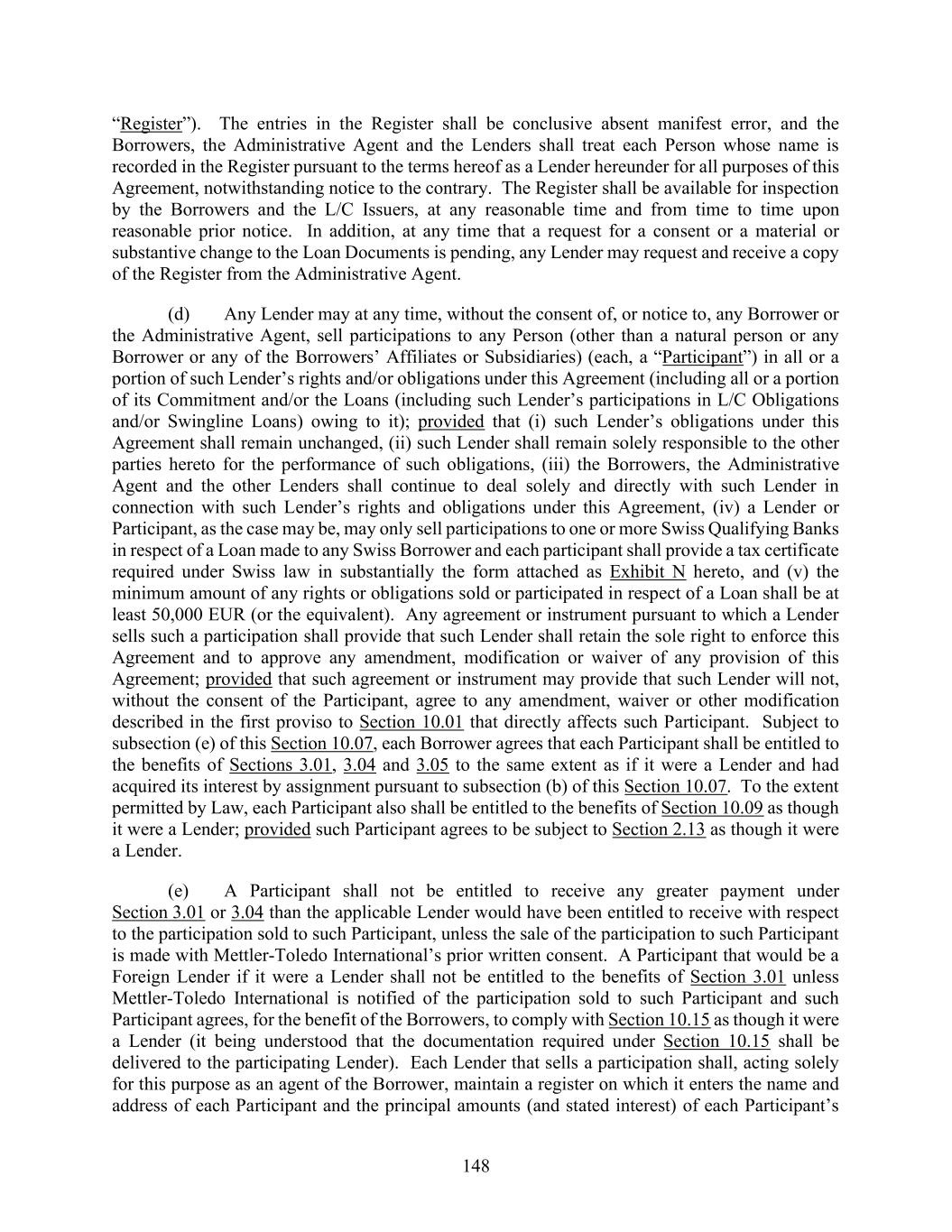148 “Register”). The entries in the Register shall be conclusive absent manifest error, and the Borrowers, the Administrative Agent and the Lenders shall treat each Person whose name is recorded in the Register pursuant to the terms hereof as a Lender hereunder for all purposes of this Agreement, notwithstanding notice to the contrary. The Register shall be available for inspection by the Borrowers and the L/C Issuers, at any reasonable time and from time to time upon reasonable prior notice. In addition, at any time that a request for a consent or a material or substantive change to the Loan Documents is pending, any Lender may request and receive a copy of the Register from the Administrative Agent. (d) Any Lender may at any time, without the consent of, or notice to, any Borrower or the Administrative Agent, sell participations to any Person (other than a natural person or any Borrower or any of the Borrowers’ Affiliates or Subsidiaries) (each, a “Participant”) in all or a portion of such Lender’s rights and/or obligations under this Agreement (including all or a portion of its Commitment and/or the Loans (including such Lender’s participations in L/C Obligations and/or Swingline Loans) owing to it); provided that (i) such Lender’s obligations under this Agreement shall remain unchanged, (ii) such Lender shall remain solely responsible to the other parties hereto for the performance of such obligations, (iii) the Borrowers, the Administrative Agent and the other Lenders shall continue to deal solely and directly with such Lender in connection with such Lender’s rights and obligations under this Agreement, (iv) a Lender or Participant, as the case may be, may only sell participations to one or more Swiss Qualifying Banks in respect of a Loan made to any Swiss Borrower and each participant shall provide a tax certificate required under Swiss law in substantially the form attached as Exhibit N hereto, and (v) the minimum amount of any rights or obligations sold or participated in respect of a Loan shall be at least 50,000 EUR (or the equivalent). Any agreement or instrument pursuant to which a Lender sells such a participation shall provide that such Lender shall retain the sole right to enforce this Agreement and to approve any amendment, modification or waiver of any provision of this Agreement; provided that such agreement or instrument may provide that such Lender will not, without the consent of the Participant, agree to any amendment, waiver or other modification described in the first proviso to Section 10.01 that directly affects such Participant. Subject to subsection (e) of this Section 10.07, each Borrower agrees that each Participant shall be entitled to the benefits of Sections 3.01, 3.04 and 3.05 to the same extent as if it were a Lender and had acquired its interest by assignment pursuant to subsection (b) of this Section 10.07. To the extent permitted by Law, each Participant also shall be entitled to the benefits of Section 10.09 as though it were a Lender; provided such Participant agrees to be subject to Section 2.13 as though it were a Lender. (e) A Participant shall not be entitled to receive any greater payment under Section 3.01 or 3.04 than the applicable Lender would have been entitled to receive with respect to the participation sold to such Participant, unless the sale of the participation to such Participant is made with Mettler-Toledo International’s prior written consent. A Participant that would be a Foreign Lender if it were a Lender shall not be entitled to the benefits of Section 3.01 unless Mettler-Toledo International is notified of the participation sold to such Participant and such Participant agrees, for the benefit of the Borrowers, to comply with Section 10.15 as though it were a Lender (it being understood that the documentation required under Section 10.15 shall be delivered to the participating Lender). Each Lender that sells a participation shall, acting solely for this purpose as an agent of the Borrower, maintain a register on which it enters the name and address of each Participant and the principal amounts (and stated interest) of each Participant’s