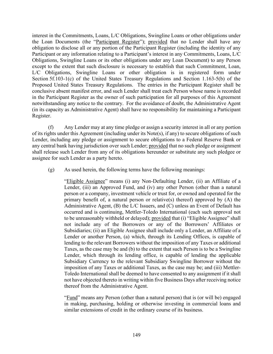 149 interest in the Commitments, Loans, L/C Obligations, Swingline Loans or other obligations under the Loan Documents (the “Participant Register”); provided that no Lender shall have any obligation to disclose all or any portion of the Participant Register (including the identity of any Participant or any information relating to a Participant’s interest in any Commitments, Loans, L/C Obligations, Swingline Loans or its other obligations under any Loan Document) to any Person except to the extent that such disclosure is necessary to establish that such Commitment, Loan, L/C Obligations, Swingline Loans or other obligation is in registered form under Section 5f.103-1(c) of the United States Treasury Regulations and Section 1.163-5(b) of the Proposed United States Treasury Regulations. The entries in the Participant Register shall be conclusive absent manifest error, and such Lender shall treat each Person whose name is recorded in the Participant Register as the owner of such participation for all purposes of this Agreement notwithstanding any notice to the contrary. For the avoidance of doubt, the Administrative Agent (in its capacity as Administrative Agent) shall have no responsibility for maintaining a Participant Register. (f) Any Lender may at any time pledge or assign a security interest in all or any portion of its rights under this Agreement (including under its Note(s), if any) to secure obligations of such Lender, including any pledge or assignment to secure obligations to a Federal Reserve Bank or any central bank having jurisdiction over such Lender; provided that no such pledge or assignment shall release such Lender from any of its obligations hereunder or substitute any such pledgee or assignee for such Lender as a party hereto. (g) As used herein, the following terms have the following meanings: “Eligible Assignee” means (i) any Non-Defaulting Lender, (ii) an Affiliate of a Lender, (iii) an Approved Fund, and (iv) any other Person (other than a natural person or a company, investment vehicle or trust for, or owned and operated for the primary benefit of, a natural person or relative(s) thereof) approved by (A) the Administrative Agent, (B) the L/C Issuers, and (C) unless an Event of Default has occurred and is continuing, Mettler-Toledo International (each such approval not to be unreasonably withheld or delayed); provided that (i) “Eligible Assignee” shall not include any of the Borrowers or any of the Borrowers’ Affiliates or Subsidiaries; (ii) an Eligible Assignee shall include only a Lender, an Affiliate of a Lender or another Person, (a) which, through its Lending Offices, is capable of lending to the relevant Borrowers without the imposition of any Taxes or additional Taxes, as the case may be and (b) to the extent that such Person is to be a Swingline Lender, which through its lending office, is capable of lending the applicable Subsidiary Currency to the relevant Subsidiary Swingline Borrower without the imposition of any Taxes or additional Taxes, as the case may be; and (iii) Mettler- Toledo International shall be deemed to have consented to any assignment if it shall not have objected thereto in writing within five Business Days after receiving notice thereof from the Administrative Agent. “Fund” means any Person (other than a natural person) that is (or will be) engaged in making, purchasing, holding or otherwise investing in commercial loans and similar extensions of credit in the ordinary course of its business.