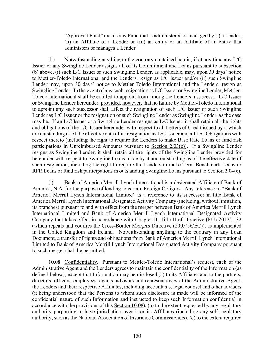150 “Approved Fund” means any Fund that is administered or managed by (i) a Lender, (ii) an Affiliate of a Lender or (iii) an entity or an Affiliate of an entity that administers or manages a Lender. (h) Notwithstanding anything to the contrary contained herein, if at any time any L/C Issuer or any Swingline Lender assigns all of its Commitment and Loans pursuant to subsection (b) above, (i) such L/C Issuer or such Swingline Lender, as applicable, may, upon 30 days’ notice to Mettler-Toledo International and the Lenders, resign as L/C Issuer and/or (ii) such Swingline Lender may, upon 30 days’ notice to Mettler-Toledo International and the Lenders, resign as Swingline Lender. In the event of any such resignation as L/C Issuer or Swingline Lender, Mettler- Toledo International shall be entitled to appoint from among the Lenders a successor L/C Issuer or Swingline Lender hereunder; provided, however, that no failure by Mettler-Toledo International to appoint any such successor shall affect the resignation of such L/C Issuer or such Swingline Lender as L/C Issuer or the resignation of such Swingline Lender as Swingline Lender, as the case may be. If an L/C Issuer or a Swingline Lender resigns as L/C Issuer, it shall retain all the rights and obligations of the L/C Issuer hereunder with respect to all Letters of Credit issued by it which are outstanding as of the effective date of its resignation as L/C Issuer and all L/C Obligations with respect thereto (including the right to require the Lenders to make Base Rate Loans or fund risk participations in Unreimbursed Amounts pursuant to Section 2.03(c)). If a Swingline Lender resigns as Swingline Lender, it shall retain all the rights of the Swingline Lender provided for hereunder with respect to Swingline Loans made by it and outstanding as of the effective date of such resignation, including the right to require the Lenders to make Term Benchmark Loans or RFR Loans or fund risk participations in outstanding Swingline Loans pursuant to Section 2.04(e). (i) Bank of America Merrill Lynch International is a designated Affiliate of Bank of America, N.A. for the purpose of lending to certain Foreign Obligors. Any reference to “Bank of America Merrill Lynch International Limited” is a reference to its successor in title Bank of America Merrill Lynch International Designated Activity Company (including, without limitation, its branches) pursuant to and with effect from the merger between Bank of America Merrill Lynch International Limited and Bank of America Merrill Lynch International Designated Activity Company that takes effect in accordance with Chapter II, Title II of Directive (EU) 2017/1132 (which repeals and codifies the Cross-Border Mergers Directive (2005/56/EC)), as implemented in the United Kingdom and Ireland. Notwithstanding anything to the contrary in any Loan Document, a transfer of rights and obligations from Bank of America Merrill Lynch International Limited to Bank of America Merrill Lynch International Designated Activity Company pursuant to such merger shall be permitted. 10.08 Confidentiality. Pursuant to Mettler-Toledo International’s request, each of the Administrative Agent and the Lenders agrees to maintain the confidentiality of the Information (as defined below), except that Information may be disclosed (a) to its Affiliates and to the partners, directors, officers, employees, agents, advisors and representatives of the Administrative Agent, the Lenders and their respective Affiliates, including accountants, legal counsel and other advisors (it being understood that the Persons to whom such disclosure is made will be informed of the confidential nature of such Information and instructed to keep such Information confidential in accordance with the provisions of this Section 10.08), (b) to the extent requested by any regulatory authority purporting to have jurisdiction over it or its Affiliates (including any self-regulatory authority, such as the National Association of Insurance Commissioners), (c) to the extent required
