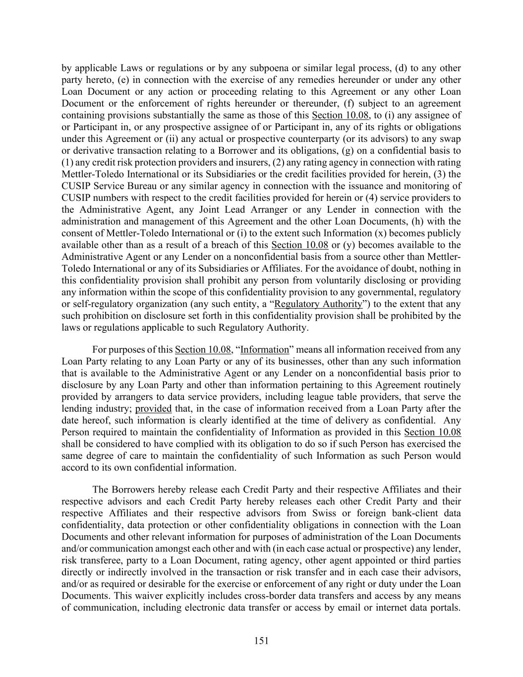 151 by applicable Laws or regulations or by any subpoena or similar legal process, (d) to any other party hereto, (e) in connection with the exercise of any remedies hereunder or under any other Loan Document or any action or proceeding relating to this Agreement or any other Loan Document or the enforcement of rights hereunder or thereunder, (f) subject to an agreement containing provisions substantially the same as those of this Section 10.08, to (i) any assignee of or Participant in, or any prospective assignee of or Participant in, any of its rights or obligations under this Agreement or (ii) any actual or prospective counterparty (or its advisors) to any swap or derivative transaction relating to a Borrower and its obligations, (g) on a confidential basis to (1) any credit risk protection providers and insurers, (2) any rating agency in connection with rating Mettler-Toledo International or its Subsidiaries or the credit facilities provided for herein, (3) the CUSIP Service Bureau or any similar agency in connection with the issuance and monitoring of CUSIP numbers with respect to the credit facilities provided for herein or (4) service providers to the Administrative Agent, any Joint Lead Arranger or any Lender in connection with the administration and management of this Agreement and the other Loan Documents, (h) with the consent of Mettler-Toledo International or (i) to the extent such Information (x) becomes publicly available other than as a result of a breach of this Section 10.08 or (y) becomes available to the Administrative Agent or any Lender on a nonconfidential basis from a source other than Mettler- Toledo International or any of its Subsidiaries or Affiliates. For the avoidance of doubt, nothing in this confidentiality provision shall prohibit any person from voluntarily disclosing or providing any information within the scope of this confidentiality provision to any governmental, regulatory or self-regulatory organization (any such entity, a “Regulatory Authority”) to the extent that any such prohibition on disclosure set forth in this confidentiality provision shall be prohibited by the laws or regulations applicable to such Regulatory Authority. For purposes of this Section 10.08, “Information” means all information received from any Loan Party relating to any Loan Party or any of its businesses, other than any such information that is available to the Administrative Agent or any Lender on a nonconfidential basis prior to disclosure by any Loan Party and other than information pertaining to this Agreement routinely provided by arrangers to data service providers, including league table providers, that serve the lending industry; provided that, in the case of information received from a Loan Party after the date hereof, such information is clearly identified at the time of delivery as confidential. Any Person required to maintain the confidentiality of Information as provided in this Section 10.08 shall be considered to have complied with its obligation to do so if such Person has exercised the same degree of care to maintain the confidentiality of such Information as such Person would accord to its own confidential information. The Borrowers hereby release each Credit Party and their respective Affiliates and their respective advisors and each Credit Party hereby releases each other Credit Party and their respective Affiliates and their respective advisors from Swiss or foreign bank-client data confidentiality, data protection or other confidentiality obligations in connection with the Loan Documents and other relevant information for purposes of administration of the Loan Documents and/or communication amongst each other and with (in each case actual or prospective) any lender, risk transferee, party to a Loan Document, rating agency, other agent appointed or third parties directly or indirectly involved in the transaction or risk transfer and in each case their advisors, and/or as required or desirable for the exercise or enforcement of any right or duty under the Loan Documents. This waiver explicitly includes cross-border data transfers and access by any means of communication, including electronic data transfer or access by email or internet data portals.