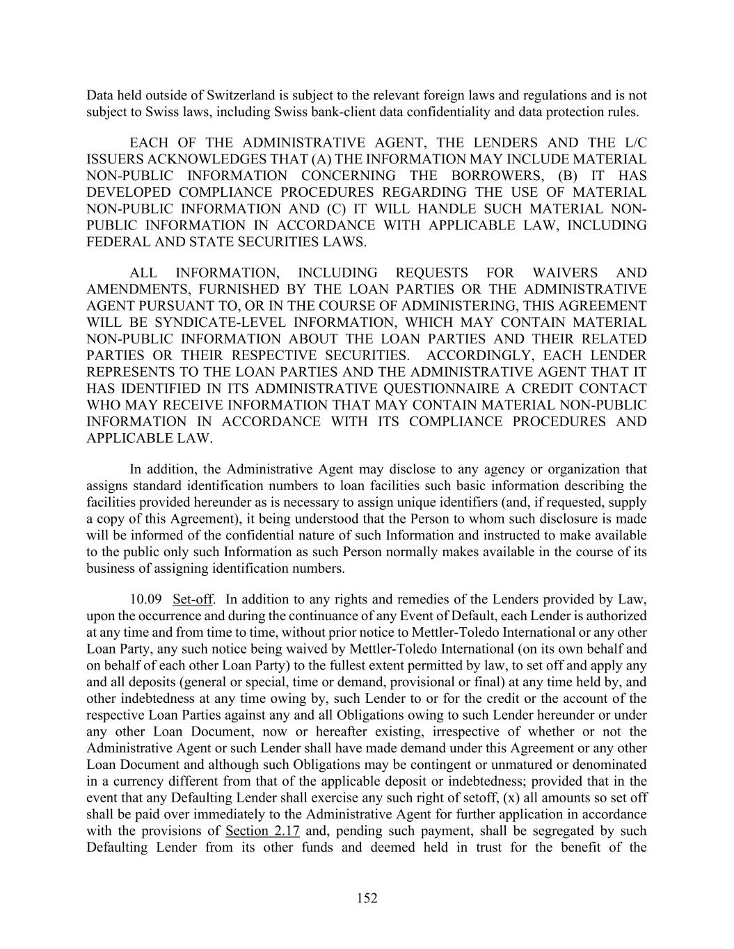 152 Data held outside of Switzerland is subject to the relevant foreign laws and regulations and is not subject to Swiss laws, including Swiss bank-client data confidentiality and data protection rules. EACH OF THE ADMINISTRATIVE AGENT, THE LENDERS AND THE L/C ISSUERS ACKNOWLEDGES THAT (A) THE INFORMATION MAY INCLUDE MATERIAL NON-PUBLIC INFORMATION CONCERNING THE BORROWERS, (B) IT HAS DEVELOPED COMPLIANCE PROCEDURES REGARDING THE USE OF MATERIAL NON-PUBLIC INFORMATION AND (C) IT WILL HANDLE SUCH MATERIAL NON- PUBLIC INFORMATION IN ACCORDANCE WITH APPLICABLE LAW, INCLUDING FEDERAL AND STATE SECURITIES LAWS. ALL INFORMATION, INCLUDING REQUESTS FOR WAIVERS AND AMENDMENTS, FURNISHED BY THE LOAN PARTIES OR THE ADMINISTRATIVE AGENT PURSUANT TO, OR IN THE COURSE OF ADMINISTERING, THIS AGREEMENT WILL BE SYNDICATE-LEVEL INFORMATION, WHICH MAY CONTAIN MATERIAL NON-PUBLIC INFORMATION ABOUT THE LOAN PARTIES AND THEIR RELATED PARTIES OR THEIR RESPECTIVE SECURITIES. ACCORDINGLY, EACH LENDER REPRESENTS TO THE LOAN PARTIES AND THE ADMINISTRATIVE AGENT THAT IT HAS IDENTIFIED IN ITS ADMINISTRATIVE QUESTIONNAIRE A CREDIT CONTACT WHO MAY RECEIVE INFORMATION THAT MAY CONTAIN MATERIAL NON-PUBLIC INFORMATION IN ACCORDANCE WITH ITS COMPLIANCE PROCEDURES AND APPLICABLE LAW. In addition, the Administrative Agent may disclose to any agency or organization that assigns standard identification numbers to loan facilities such basic information describing the facilities provided hereunder as is necessary to assign unique identifiers (and, if requested, supply a copy of this Agreement), it being understood that the Person to whom such disclosure is made will be informed of the confidential nature of such Information and instructed to make available to the public only such Information as such Person normally makes available in the course of its business of assigning identification numbers. 10.09 Set-off. In addition to any rights and remedies of the Lenders provided by Law, upon the occurrence and during the continuance of any Event of Default, each Lender is authorized at any time and from time to time, without prior notice to Mettler-Toledo International or any other Loan Party, any such notice being waived by Mettler-Toledo International (on its own behalf and on behalf of each other Loan Party) to the fullest extent permitted by law, to set off and apply any and all deposits (general or special, time or demand, provisional or final) at any time held by, and other indebtedness at any time owing by, such Lender to or for the credit or the account of the respective Loan Parties against any and all Obligations owing to such Lender hereunder or under any other Loan Document, now or hereafter existing, irrespective of whether or not the Administrative Agent or such Lender shall have made demand under this Agreement or any other Loan Document and although such Obligations may be contingent or unmatured or denominated in a currency different from that of the applicable deposit or indebtedness; provided that in the event that any Defaulting Lender shall exercise any such right of setoff, (x) all amounts so set off shall be paid over immediately to the Administrative Agent for further application in accordance with the provisions of Section 2.17 and, pending such payment, shall be segregated by such Defaulting Lender from its other funds and deemed held in trust for the benefit of the
