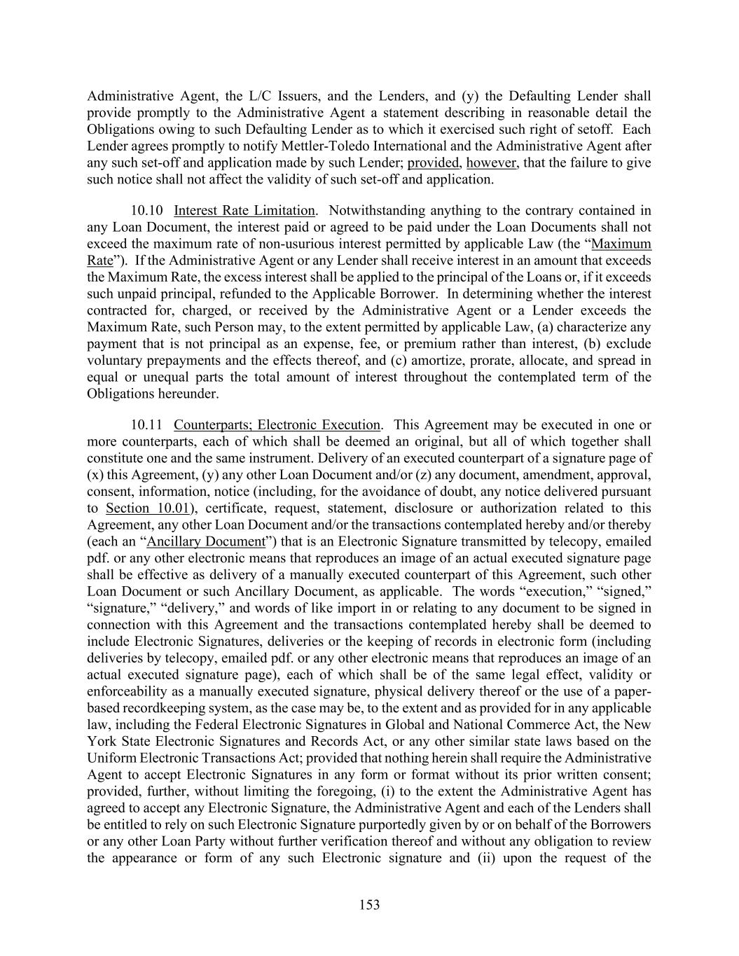 153 Administrative Agent, the L/C Issuers, and the Lenders, and (y) the Defaulting Lender shall provide promptly to the Administrative Agent a statement describing in reasonable detail the Obligations owing to such Defaulting Lender as to which it exercised such right of setoff. Each Lender agrees promptly to notify Mettler-Toledo International and the Administrative Agent after any such set-off and application made by such Lender; provided, however, that the failure to give such notice shall not affect the validity of such set-off and application. 10.10 Interest Rate Limitation. Notwithstanding anything to the contrary contained in any Loan Document, the interest paid or agreed to be paid under the Loan Documents shall not exceed the maximum rate of non-usurious interest permitted by applicable Law (the “Maximum Rate”). If the Administrative Agent or any Lender shall receive interest in an amount that exceeds the Maximum Rate, the excess interest shall be applied to the principal of the Loans or, if it exceeds such unpaid principal, refunded to the Applicable Borrower. In determining whether the interest contracted for, charged, or received by the Administrative Agent or a Lender exceeds the Maximum Rate, such Person may, to the extent permitted by applicable Law, (a) characterize any payment that is not principal as an expense, fee, or premium rather than interest, (b) exclude voluntary prepayments and the effects thereof, and (c) amortize, prorate, allocate, and spread in equal or unequal parts the total amount of interest throughout the contemplated term of the Obligations hereunder. 10.11 Counterparts; Electronic Execution. This Agreement may be executed in one or more counterparts, each of which shall be deemed an original, but all of which together shall constitute one and the same instrument. Delivery of an executed counterpart of a signature page of (x) this Agreement, (y) any other Loan Document and/or (z) any document, amendment, approval, consent, information, notice (including, for the avoidance of doubt, any notice delivered pursuant to Section 10.01), certificate, request, statement, disclosure or authorization related to this Agreement, any other Loan Document and/or the transactions contemplated hereby and/or thereby (each an “Ancillary Document”) that is an Electronic Signature transmitted by telecopy, emailed pdf. or any other electronic means that reproduces an image of an actual executed signature page shall be effective as delivery of a manually executed counterpart of this Agreement, such other Loan Document or such Ancillary Document, as applicable. The words “execution,” “signed,” “signature,” “delivery,” and words of like import in or relating to any document to be signed in connection with this Agreement and the transactions contemplated hereby shall be deemed to include Electronic Signatures, deliveries or the keeping of records in electronic form (including deliveries by telecopy, emailed pdf. or any other electronic means that reproduces an image of an actual executed signature page), each of which shall be of the same legal effect, validity or enforceability as a manually executed signature, physical delivery thereof or the use of a paper- based recordkeeping system, as the case may be, to the extent and as provided for in any applicable law, including the Federal Electronic Signatures in Global and National Commerce Act, the New York State Electronic Signatures and Records Act, or any other similar state laws based on the Uniform Electronic Transactions Act; provided that nothing herein shall require the Administrative Agent to accept Electronic Signatures in any form or format without its prior written consent; provided, further, without limiting the foregoing, (i) to the extent the Administrative Agent has agreed to accept any Electronic Signature, the Administrative Agent and each of the Lenders shall be entitled to rely on such Electronic Signature purportedly given by or on behalf of the Borrowers or any other Loan Party without further verification thereof and without any obligation to review the appearance or form of any such Electronic signature and (ii) upon the request of the