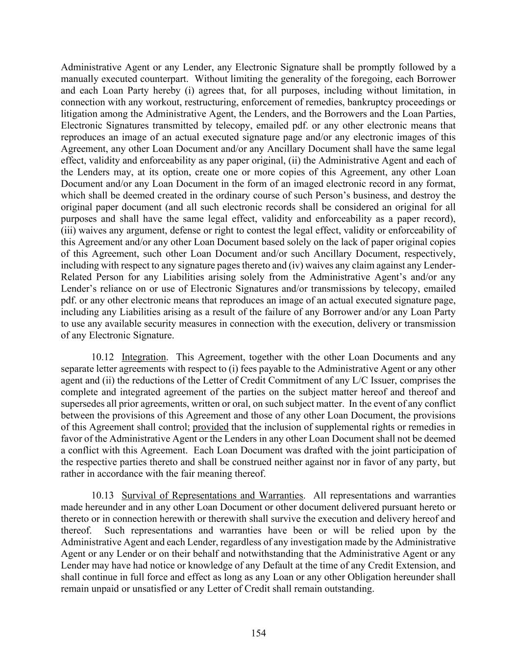154 Administrative Agent or any Lender, any Electronic Signature shall be promptly followed by a manually executed counterpart. Without limiting the generality of the foregoing, each Borrower and each Loan Party hereby (i) agrees that, for all purposes, including without limitation, in connection with any workout, restructuring, enforcement of remedies, bankruptcy proceedings or litigation among the Administrative Agent, the Lenders, and the Borrowers and the Loan Parties, Electronic Signatures transmitted by telecopy, emailed pdf. or any other electronic means that reproduces an image of an actual executed signature page and/or any electronic images of this Agreement, any other Loan Document and/or any Ancillary Document shall have the same legal effect, validity and enforceability as any paper original, (ii) the Administrative Agent and each of the Lenders may, at its option, create one or more copies of this Agreement, any other Loan Document and/or any Loan Document in the form of an imaged electronic record in any format, which shall be deemed created in the ordinary course of such Person’s business, and destroy the original paper document (and all such electronic records shall be considered an original for all purposes and shall have the same legal effect, validity and enforceability as a paper record), (iii) waives any argument, defense or right to contest the legal effect, validity or enforceability of this Agreement and/or any other Loan Document based solely on the lack of paper original copies of this Agreement, such other Loan Document and/or such Ancillary Document, respectively, including with respect to any signature pages thereto and (iv) waives any claim against any Lender- Related Person for any Liabilities arising solely from the Administrative Agent’s and/or any Lender’s reliance on or use of Electronic Signatures and/or transmissions by telecopy, emailed pdf. or any other electronic means that reproduces an image of an actual executed signature page, including any Liabilities arising as a result of the failure of any Borrower and/or any Loan Party to use any available security measures in connection with the execution, delivery or transmission of any Electronic Signature. 10.12 Integration. This Agreement, together with the other Loan Documents and any separate letter agreements with respect to (i) fees payable to the Administrative Agent or any other agent and (ii) the reductions of the Letter of Credit Commitment of any L/C Issuer, comprises the complete and integrated agreement of the parties on the subject matter hereof and thereof and supersedes all prior agreements, written or oral, on such subject matter. In the event of any conflict between the provisions of this Agreement and those of any other Loan Document, the provisions of this Agreement shall control; provided that the inclusion of supplemental rights or remedies in favor of the Administrative Agent or the Lenders in any other Loan Document shall not be deemed a conflict with this Agreement. Each Loan Document was drafted with the joint participation of the respective parties thereto and shall be construed neither against nor in favor of any party, but rather in accordance with the fair meaning thereof. 10.13 Survival of Representations and Warranties. All representations and warranties made hereunder and in any other Loan Document or other document delivered pursuant hereto or thereto or in connection herewith or therewith shall survive the execution and delivery hereof and thereof. Such representations and warranties have been or will be relied upon by the Administrative Agent and each Lender, regardless of any investigation made by the Administrative Agent or any Lender or on their behalf and notwithstanding that the Administrative Agent or any Lender may have had notice or knowledge of any Default at the time of any Credit Extension, and shall continue in full force and effect as long as any Loan or any other Obligation hereunder shall remain unpaid or unsatisfied or any Letter of Credit shall remain outstanding.