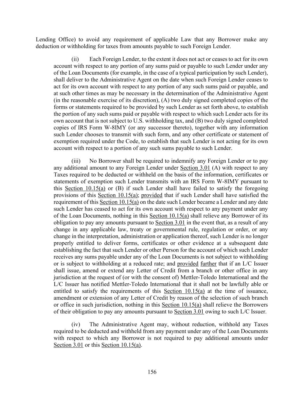 156 Lending Office) to avoid any requirement of applicable Law that any Borrower make any deduction or withholding for taxes from amounts payable to such Foreign Lender. (ii) Each Foreign Lender, to the extent it does not act or ceases to act for its own account with respect to any portion of any sums paid or payable to such Lender under any of the Loan Documents (for example, in the case of a typical participation by such Lender), shall deliver to the Administrative Agent on the date when such Foreign Lender ceases to act for its own account with respect to any portion of any such sums paid or payable, and at such other times as may be necessary in the determination of the Administrative Agent (in the reasonable exercise of its discretion), (A) two duly signed completed copies of the forms or statements required to be provided by such Lender as set forth above, to establish the portion of any such sums paid or payable with respect to which such Lender acts for its own account that is not subject to U.S. withholding tax, and (B) two duly signed completed copies of IRS Form W-8IMY (or any successor thereto), together with any information such Lender chooses to transmit with such form, and any other certificate or statement of exemption required under the Code, to establish that such Lender is not acting for its own account with respect to a portion of any such sums payable to such Lender. (iii) No Borrower shall be required to indemnify any Foreign Lender or to pay any additional amount to any Foreign Lender under Section 3.01 (A) with respect to any Taxes required to be deducted or withheld on the basis of the information, certificates or statements of exemption such Lender transmits with an IRS Form W-8IMY pursuant to this Section 10.15(a) or (B) if such Lender shall have failed to satisfy the foregoing provisions of this Section 10.15(a); provided that if such Lender shall have satisfied the requirement of this Section 10.15(a) on the date such Lender became a Lender and any date such Lender has ceased to act for its own account with respect to any payment under any of the Loan Documents, nothing in this Section 10.15(a) shall relieve any Borrower of its obligation to pay any amounts pursuant to Section 3.01 in the event that, as a result of any change in any applicable law, treaty or governmental rule, regulation or order, or any change in the interpretation, administration or application thereof, such Lender is no longer properly entitled to deliver forms, certificates or other evidence at a subsequent date establishing the fact that such Lender or other Person for the account of which such Lender receives any sums payable under any of the Loan Documents is not subject to withholding or is subject to withholding at a reduced rate; and provided further that if an L/C Issuer shall issue, amend or extend any Letter of Credit from a branch or other office in any jurisdiction at the request of (or with the consent of) Mettler-Toledo International and the L/C Issuer has notified Mettler-Toledo International that it shall not be lawfully able or entitled to satisfy the requirements of this Section 10.15(a) at the time of issuance, amendment or extension of any Letter of Credit by reason of the selection of such branch or office in such jurisdiction, nothing in this Section 10.15(a) shall relieve the Borrowers of their obligation to pay any amounts pursuant to Section 3.01 owing to such L/C Issuer. (iv) The Administrative Agent may, without reduction, withhold any Taxes required to be deducted and withheld from any payment under any of the Loan Documents with respect to which any Borrower is not required to pay additional amounts under Section 3.01 or this Section 10.15(a).