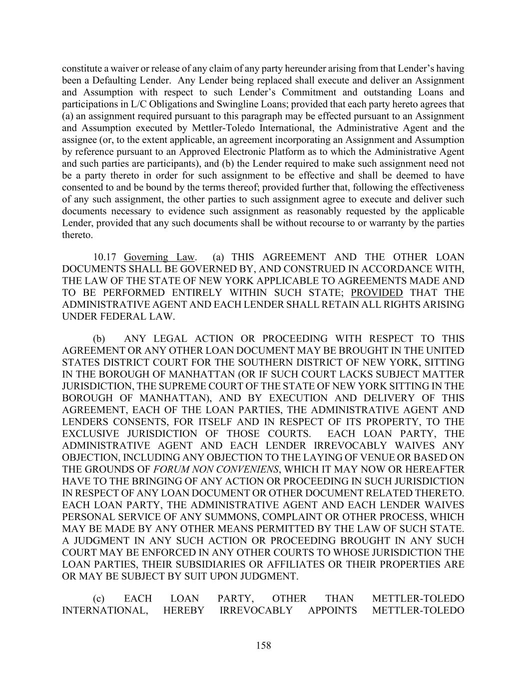 158 constitute a waiver or release of any claim of any party hereunder arising from that Lender’s having been a Defaulting Lender. Any Lender being replaced shall execute and deliver an Assignment and Assumption with respect to such Lender’s Commitment and outstanding Loans and participations in L/C Obligations and Swingline Loans; provided that each party hereto agrees that (a) an assignment required pursuant to this paragraph may be effected pursuant to an Assignment and Assumption executed by Mettler-Toledo International, the Administrative Agent and the assignee (or, to the extent applicable, an agreement incorporating an Assignment and Assumption by reference pursuant to an Approved Electronic Platform as to which the Administrative Agent and such parties are participants), and (b) the Lender required to make such assignment need not be a party thereto in order for such assignment to be effective and shall be deemed to have consented to and be bound by the terms thereof; provided further that, following the effectiveness of any such assignment, the other parties to such assignment agree to execute and deliver such documents necessary to evidence such assignment as reasonably requested by the applicable Lender, provided that any such documents shall be without recourse to or warranty by the parties thereto. 10.17 Governing Law. (a) THIS AGREEMENT AND THE OTHER LOAN DOCUMENTS SHALL BE GOVERNED BY, AND CONSTRUED IN ACCORDANCE WITH, THE LAW OF THE STATE OF NEW YORK APPLICABLE TO AGREEMENTS MADE AND TO BE PERFORMED ENTIRELY WITHIN SUCH STATE; PROVIDED THAT THE ADMINISTRATIVE AGENT AND EACH LENDER SHALL RETAIN ALL RIGHTS ARISING UNDER FEDERAL LAW. (b) ANY LEGAL ACTION OR PROCEEDING WITH RESPECT TO THIS AGREEMENT OR ANY OTHER LOAN DOCUMENT MAY BE BROUGHT IN THE UNITED STATES DISTRICT COURT FOR THE SOUTHERN DISTRICT OF NEW YORK, SITTING IN THE BOROUGH OF MANHATTAN (OR IF SUCH COURT LACKS SUBJECT MATTER JURISDICTION, THE SUPREME COURT OF THE STATE OF NEW YORK SITTING IN THE BOROUGH OF MANHATTAN), AND BY EXECUTION AND DELIVERY OF THIS AGREEMENT, EACH OF THE LOAN PARTIES, THE ADMINISTRATIVE AGENT AND LENDERS CONSENTS, FOR ITSELF AND IN RESPECT OF ITS PROPERTY, TO THE EXCLUSIVE JURISDICTION OF THOSE COURTS. EACH LOAN PARTY, THE ADMINISTRATIVE AGENT AND EACH LENDER IRREVOCABLY WAIVES ANY OBJECTION, INCLUDING ANY OBJECTION TO THE LAYING OF VENUE OR BASED ON THE GROUNDS OF FORUM NON CONVENIENS, WHICH IT MAY NOW OR HEREAFTER HAVE TO THE BRINGING OF ANY ACTION OR PROCEEDING IN SUCH JURISDICTION IN RESPECT OF ANY LOAN DOCUMENT OR OTHER DOCUMENT RELATED THERETO. EACH LOAN PARTY, THE ADMINISTRATIVE AGENT AND EACH LENDER WAIVES PERSONAL SERVICE OF ANY SUMMONS, COMPLAINT OR OTHER PROCESS, WHICH MAY BE MADE BY ANY OTHER MEANS PERMITTED BY THE LAW OF SUCH STATE. A JUDGMENT IN ANY SUCH ACTION OR PROCEEDING BROUGHT IN ANY SUCH COURT MAY BE ENFORCED IN ANY OTHER COURTS TO WHOSE JURISDICTION THE LOAN PARTIES, THEIR SUBSIDIARIES OR AFFILIATES OR THEIR PROPERTIES ARE OR MAY BE SUBJECT BY SUIT UPON JUDGMENT. (c) EACH LOAN PARTY, OTHER THAN METTLER-TOLEDO INTERNATIONAL, HEREBY IRREVOCABLY APPOINTS METTLER-TOLEDO
