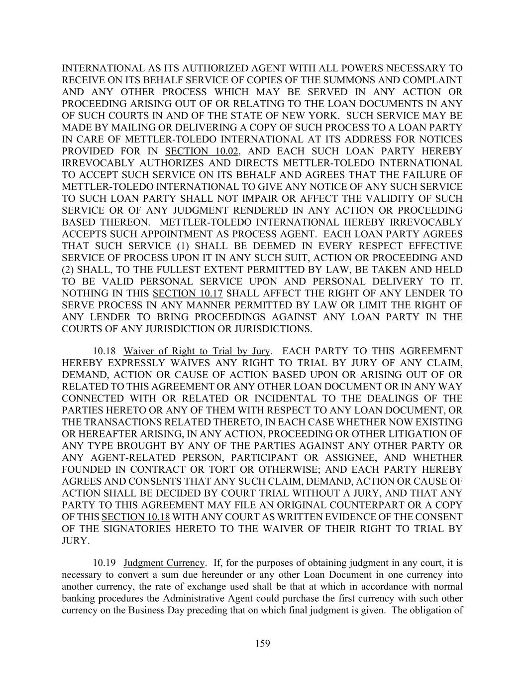 159 INTERNATIONAL AS ITS AUTHORIZED AGENT WITH ALL POWERS NECESSARY TO RECEIVE ON ITS BEHALF SERVICE OF COPIES OF THE SUMMONS AND COMPLAINT AND ANY OTHER PROCESS WHICH MAY BE SERVED IN ANY ACTION OR PROCEEDING ARISING OUT OF OR RELATING TO THE LOAN DOCUMENTS IN ANY OF SUCH COURTS IN AND OF THE STATE OF NEW YORK. SUCH SERVICE MAY BE MADE BY MAILING OR DELIVERING A COPY OF SUCH PROCESS TO A LOAN PARTY IN CARE OF METTLER-TOLEDO INTERNATIONAL AT ITS ADDRESS FOR NOTICES PROVIDED FOR IN SECTION 10.02, AND EACH SUCH LOAN PARTY HEREBY IRREVOCABLY AUTHORIZES AND DIRECTS METTLER-TOLEDO INTERNATIONAL TO ACCEPT SUCH SERVICE ON ITS BEHALF AND AGREES THAT THE FAILURE OF METTLER-TOLEDO INTERNATIONAL TO GIVE ANY NOTICE OF ANY SUCH SERVICE TO SUCH LOAN PARTY SHALL NOT IMPAIR OR AFFECT THE VALIDITY OF SUCH SERVICE OR OF ANY JUDGMENT RENDERED IN ANY ACTION OR PROCEEDING BASED THEREON. METTLER-TOLEDO INTERNATIONAL HEREBY IRREVOCABLY ACCEPTS SUCH APPOINTMENT AS PROCESS AGENT. EACH LOAN PARTY AGREES THAT SUCH SERVICE (1) SHALL BE DEEMED IN EVERY RESPECT EFFECTIVE SERVICE OF PROCESS UPON IT IN ANY SUCH SUIT, ACTION OR PROCEEDING AND (2) SHALL, TO THE FULLEST EXTENT PERMITTED BY LAW, BE TAKEN AND HELD TO BE VALID PERSONAL SERVICE UPON AND PERSONAL DELIVERY TO IT. NOTHING IN THIS SECTION 10.17 SHALL AFFECT THE RIGHT OF ANY LENDER TO SERVE PROCESS IN ANY MANNER PERMITTED BY LAW OR LIMIT THE RIGHT OF ANY LENDER TO BRING PROCEEDINGS AGAINST ANY LOAN PARTY IN THE COURTS OF ANY JURISDICTION OR JURISDICTIONS. 10.18 Waiver of Right to Trial by Jury. EACH PARTY TO THIS AGREEMENT HEREBY EXPRESSLY WAIVES ANY RIGHT TO TRIAL BY JURY OF ANY CLAIM, DEMAND, ACTION OR CAUSE OF ACTION BASED UPON OR ARISING OUT OF OR RELATED TO THIS AGREEMENT OR ANY OTHER LOAN DOCUMENT OR IN ANY WAY CONNECTED WITH OR RELATED OR INCIDENTAL TO THE DEALINGS OF THE PARTIES HERETO OR ANY OF THEM WITH RESPECT TO ANY LOAN DOCUMENT, OR THE TRANSACTIONS RELATED THERETO, IN EACH CASE WHETHER NOW EXISTING OR HEREAFTER ARISING, IN ANY ACTION, PROCEEDING OR OTHER LITIGATION OF ANY TYPE BROUGHT BY ANY OF THE PARTIES AGAINST ANY OTHER PARTY OR ANY AGENT-RELATED PERSON, PARTICIPANT OR ASSIGNEE, AND WHETHER FOUNDED IN CONTRACT OR TORT OR OTHERWISE; AND EACH PARTY HEREBY AGREES AND CONSENTS THAT ANY SUCH CLAIM, DEMAND, ACTION OR CAUSE OF ACTION SHALL BE DECIDED BY COURT TRIAL WITHOUT A JURY, AND THAT ANY PARTY TO THIS AGREEMENT MAY FILE AN ORIGINAL COUNTERPART OR A COPY OF THIS SECTION 10.18 WITH ANY COURT AS WRITTEN EVIDENCE OF THE CONSENT OF THE SIGNATORIES HERETO TO THE WAIVER OF THEIR RIGHT TO TRIAL BY JURY. 10.19 Judgment Currency. If, for the purposes of obtaining judgment in any court, it is necessary to convert a sum due hereunder or any other Loan Document in one currency into another currency, the rate of exchange used shall be that at which in accordance with normal banking procedures the Administrative Agent could purchase the first currency with such other currency on the Business Day preceding that on which final judgment is given. The obligation of