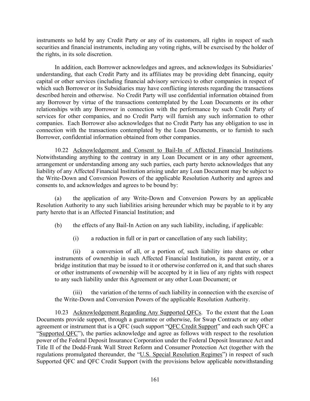 161 instruments so held by any Credit Party or any of its customers, all rights in respect of such securities and financial instruments, including any voting rights, will be exercised by the holder of the rights, in its sole discretion. In addition, each Borrower acknowledges and agrees, and acknowledges its Subsidiaries’ understanding, that each Credit Party and its affiliates may be providing debt financing, equity capital or other services (including financial advisory services) to other companies in respect of which such Borrower or its Subsidiaries may have conflicting interests regarding the transactions described herein and otherwise. No Credit Party will use confidential information obtained from any Borrower by virtue of the transactions contemplated by the Loan Documents or its other relationships with any Borrower in connection with the performance by such Credit Party of services for other companies, and no Credit Party will furnish any such information to other companies. Each Borrower also acknowledges that no Credit Party has any obligation to use in connection with the transactions contemplated by the Loan Documents, or to furnish to such Borrower, confidential information obtained from other companies. 10.22 Acknowledgement and Consent to Bail-In of Affected Financial Institutions. Notwithstanding anything to the contrary in any Loan Document or in any other agreement, arrangement or understanding among any such parties, each party hereto acknowledges that any liability of any Affected Financial Institution arising under any Loan Document may be subject to the Write-Down and Conversion Powers of the applicable Resolution Authority and agrees and consents to, and acknowledges and agrees to be bound by: (a) the application of any Write-Down and Conversion Powers by an applicable Resolution Authority to any such liabilities arising hereunder which may be payable to it by any party hereto that is an Affected Financial Institution; and (b) the effects of any Bail-In Action on any such liability, including, if applicable: (i) a reduction in full or in part or cancellation of any such liability; (ii) a conversion of all, or a portion of, such liability into shares or other instruments of ownership in such Affected Financial Institution, its parent entity, or a bridge institution that may be issued to it or otherwise conferred on it, and that such shares or other instruments of ownership will be accepted by it in lieu of any rights with respect to any such liability under this Agreement or any other Loan Document; or (iii) the variation of the terms of such liability in connection with the exercise of the Write-Down and Conversion Powers of the applicable Resolution Authority. 10.23 Acknowledgement Regarding Any Supported QFCs. To the extent that the Loan Documents provide support, through a guarantee or otherwise, for Swap Contracts or any other agreement or instrument that is a QFC (such support “QFC Credit Support” and each such QFC a “Supported QFC”), the parties acknowledge and agree as follows with respect to the resolution power of the Federal Deposit Insurance Corporation under the Federal Deposit Insurance Act and Title II of the Dodd-Frank Wall Street Reform and Consumer Protection Act (together with the regulations promulgated thereunder, the “U.S. Special Resolution Regimes”) in respect of such Supported QFC and QFC Credit Support (with the provisions below applicable notwithstanding