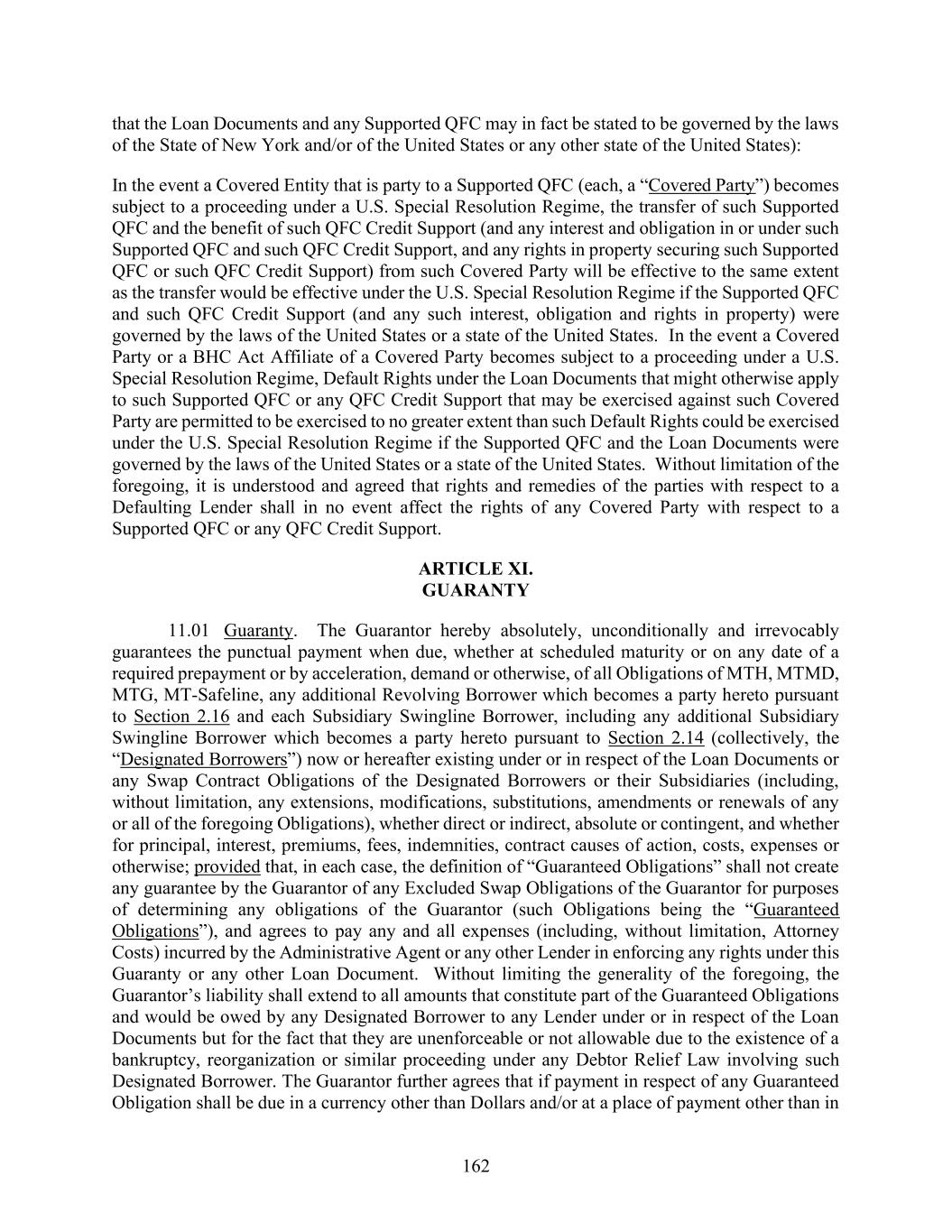 162 that the Loan Documents and any Supported QFC may in fact be stated to be governed by the laws of the State of New York and/or of the United States or any other state of the United States): In the event a Covered Entity that is party to a Supported QFC (each, a “Covered Party”) becomes subject to a proceeding under a U.S. Special Resolution Regime, the transfer of such Supported QFC and the benefit of such QFC Credit Support (and any interest and obligation in or under such Supported QFC and such QFC Credit Support, and any rights in property securing such Supported QFC or such QFC Credit Support) from such Covered Party will be effective to the same extent as the transfer would be effective under the U.S. Special Resolution Regime if the Supported QFC and such QFC Credit Support (and any such interest, obligation and rights in property) were governed by the laws of the United States or a state of the United States. In the event a Covered Party or a BHC Act Affiliate of a Covered Party becomes subject to a proceeding under a U.S. Special Resolution Regime, Default Rights under the Loan Documents that might otherwise apply to such Supported QFC or any QFC Credit Support that may be exercised against such Covered Party are permitted to be exercised to no greater extent than such Default Rights could be exercised under the U.S. Special Resolution Regime if the Supported QFC and the Loan Documents were governed by the laws of the United States or a state of the United States. Without limitation of the foregoing, it is understood and agreed that rights and remedies of the parties with respect to a Defaulting Lender shall in no event affect the rights of any Covered Party with respect to a Supported QFC or any QFC Credit Support. ARTICLE XI. GUARANTY 11.01 Guaranty. The Guarantor hereby absolutely, unconditionally and irrevocably guarantees the punctual payment when due, whether at scheduled maturity or on any date of a required prepayment or by acceleration, demand or otherwise, of all Obligations of MTH, MTMD, MTG, MT-Safeline, any additional Revolving Borrower which becomes a party hereto pursuant to Section 2.16 and each Subsidiary Swingline Borrower, including any additional Subsidiary Swingline Borrower which becomes a party hereto pursuant to Section 2.14 (collectively, the “Designated Borrowers”) now or hereafter existing under or in respect of the Loan Documents or any Swap Contract Obligations of the Designated Borrowers or their Subsidiaries (including, without limitation, any extensions, modifications, substitutions, amendments or renewals of any or all of the foregoing Obligations), whether direct or indirect, absolute or contingent, and whether for principal, interest, premiums, fees, indemnities, contract causes of action, costs, expenses or otherwise; provided that, in each case, the definition of “Guaranteed Obligations” shall not create any guarantee by the Guarantor of any Excluded Swap Obligations of the Guarantor for purposes of determining any obligations of the Guarantor (such Obligations being the “Guaranteed Obligations”), and agrees to pay any and all expenses (including, without limitation, Attorney Costs) incurred by the Administrative Agent or any other Lender in enforcing any rights under this Guaranty or any other Loan Document. Without limiting the generality of the foregoing, the Guarantor’s liability shall extend to all amounts that constitute part of the Guaranteed Obligations and would be owed by any Designated Borrower to any Lender under or in respect of the Loan Documents but for the fact that they are unenforceable or not allowable due to the existence of a bankruptcy, reorganization or similar proceeding under any Debtor Relief Law involving such Designated Borrower. The Guarantor further agrees that if payment in respect of any Guaranteed Obligation shall be due in a currency other than Dollars and/or at a place of payment other than in