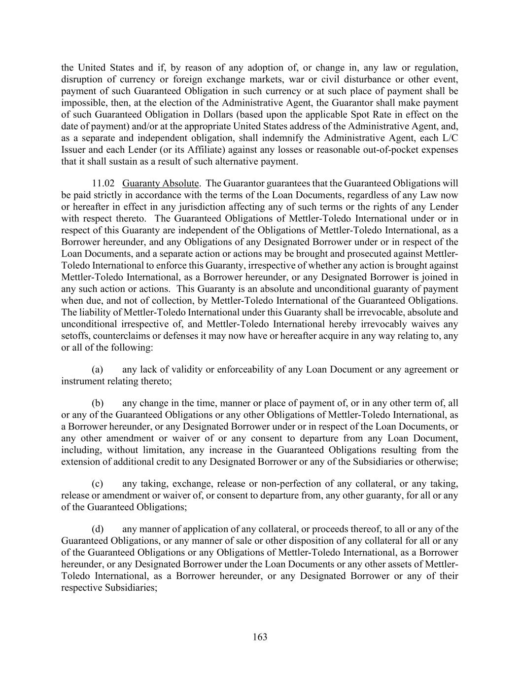 163 the United States and if, by reason of any adoption of, or change in, any law or regulation, disruption of currency or foreign exchange markets, war or civil disturbance or other event, payment of such Guaranteed Obligation in such currency or at such place of payment shall be impossible, then, at the election of the Administrative Agent, the Guarantor shall make payment of such Guaranteed Obligation in Dollars (based upon the applicable Spot Rate in effect on the date of payment) and/or at the appropriate United States address of the Administrative Agent, and, as a separate and independent obligation, shall indemnify the Administrative Agent, each L/C Issuer and each Lender (or its Affiliate) against any losses or reasonable out-of-pocket expenses that it shall sustain as a result of such alternative payment. 11.02 Guaranty Absolute. The Guarantor guarantees that the Guaranteed Obligations will be paid strictly in accordance with the terms of the Loan Documents, regardless of any Law now or hereafter in effect in any jurisdiction affecting any of such terms or the rights of any Lender with respect thereto. The Guaranteed Obligations of Mettler-Toledo International under or in respect of this Guaranty are independent of the Obligations of Mettler-Toledo International, as a Borrower hereunder, and any Obligations of any Designated Borrower under or in respect of the Loan Documents, and a separate action or actions may be brought and prosecuted against Mettler- Toledo International to enforce this Guaranty, irrespective of whether any action is brought against Mettler-Toledo International, as a Borrower hereunder, or any Designated Borrower is joined in any such action or actions. This Guaranty is an absolute and unconditional guaranty of payment when due, and not of collection, by Mettler-Toledo International of the Guaranteed Obligations. The liability of Mettler-Toledo International under this Guaranty shall be irrevocable, absolute and unconditional irrespective of, and Mettler-Toledo International hereby irrevocably waives any setoffs, counterclaims or defenses it may now have or hereafter acquire in any way relating to, any or all of the following: (a) any lack of validity or enforceability of any Loan Document or any agreement or instrument relating thereto; (b) any change in the time, manner or place of payment of, or in any other term of, all or any of the Guaranteed Obligations or any other Obligations of Mettler-Toledo International, as a Borrower hereunder, or any Designated Borrower under or in respect of the Loan Documents, or any other amendment or waiver of or any consent to departure from any Loan Document, including, without limitation, any increase in the Guaranteed Obligations resulting from the extension of additional credit to any Designated Borrower or any of the Subsidiaries or otherwise; (c) any taking, exchange, release or non-perfection of any collateral, or any taking, release or amendment or waiver of, or consent to departure from, any other guaranty, for all or any of the Guaranteed Obligations; (d) any manner of application of any collateral, or proceeds thereof, to all or any of the Guaranteed Obligations, or any manner of sale or other disposition of any collateral for all or any of the Guaranteed Obligations or any Obligations of Mettler-Toledo International, as a Borrower hereunder, or any Designated Borrower under the Loan Documents or any other assets of Mettler- Toledo International, as a Borrower hereunder, or any Designated Borrower or any of their respective Subsidiaries;