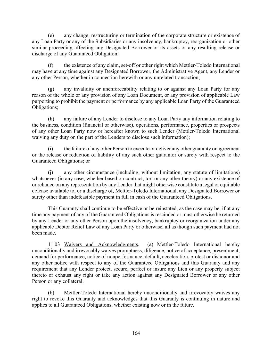 164 (e) any change, restructuring or termination of the corporate structure or existence of any Loan Party or any of the Subsidiaries or any insolvency, bankruptcy, reorganization or other similar proceeding affecting any Designated Borrower or its assets or any resulting release or discharge of any Guaranteed Obligation; (f) the existence of any claim, set-off or other right which Mettler-Toledo International may have at any time against any Designated Borrower, the Administrative Agent, any Lender or any other Person, whether in connection herewith or any unrelated transaction; (g) any invalidity or unenforceability relating to or against any Loan Party for any reason of the whole or any provision of any Loan Document, or any provision of applicable Law purporting to prohibit the payment or performance by any applicable Loan Party of the Guaranteed Obligations; (h) any failure of any Lender to disclose to any Loan Party any information relating to the business, condition (financial or otherwise), operations, performance, properties or prospects of any other Loan Party now or hereafter known to such Lender (Mettler-Toledo International waiving any duty on the part of the Lenders to disclose such information); (i) the failure of any other Person to execute or deliver any other guaranty or agreement or the release or reduction of liability of any such other guarantor or surety with respect to the Guaranteed Obligations; or (j) any other circumstance (including, without limitation, any statute of limitations) whatsoever (in any case, whether based on contract, tort or any other theory) or any existence of or reliance on any representation by any Lender that might otherwise constitute a legal or equitable defense available to, or a discharge of, Mettler-Toledo International, any Designated Borrower or surety other than indefeasible payment in full in cash of the Guaranteed Obligations. This Guaranty shall continue to be effective or be reinstated, as the case may be, if at any time any payment of any of the Guaranteed Obligations is rescinded or must otherwise be returned by any Lender or any other Person upon the insolvency, bankruptcy or reorganization under any applicable Debtor Relief Law of any Loan Party or otherwise, all as though such payment had not been made. 11.03 Waivers and Acknowledgments. (a) Mettler-Toledo International hereby unconditionally and irrevocably waives promptness, diligence, notice of acceptance, presentment, demand for performance, notice of nonperformance, default, acceleration, protest or dishonor and any other notice with respect to any of the Guaranteed Obligations and this Guaranty and any requirement that any Lender protect, secure, perfect or insure any Lien or any property subject thereto or exhaust any right or take any action against any Designated Borrower or any other Person or any collateral. (b) Mettler-Toledo International hereby unconditionally and irrevocably waives any right to revoke this Guaranty and acknowledges that this Guaranty is continuing in nature and applies to all Guaranteed Obligations, whether existing now or in the future.