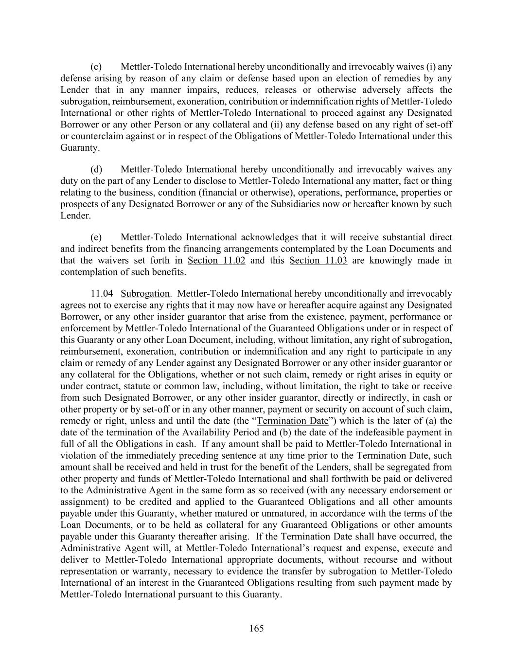 165 (c) Mettler-Toledo International hereby unconditionally and irrevocably waives (i) any defense arising by reason of any claim or defense based upon an election of remedies by any Lender that in any manner impairs, reduces, releases or otherwise adversely affects the subrogation, reimbursement, exoneration, contribution or indemnification rights of Mettler-Toledo International or other rights of Mettler-Toledo International to proceed against any Designated Borrower or any other Person or any collateral and (ii) any defense based on any right of set-off or counterclaim against or in respect of the Obligations of Mettler-Toledo International under this Guaranty. (d) Mettler-Toledo International hereby unconditionally and irrevocably waives any duty on the part of any Lender to disclose to Mettler-Toledo International any matter, fact or thing relating to the business, condition (financial or otherwise), operations, performance, properties or prospects of any Designated Borrower or any of the Subsidiaries now or hereafter known by such Lender. (e) Mettler-Toledo International acknowledges that it will receive substantial direct and indirect benefits from the financing arrangements contemplated by the Loan Documents and that the waivers set forth in Section 11.02 and this Section 11.03 are knowingly made in contemplation of such benefits. 11.04 Subrogation. Mettler-Toledo International hereby unconditionally and irrevocably agrees not to exercise any rights that it may now have or hereafter acquire against any Designated Borrower, or any other insider guarantor that arise from the existence, payment, performance or enforcement by Mettler-Toledo International of the Guaranteed Obligations under or in respect of this Guaranty or any other Loan Document, including, without limitation, any right of subrogation, reimbursement, exoneration, contribution or indemnification and any right to participate in any claim or remedy of any Lender against any Designated Borrower or any other insider guarantor or any collateral for the Obligations, whether or not such claim, remedy or right arises in equity or under contract, statute or common law, including, without limitation, the right to take or receive from such Designated Borrower, or any other insider guarantor, directly or indirectly, in cash or other property or by set-off or in any other manner, payment or security on account of such claim, remedy or right, unless and until the date (the “Termination Date”) which is the later of (a) the date of the termination of the Availability Period and (b) the date of the indefeasible payment in full of all the Obligations in cash. If any amount shall be paid to Mettler-Toledo International in violation of the immediately preceding sentence at any time prior to the Termination Date, such amount shall be received and held in trust for the benefit of the Lenders, shall be segregated from other property and funds of Mettler-Toledo International and shall forthwith be paid or delivered to the Administrative Agent in the same form as so received (with any necessary endorsement or assignment) to be credited and applied to the Guaranteed Obligations and all other amounts payable under this Guaranty, whether matured or unmatured, in accordance with the terms of the Loan Documents, or to be held as collateral for any Guaranteed Obligations or other amounts payable under this Guaranty thereafter arising. If the Termination Date shall have occurred, the Administrative Agent will, at Mettler-Toledo International’s request and expense, execute and deliver to Mettler-Toledo International appropriate documents, without recourse and without representation or warranty, necessary to evidence the transfer by subrogation to Mettler-Toledo International of an interest in the Guaranteed Obligations resulting from such payment made by Mettler-Toledo International pursuant to this Guaranty.