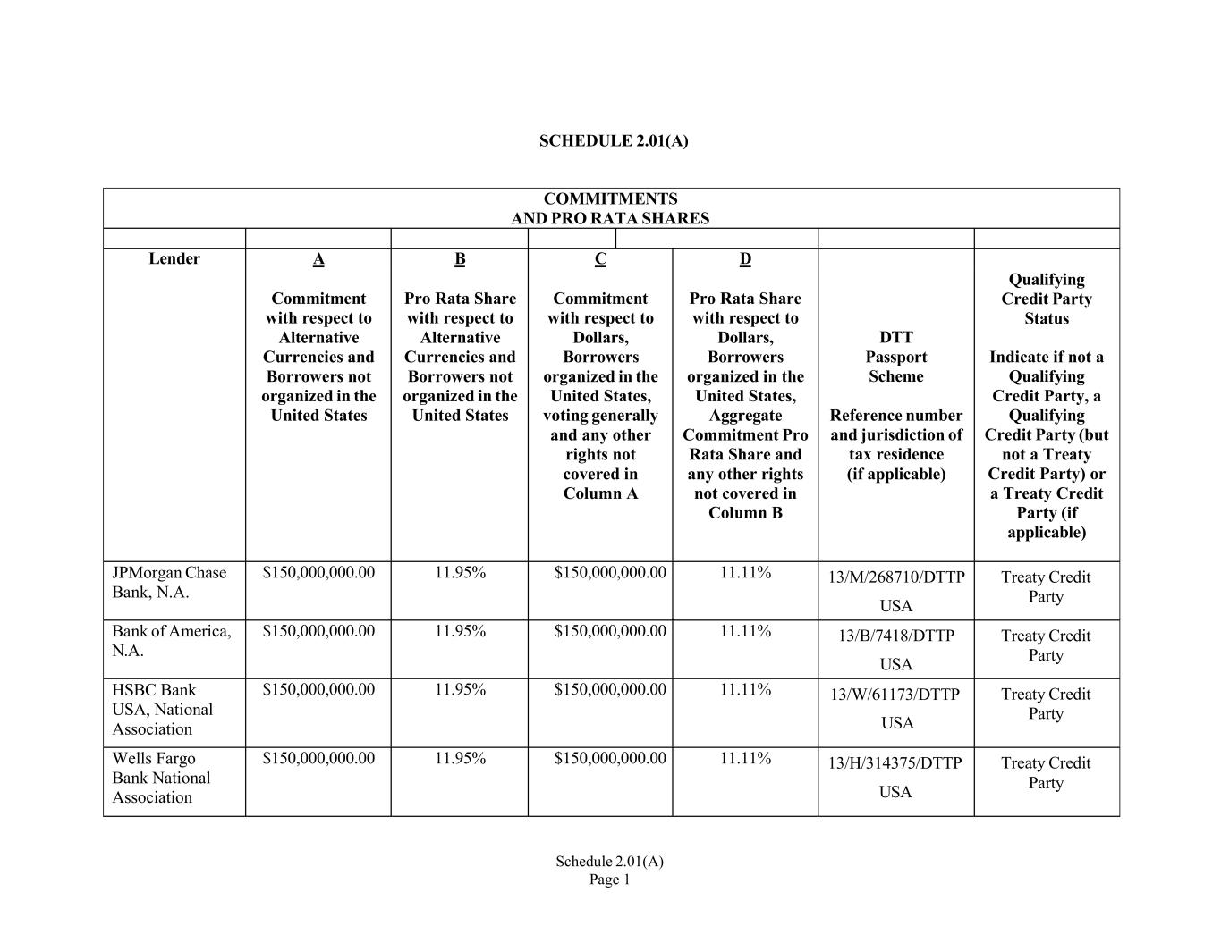 Schedule 2.01(A) Page 1 SCHEDULE 2.01(A) COMMITMENTS AND PRO RATA SHARES Lender A B C D Commitment with respect to Alternative Currencies and Borrowers not organized in the United States Pro Rata Share with respect to Alternative Currencies and Borrowers not organized in the United States Commitment with respect to Dollars, Borrowers organized in the United States, voting generally and any other rights not covered in Column A Pro Rata Share with respect to Dollars, Borrowers organized in the United States, Aggregate Commitment Pro Rata Share and any other rights not covered in Column B DTT Passport Scheme Reference number and jurisdiction of tax residence (if applicable) Qualifying Credit Party Status Indicate if not a Qualifying Credit Party, a Qualifying Credit Party (but not a Treaty Credit Party) or a Treaty Credit Party (if applicable) JPMorgan Chase Bank, N.A. $150,000,000.00 11.95% $150,000,000.00 11.11% 13/M/268710/DTTP USA Treaty Credit Party Bank of America, N.A. $150,000,000.00 11.95% $150,000,000.00 11.11% 13/B/7418/DTTP USA Treaty Credit Party HSBC Bank USA, National Association $150,000,000.00 11.95% $150,000,000.00 11.11% 13/W/61173/DTTP USA Treaty Credit Party Wells Fargo Bank National Association $150,000,000.00 11.95% $150,000,000.00 11.11% 13/H/314375/DTTP USA Treaty Credit Party