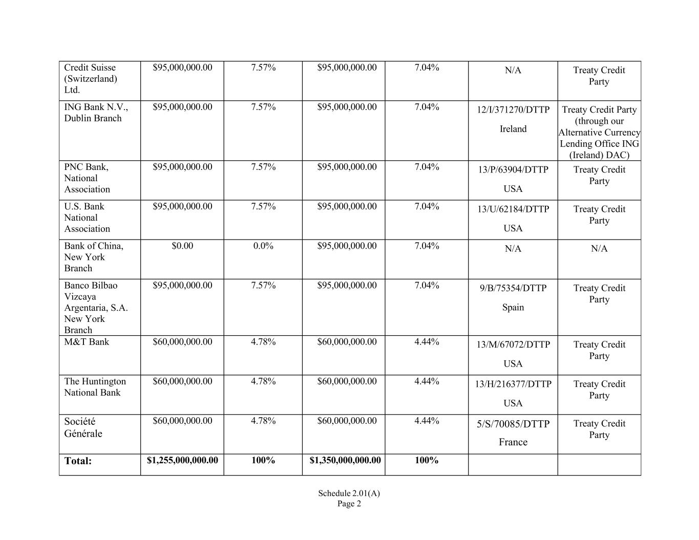Schedule 2.01(A) Page 2 Credit Suisse (Switzerland) Ltd. $95,000,000.00 7.57% $95,000,000.00 7.04% N/A Treaty Credit Party ING Bank N.V., Dublin Branch $95,000,000.00 7.57% $95,000,000.00 7.04% 12/I/371270/DTTP Ireland Treaty Credit Party (through our Alternative Currency Lending Office ING (Ireland) DAC) PNC Bank, National Association $95,000,000.00 7.57% $95,000,000.00 7.04% 13/P/63904/DTTP USA Treaty Credit Party U.S. Bank National Association $95,000,000.00 7.57% $95,000,000.00 7.04% 13/U/62184/DTTP USA Treaty Credit Party Bank of China, New York Branch $0.00 0.0% $95,000,000.00 7.04% N/A N/A Banco Bilbao Vizcaya Argentaria, S.A. New York Branch $95,000,000.00 7.57% $95,000,000.00 7.04% 9/B/75354/DTTP Spain Treaty Credit Party M&T Bank $60,000,000.00 4.78% $60,000,000.00 4.44% 13/M/67072/DTTP USA Treaty Credit Party The Huntington National Bank $60,000,000.00 4.78% $60,000,000.00 4.44% 13/H/216377/DTTP USA Treaty Credit Party Société Générale $60,000,000.00 4.78% $60,000,000.00 4.44% 5/S/70085/DTTP France Treaty Credit Party Total: $1,255,000,000.00 100% $1,350,000,000.00 100%