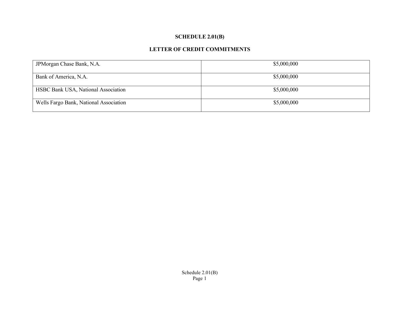 Schedule 2.01(B) Page 1 SCHEDULE 2.01(B) LETTER OF CREDIT COMMITMENTS JPMorgan Chase Bank, N.A. $5,000,000 Bank of America, N.A. $5,000,000 HSBC Bank USA, National Association $5,000,000 Wells Fargo Bank, National Association $5,000,000