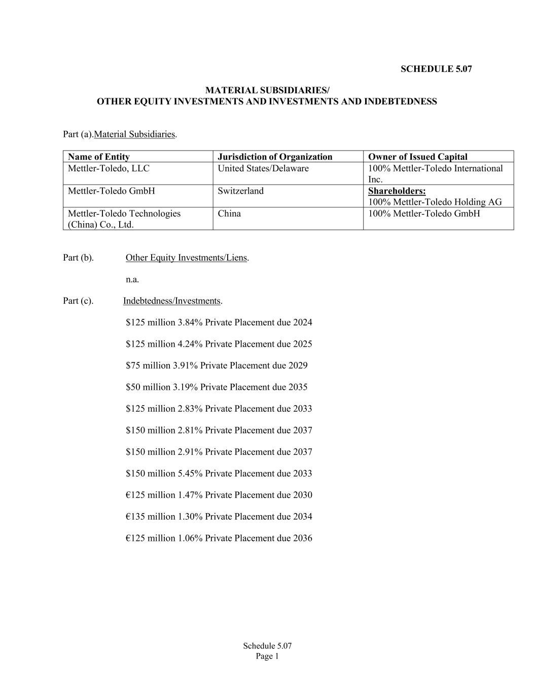 Schedule 5.07 Page 1 SCHEDULE 5.07 MATERIAL SUBSIDIARIES/ OTHER EQUITY INVESTMENTS AND INVESTMENTS AND INDEBTEDNESS Part (a).Material Subsidiaries. Name of Entity Jurisdiction of Organization Owner of Issued Capital Mettler-Toledo, LLC United States/Delaware 100% Mettler-Toledo International Inc. Mettler-Toledo GmbH Switzerland Shareholders: 100% Mettler-Toledo Holding AG Mettler-Toledo Technologies (China) Co., Ltd. China 100% Mettler-Toledo GmbH Part (b). Other Equity Investments/Liens. n.a. Part (c). Indebtedness/Investments. $125 million 3.84% Private Placement due 2024 $125 million 4.24% Private Placement due 2025 $75 million 3.91% Private Placement due 2029 $50 million 3.19% Private Placement due 2035 $125 million 2.83% Private Placement due 2033 $150 million 2.81% Private Placement due 2037 $150 million 2.91% Private Placement due 2037 $150 million 5.45% Private Placement due 2033 €125 million 1.47% Private Placement due 2030 €135 million 1.30% Private Placement due 2034 €125 million 1.06% Private Placement due 2036