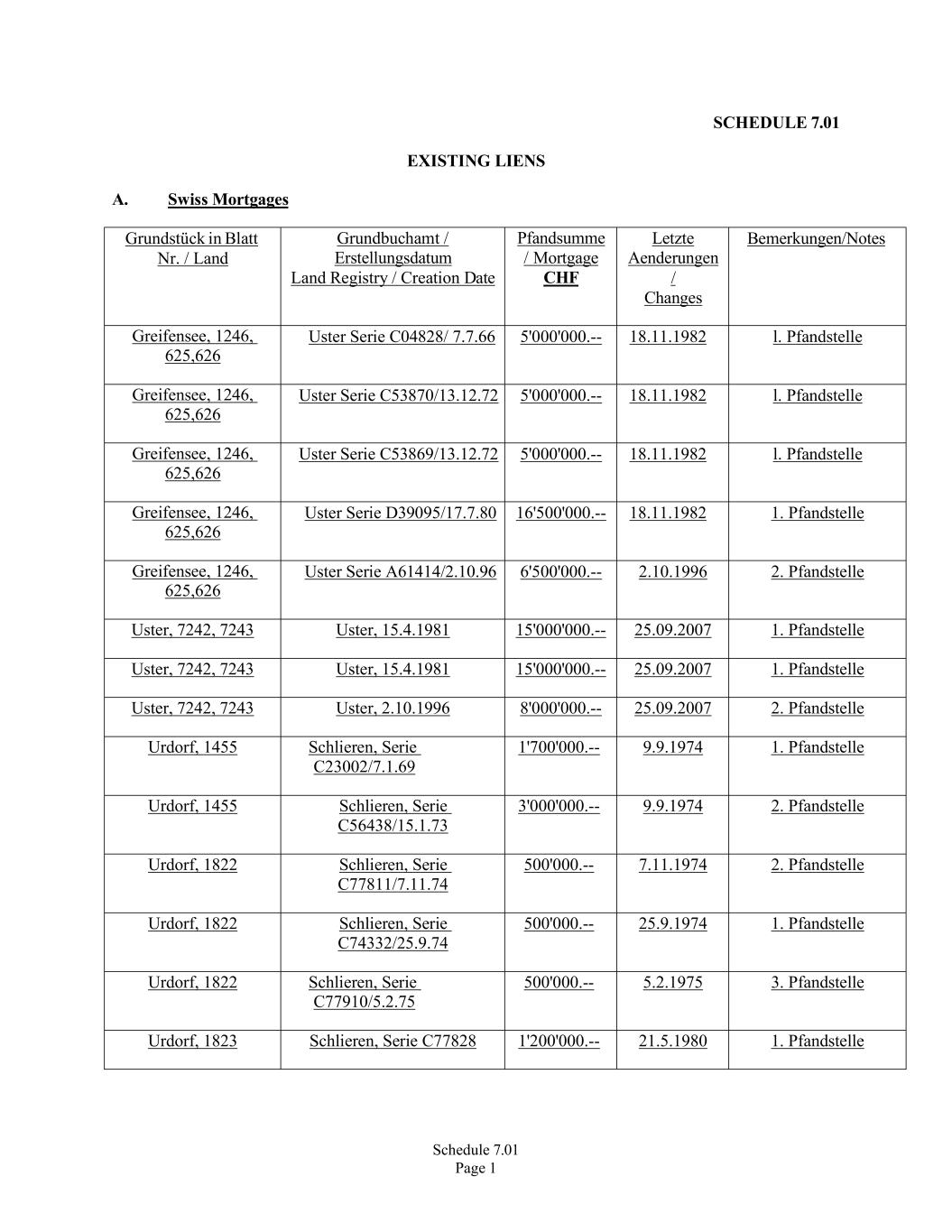 Schedule 7.01 Page 1 SCHEDULE 7.01 EXISTING LIENS A. Swiss Mortgages Grundstück in Blatt Nr. / Land Grundbuchamt / Erstellungsdatum Land Registry / Creation Date Pfandsumme / Mortgage CHF Letzte Aenderungen / Changes Bemerkungen/Notes Greifensee, 1246, 625,626 Uster Serie C04828/ 7.7.66 5'000'000.-- 18.11.1982 l. Pfandstelle Greifensee, 1246, 625,626 Uster Serie C53870/13.12.72 5'000'000.-- 18.11.1982 l. Pfandstelle Greifensee, 1246, 625,626 Uster Serie C53869/13.12.72 5'000'000.-- 18.11.1982 l. Pfandstelle Greifensee, 1246, 625,626 Uster Serie D39095/17.7.80 16'500'000.-- 18.11.1982 1. Pfandstelle Greifensee, 1246, 625,626 Uster Serie A61414/2.10.96 6'500'000.-- 2.10.1996 2. Pfandstelle Uster, 7242, 7243 Uster, 15.4.1981 15'000'000.-- 25.09.2007 1. Pfandstelle Uster, 7242, 7243 Uster, 15.4.1981 15'000'000.-- 25.09.2007 1. Pfandstelle Uster, 7242, 7243 Uster, 2.10.1996 8'000'000.-- 25.09.2007 2. Pfandstelle Urdorf, 1455 Schlieren, Serie C23002/7.1.69 1'700'000.-- 9.9.1974 1. Pfandstelle Urdorf, 1455 Schlieren, Serie C56438/15.1.73 3'000'000.-- 9.9.1974 2. Pfandstelle Urdorf, 1822 Schlieren, Serie C77811/7.11.74 500'000.-- 7.11.1974 2. Pfandstelle Urdorf, 1822 Schlieren, Serie C74332/25.9.74 500'000.-- 25.9.1974 1. Pfandstelle Urdorf, 1822 Schlieren, Serie C77910/5.2.75 500'000.-- 5.2.1975 3. Pfandstelle Urdorf, 1823 Schlieren, Serie C77828 1'200'000.-- 21.5.1980 1. Pfandstelle