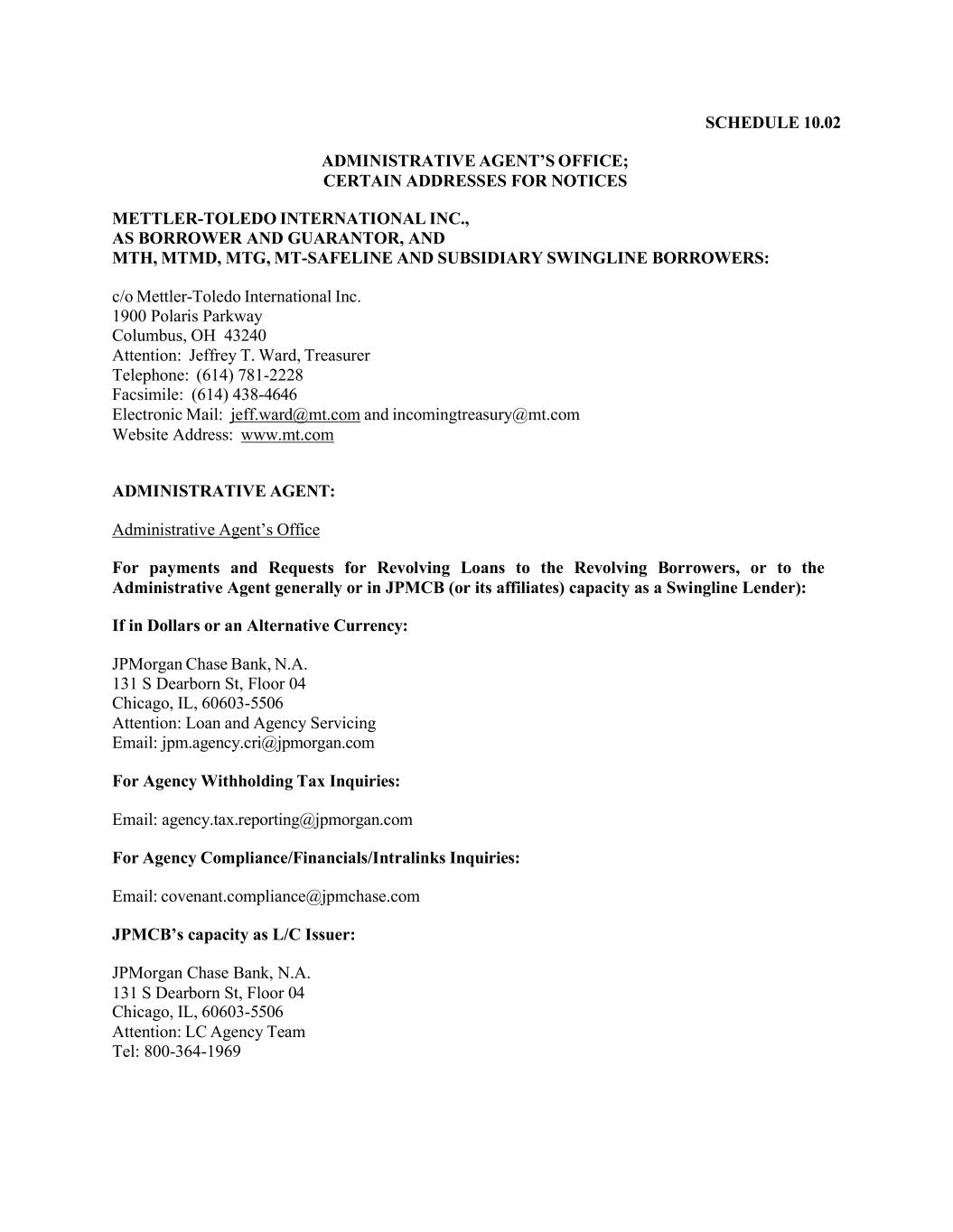 SCHEDULE 10.02 ADMINISTRATIVE AGENT’S OFFICE; CERTAIN ADDRESSES FOR NOTICES METTLER-TOLEDO INTERNATIONAL INC., AS BORROWER AND GUARANTOR, AND MTH, MTMD, MTG, MT-SAFELINE AND SUBSIDIARY SWINGLINE BORROWERS: c/o Mettler-Toledo International Inc. 1900 Polaris Parkway Columbus, OH 43240 Attention: Jeffrey T. Ward, Treasurer Telephone: (614) 781-2228 Facsimile: (614) 438-4646 Electronic Mail: jeff.ward@mt.com and incomingtreasury@mt.com Website Address: www.mt.com ADMINISTRATIVE AGENT: Administrative Agent’s Office For payments and Requests for Revolving Loans to the Revolving Borrowers, or to the Administrative Agent generally or in JPMCB (or its affiliates) capacity as a Swingline Lender): If in Dollars or an Alternative Currency: JPMorgan Chase Bank, N.A. 131 S Dearborn St, Floor 04 Chicago, IL, 60603-5506 Attention: Loan and Agency Servicing Email: jpm.agency.cri@jpmorgan.com For Agency Withholding Tax Inquiries: Email: agency.tax.reporting@jpmorgan.com For Agency Compliance/Financials/Intralinks Inquiries: Email: covenant.compliance@jpmchase.com JPMCB’s capacity as L/C Issuer: JPMorgan Chase Bank, N.A. 131 S Dearborn St, Floor 04 Chicago, IL, 60603-5506 Attention: LC Agency Team Tel: 800-364-1969
