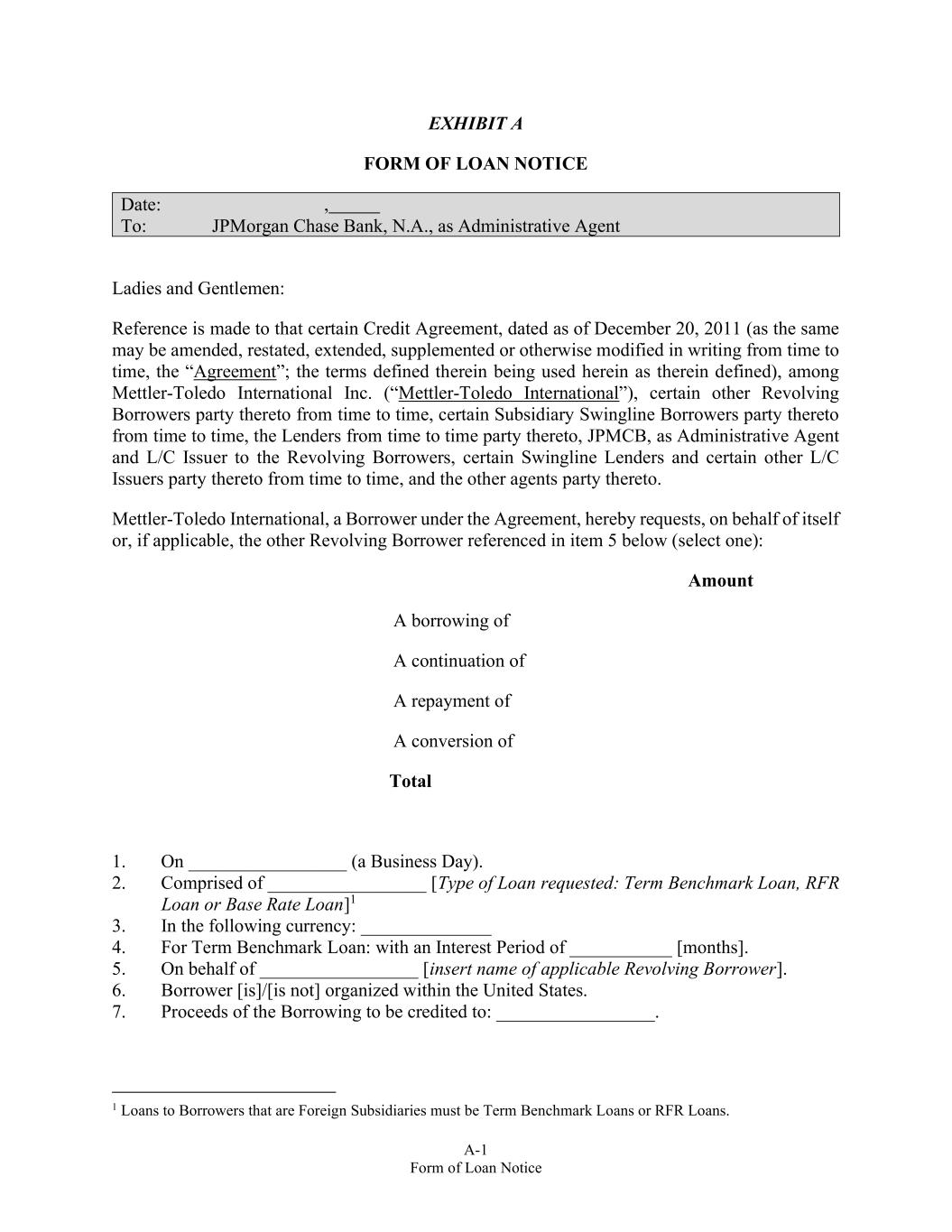 A-1 Form of Loan Notice EXHIBIT A FORM OF LOAN NOTICE Date: , To: JPMorgan Chase Bank, N.A., as Administrative Agent Ladies and Gentlemen: Reference is made to that certain Credit Agreement, dated as of December 20, 2011 (as the same may be amended, restated, extended, supplemented or otherwise modified in writing from time to time, the “Agreement”; the terms defined therein being used herein as therein defined), among Mettler-Toledo International Inc. (“Mettler-Toledo International”), certain other Revolving Borrowers party thereto from time to time, certain Subsidiary Swingline Borrowers party thereto from time to time, the Lenders from time to time party thereto, JPMCB, as Administrative Agent and L/C Issuer to the Revolving Borrowers, certain Swingline Lenders and certain other L/C Issuers party thereto from time to time, and the other agents party thereto. Mettler-Toledo International, a Borrower under the Agreement, hereby requests, on behalf of itself or, if applicable, the other Revolving Borrower referenced in item 5 below (select one): Amount A borrowing of A continuation of A repayment of A conversion of Total 1. On _________________ (a Business Day). 2. Comprised of _________________ [Type of Loan requested: Term Benchmark Loan, RFR Loan or Base Rate Loan]1 3. In the following currency: ______________ 4. For Term Benchmark Loan: with an Interest Period of ___________ [months]. 5. On behalf of _________________ [insert name of applicable Revolving Borrower]. 6. Borrower [is]/[is not] organized within the United States. 7. Proceeds of the Borrowing to be credited to: _________________. 1 Loans to Borrowers that are Foreign Subsidiaries must be Term Benchmark Loans or RFR Loans.