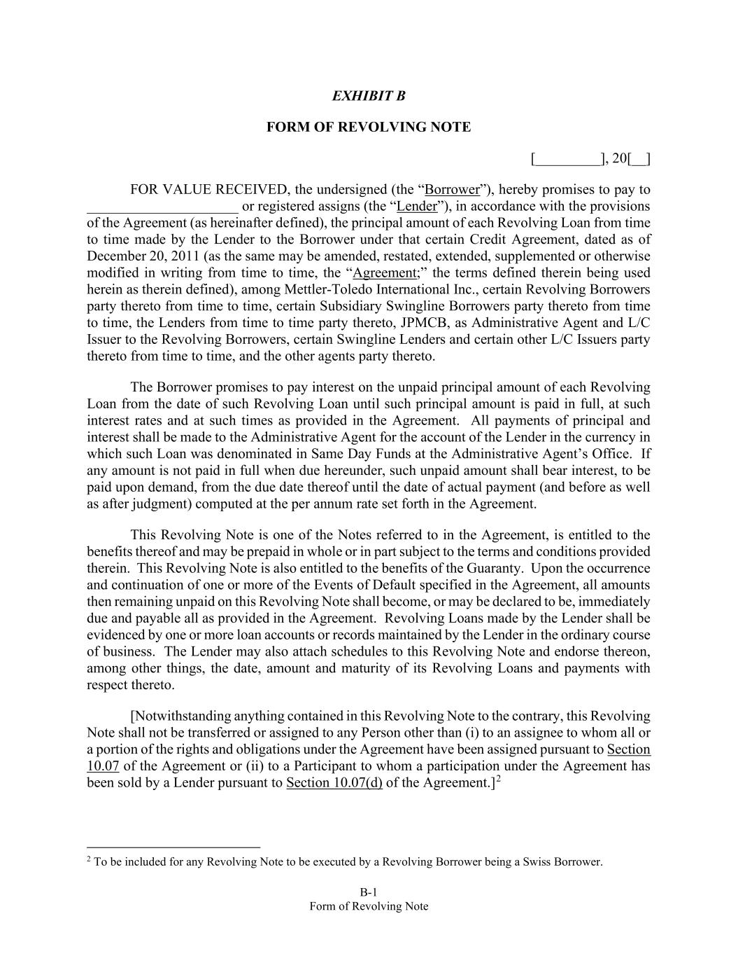 B-1 Form of Revolving Note EXHIBIT B FORM OF REVOLVING NOTE [_________], 20[__] FOR VALUE RECEIVED, the undersigned (the “Borrower”), hereby promises to pay to _____________________ or registered assigns (the “Lender”), in accordance with the provisions of the Agreement (as hereinafter defined), the principal amount of each Revolving Loan from time to time made by the Lender to the Borrower under that certain Credit Agreement, dated as of December 20, 2011 (as the same may be amended, restated, extended, supplemented or otherwise modified in writing from time to time, the “Agreement;” the terms defined therein being used herein as therein defined), among Mettler-Toledo International Inc., certain Revolving Borrowers party thereto from time to time, certain Subsidiary Swingline Borrowers party thereto from time to time, the Lenders from time to time party thereto, JPMCB, as Administrative Agent and L/C Issuer to the Revolving Borrowers, certain Swingline Lenders and certain other L/C Issuers party thereto from time to time, and the other agents party thereto. The Borrower promises to pay interest on the unpaid principal amount of each Revolving Loan from the date of such Revolving Loan until such principal amount is paid in full, at such interest rates and at such times as provided in the Agreement. All payments of principal and interest shall be made to the Administrative Agent for the account of the Lender in the currency in which such Loan was denominated in Same Day Funds at the Administrative Agent’s Office. If any amount is not paid in full when due hereunder, such unpaid amount shall bear interest, to be paid upon demand, from the due date thereof until the date of actual payment (and before as well as after judgment) computed at the per annum rate set forth in the Agreement. This Revolving Note is one of the Notes referred to in the Agreement, is entitled to the benefits thereof and may be prepaid in whole or in part subject to the terms and conditions provided therein. This Revolving Note is also entitled to the benefits of the Guaranty. Upon the occurrence and continuation of one or more of the Events of Default specified in the Agreement, all amounts then remaining unpaid on this Revolving Note shall become, or may be declared to be, immediately due and payable all as provided in the Agreement. Revolving Loans made by the Lender shall be evidenced by one or more loan accounts or records maintained by the Lender in the ordinary course of business. The Lender may also attach schedules to this Revolving Note and endorse thereon, among other things, the date, amount and maturity of its Revolving Loans and payments with respect thereto. [Notwithstanding anything contained in this Revolving Note to the contrary, this Revolving Note shall not be transferred or assigned to any Person other than (i) to an assignee to whom all or a portion of the rights and obligations under the Agreement have been assigned pursuant to Section 10.07 of the Agreement or (ii) to a Participant to whom a participation under the Agreement has been sold by a Lender pursuant to Section 10.07(d) of the Agreement.]2 2 To be included for any Revolving Note to be executed by a Revolving Borrower being a Swiss Borrower.