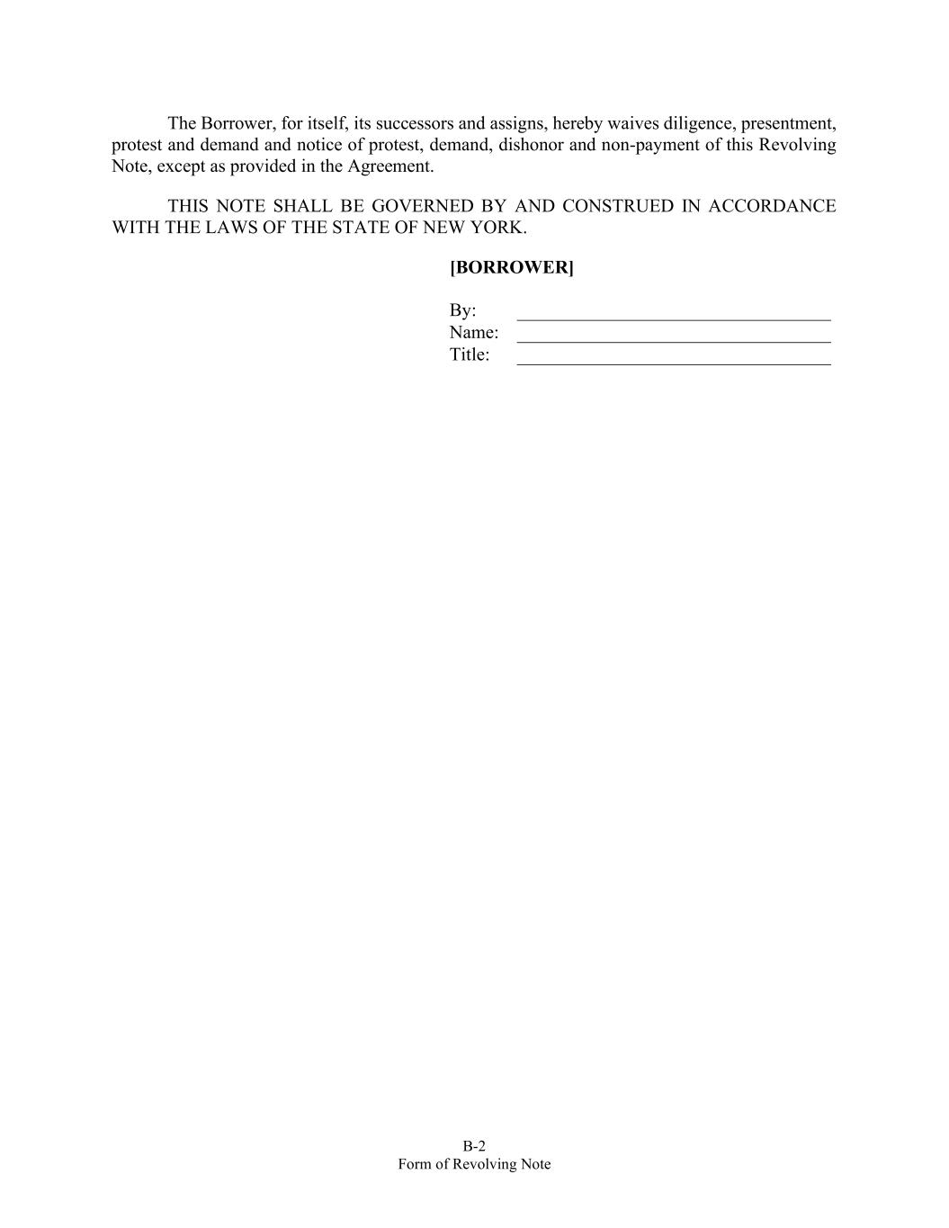 B-2 Form of Revolving Note The Borrower, for itself, its successors and assigns, hereby waives diligence, presentment, protest and demand and notice of protest, demand, dishonor and non-payment of this Revolving Note, except as provided in the Agreement. THIS NOTE SHALL BE GOVERNED BY AND CONSTRUED IN ACCORDANCE WITH THE LAWS OF THE STATE OF NEW YORK. [BORROWER] By: Name: Title: