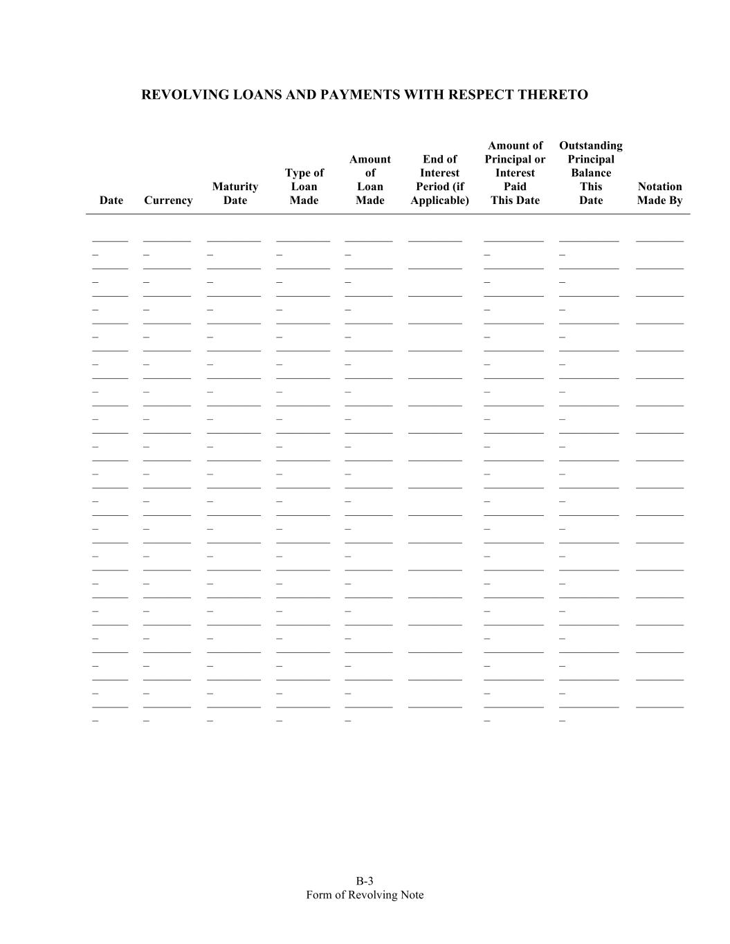 B-3 Form of Revolving Note REVOLVING LOANS AND PAYMENTS WITH RESPECT THERETO Date Currency Maturity Date Type of Loan Made Amount of Loan Made End of Interest Period (if Applicable) Amount of Principal or Interest Paid This Date Outstanding Principal Balance This Date Notation Made By ______ _ ________ _ _________ _ _________ _ ________ _ _________ __________ _ __________ _ ________ ______ _ ________ _ _________ _ _________ _ ________ _ _________ __________ _ __________ _ ________ ______ _ ________ _ _________ _ _________ _ ________ _ _________ __________ _ __________ _ ________ ______ _ ________ _ _________ _ _________ _ ________ _ _________ __________ _ __________ _ ________ ______ _ ________ _ _________ _ _________ _ ________ _ _________ __________ _ __________ _ ________ ______ _ ________ _ _________ _ _________ _ ________ _ _________ __________ _ __________ _ ________ ______ _ ________ _ _________ _ _________ _ ________ _ _________ __________ _ __________ _ ________ ______ _ ________ _ _________ _ _________ _ ________ _ _________ __________ _ __________ _ ________ ______ _ ________ _ _________ _ _________ _ ________ _ _________ __________ _ __________ _ ________ ______ _ ________ _ _________ _ _________ _ ________ _ _________ __________ _ __________ _ ________ ______ _ ________ _ _________ _ _________ _ ________ _ _________ __________ _ __________ _ ________ ______ _ ________ _ _________ _ _________ _ ________ _ _________ __________ _ __________ _ ________ ______ _ ________ _ _________ _ _________ _ ________ _ _________ __________ _ __________ _ ________ ______ _ ________ _ _________ _ _________ _ ________ _ _________ __________ _ __________ _ ________ ______ _ ________ _ _________ _ _________ _ ________ _ _________ __________ _ __________ _ ________ ______ _ ________ _ _________ _ _________ _ ________ _ _________ __________ _ __________ _ ________ ______ _ ________ _ _________ _ _________ _ ________ _ _________ __________ _ __________ _ ________ ______ _ ________ _ _________ _ _________ _ ________ _ _________ __________ _ __________ _ ________