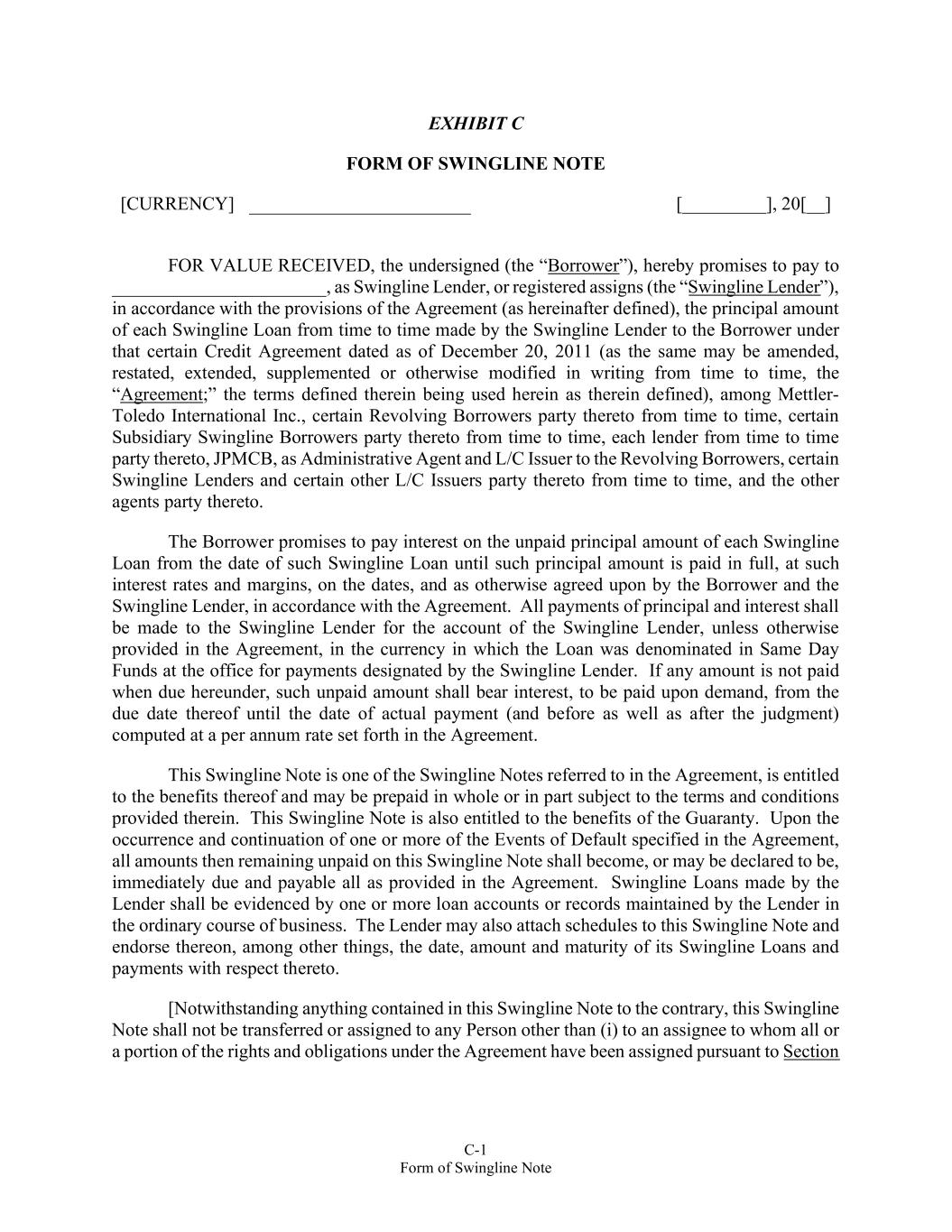 C-1 Form of Swingline Note EXHIBIT C FORM OF SWINGLINE NOTE [CURRENCY] [_________], 20[__] FOR VALUE RECEIVED, the undersigned (the “Borrower”), hereby promises to pay to _______________________, as Swingline Lender, or registered assigns (the “Swingline Lender”), in accordance with the provisions of the Agreement (as hereinafter defined), the principal amount of each Swingline Loan from time to time made by the Swingline Lender to the Borrower under that certain Credit Agreement dated as of December 20, 2011 (as the same may be amended, restated, extended, supplemented or otherwise modified in writing from time to time, the “Agreement;” the terms defined therein being used herein as therein defined), among Mettler- Toledo International Inc., certain Revolving Borrowers party thereto from time to time, certain Subsidiary Swingline Borrowers party thereto from time to time, each lender from time to time party thereto, JPMCB, as Administrative Agent and L/C Issuer to the Revolving Borrowers, certain Swingline Lenders and certain other L/C Issuers party thereto from time to time, and the other agents party thereto. The Borrower promises to pay interest on the unpaid principal amount of each Swingline Loan from the date of such Swingline Loan until such principal amount is paid in full, at such interest rates and margins, on the dates, and as otherwise agreed upon by the Borrower and the Swingline Lender, in accordance with the Agreement. All payments of principal and interest shall be made to the Swingline Lender for the account of the Swingline Lender, unless otherwise provided in the Agreement, in the currency in which the Loan was denominated in Same Day Funds at the office for payments designated by the Swingline Lender. If any amount is not paid when due hereunder, such unpaid amount shall bear interest, to be paid upon demand, from the due date thereof until the date of actual payment (and before as well as after the judgment) computed at a per annum rate set forth in the Agreement. This Swingline Note is one of the Swingline Notes referred to in the Agreement, is entitled to the benefits thereof and may be prepaid in whole or in part subject to the terms and conditions provided therein. This Swingline Note is also entitled to the benefits of the Guaranty. Upon the occurrence and continuation of one or more of the Events of Default specified in the Agreement, all amounts then remaining unpaid on this Swingline Note shall become, or may be declared to be, immediately due and payable all as provided in the Agreement. Swingline Loans made by the Lender shall be evidenced by one or more loan accounts or records maintained by the Lender in the ordinary course of business. The Lender may also attach schedules to this Swingline Note and endorse thereon, among other things, the date, amount and maturity of its Swingline Loans and payments with respect thereto. [Notwithstanding anything contained in this Swingline Note to the contrary, this Swingline Note shall not be transferred or assigned to any Person other than (i) to an assignee to whom all or a portion of the rights and obligations under the Agreement have been assigned pursuant to Section
