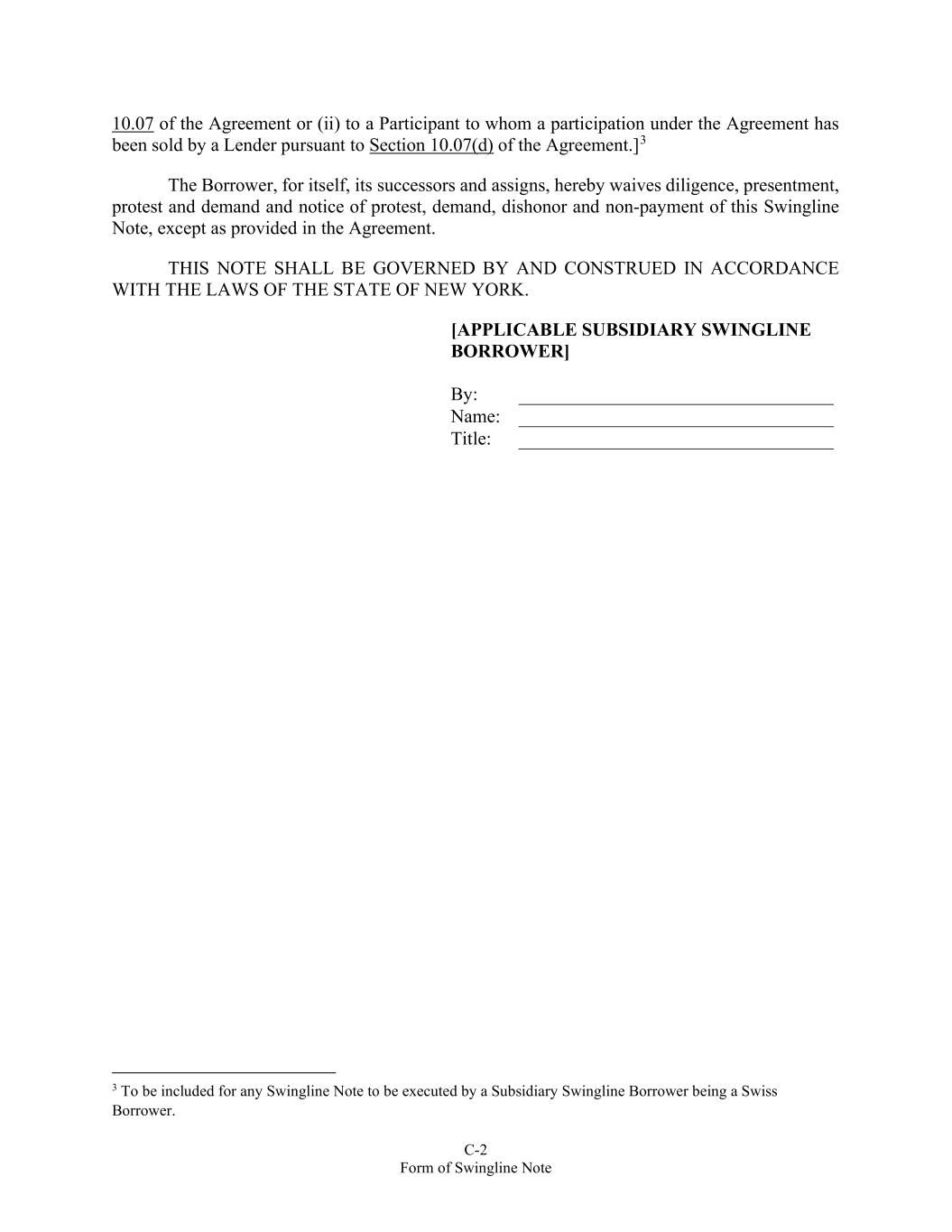 C-2 Form of Swingline Note 10.07 of the Agreement or (ii) to a Participant to whom a participation under the Agreement has been sold by a Lender pursuant to Section 10.07(d) of the Agreement.]3 The Borrower, for itself, its successors and assigns, hereby waives diligence, presentment, protest and demand and notice of protest, demand, dishonor and non-payment of this Swingline Note, except as provided in the Agreement. THIS NOTE SHALL BE GOVERNED BY AND CONSTRUED IN ACCORDANCE WITH THE LAWS OF THE STATE OF NEW YORK. [APPLICABLE SUBSIDIARY SWINGLINE BORROWER] By: Name: Title: 3 To be included for any Swingline Note to be executed by a Subsidiary Swingline Borrower being a Swiss Borrower.