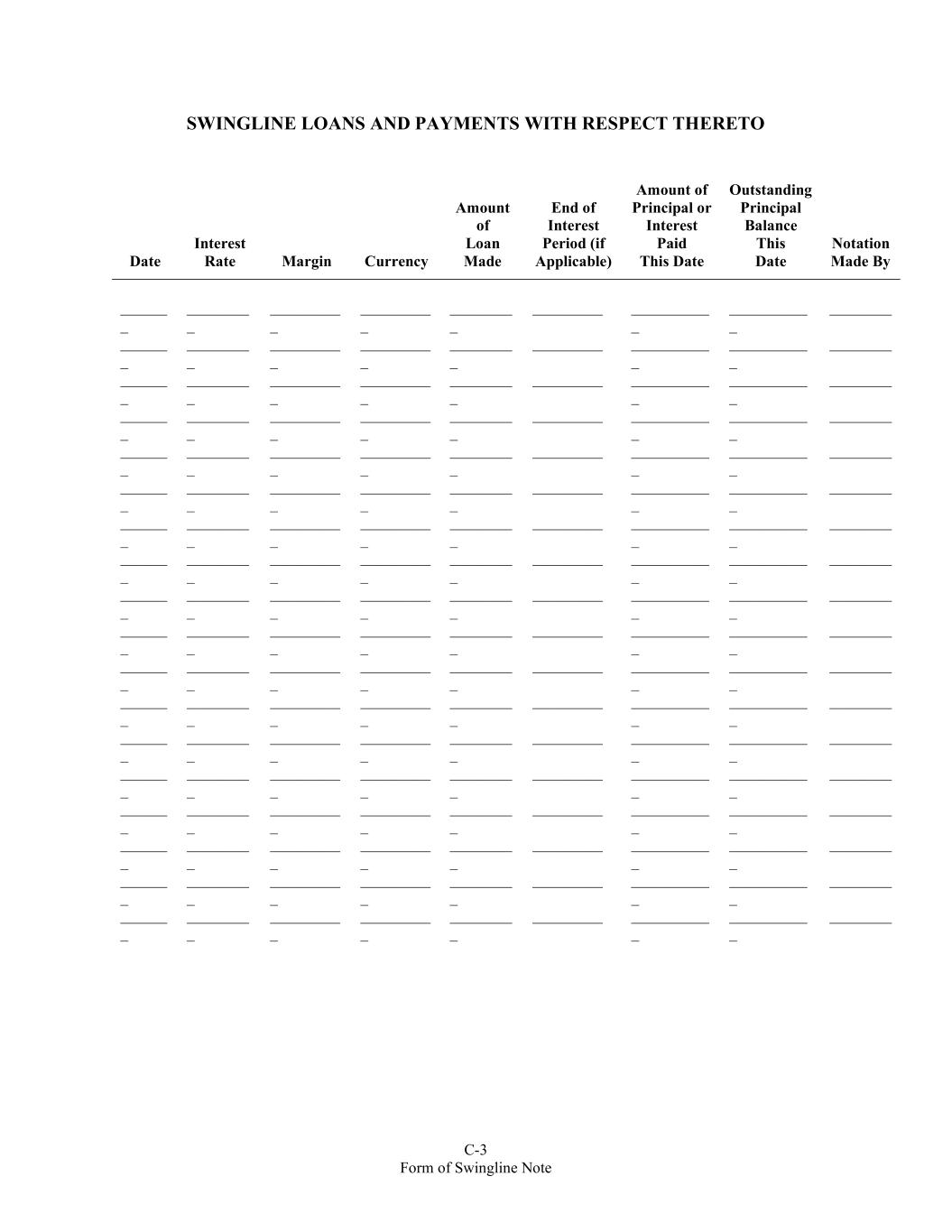 C-3 Form of Swingline Note SWINGLINE LOANS AND PAYMENTS WITH RESPECT THERETO Date Interest Rate Margin Currency Amount of Loan Made End of Interest Period (if Applicable) Amount of Principal or Interest Paid This Date Outstanding Principal Balance This Date Notation Made By ______ _ ________ _ _________ _ _________ _ ________ _ _________ __________ _ __________ _ ________ ______ _ ________ _ _________ _ _________ _ ________ _ _________ __________ _ __________ _ ________ ______ _ ________ _ _________ _ _________ _ ________ _ _________ __________ _ __________ _ ________ ______ _ ________ _ _________ _ _________ _ ________ _ _________ __________ _ __________ _ ________ ______ _ ________ _ _________ _ _________ _ ________ _ _________ __________ _ __________ _ ________ ______ _ ________ _ _________ _ _________ _ ________ _ _________ __________ _ __________ _ ________ ______ _ ________ _ _________ _ _________ _ ________ _ _________ __________ _ __________ _ ________ ______ _ ________ _ _________ _ _________ _ ________ _ _________ __________ _ __________ _ ________ ______ _ ________ _ _________ _ _________ _ ________ _ _________ __________ _ __________ _ ________ ______ _ ________ _ _________ _ _________ _ ________ _ _________ __________ _ __________ _ ________ ______ _ ________ _ _________ _ _________ _ ________ _ _________ __________ _ __________ _ ________ ______ _ ________ _ _________ _ _________ _ ________ _ _________ __________ _ __________ _ ________ ______ _ ________ _ _________ _ _________ _ ________ _ _________ __________ _ __________ _ ________ ______ _ ________ _ _________ _ _________ _ ________ _ _________ __________ _ __________ _ ________ ______ _ ________ _ _________ _ _________ _ ________ _ _________ __________ _ __________ _ ________ ______ _ ________ _ _________ _ _________ _ ________ _ _________ __________ _ __________ _ ________ ______ _ ________ _ _________ _ _________ _ ________ _ _________ __________ _ __________ _ ________ ______ _ ________ _ _________ _ _________ _ ________ _ _________ __________ _ __________ _ ________