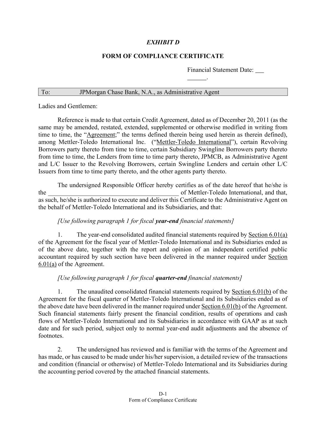 D-1 Form of Compliance Certificate EXHIBIT D FORM OF COMPLIANCE CERTIFICATE Financial Statement Date: . To: JPMorgan Chase Bank, N.A., as Administrative Agent Ladies and Gentlemen: Reference is made to that certain Credit Agreement, dated as of December 20, 2011 (as the same may be amended, restated, extended, supplemented or otherwise modified in writing from time to time, the “Agreement;” the terms defined therein being used herein as therein defined), among Mettler-Toledo International Inc. (“Mettler-Toledo International”), certain Revolving Borrowers party thereto from time to time, certain Subsidiary Swingline Borrowers party thereto from time to time, the Lenders from time to time party thereto, JPMCB, as Administrative Agent and L/C Issuer to the Revolving Borrowers, certain Swingline Lenders and certain other L/C Issuers from time to time party thereto, and the other agents party thereto. The undersigned Responsible Officer hereby certifies as of the date hereof that he/she is the _________________________________________ of Mettler-Toledo International, and that, as such, he/she is authorized to execute and deliver this Certificate to the Administrative Agent on the behalf of Mettler-Toledo International and its Subsidiaries, and that: [Use following paragraph 1 for fiscal year-end financial statements] 1. The year-end consolidated audited financial statements required by Section 6.01(a) of the Agreement for the fiscal year of Mettler-Toledo International and its Subsidiaries ended as of the above date, together with the report and opinion of an independent certified public accountant required by such section have been delivered in the manner required under Section 6.01(a) of the Agreement. [Use following paragraph 1 for fiscal quarter-end financial statements] 1. The unaudited consolidated financial statements required by Section 6.01(b) of the Agreement for the fiscal quarter of Mettler-Toledo International and its Subsidiaries ended as of the above date have been delivered in the manner required under Section 6.01(b) of the Agreement. Such financial statements fairly present the financial condition, results of operations and cash flows of Mettler-Toledo International and its Subsidiaries in accordance with GAAP as at such date and for such period, subject only to normal year-end audit adjustments and the absence of footnotes. 2. The undersigned has reviewed and is familiar with the terms of the Agreement and has made, or has caused to be made under his/her supervision, a detailed review of the transactions and condition (financial or otherwise) of Mettler-Toledo International and its Subsidiaries during the accounting period covered by the attached financial statements.
