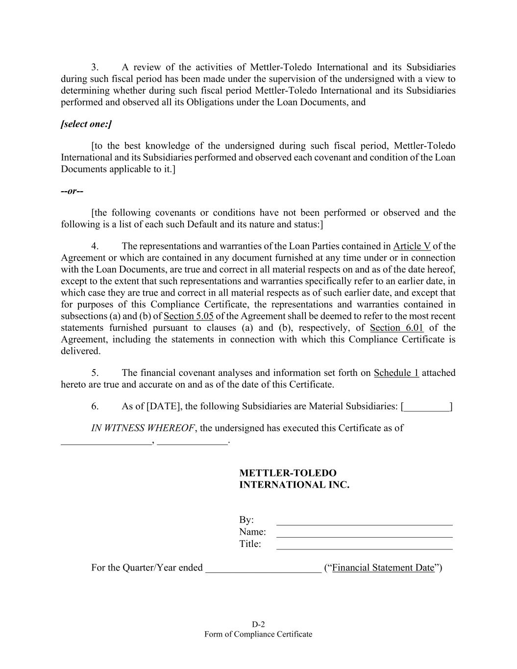 D-2 Form of Compliance Certificate 3. A review of the activities of Mettler-Toledo International and its Subsidiaries during such fiscal period has been made under the supervision of the undersigned with a view to determining whether during such fiscal period Mettler-Toledo International and its Subsidiaries performed and observed all its Obligations under the Loan Documents, and [select one:] [to the best knowledge of the undersigned during such fiscal period, Mettler-Toledo International and its Subsidiaries performed and observed each covenant and condition of the Loan Documents applicable to it.] --or-- [the following covenants or conditions have not been performed or observed and the following is a list of each such Default and its nature and status:] 4. The representations and warranties of the Loan Parties contained in Article V of the Agreement or which are contained in any document furnished at any time under or in connection with the Loan Documents, are true and correct in all material respects on and as of the date hereof, except to the extent that such representations and warranties specifically refer to an earlier date, in which case they are true and correct in all material respects as of such earlier date, and except that for purposes of this Compliance Certificate, the representations and warranties contained in subsections (a) and (b) of Section 5.05 of the Agreement shall be deemed to refer to the most recent statements furnished pursuant to clauses (a) and (b), respectively, of Section 6.01 of the Agreement, including the statements in connection with which this Compliance Certificate is delivered. 5. The financial covenant analyses and information set forth on Schedule 1 attached hereto are true and accurate on and as of the date of this Certificate. 6. As of [DATE], the following Subsidiaries are Material Subsidiaries: [_________] IN WITNESS WHEREOF, the undersigned has executed this Certificate as of __________________, ______________. METTLER-TOLEDO INTERNATIONAL INC. By: Name: Title: For the Quarter/Year ended _______________________ (“Financial Statement Date”)