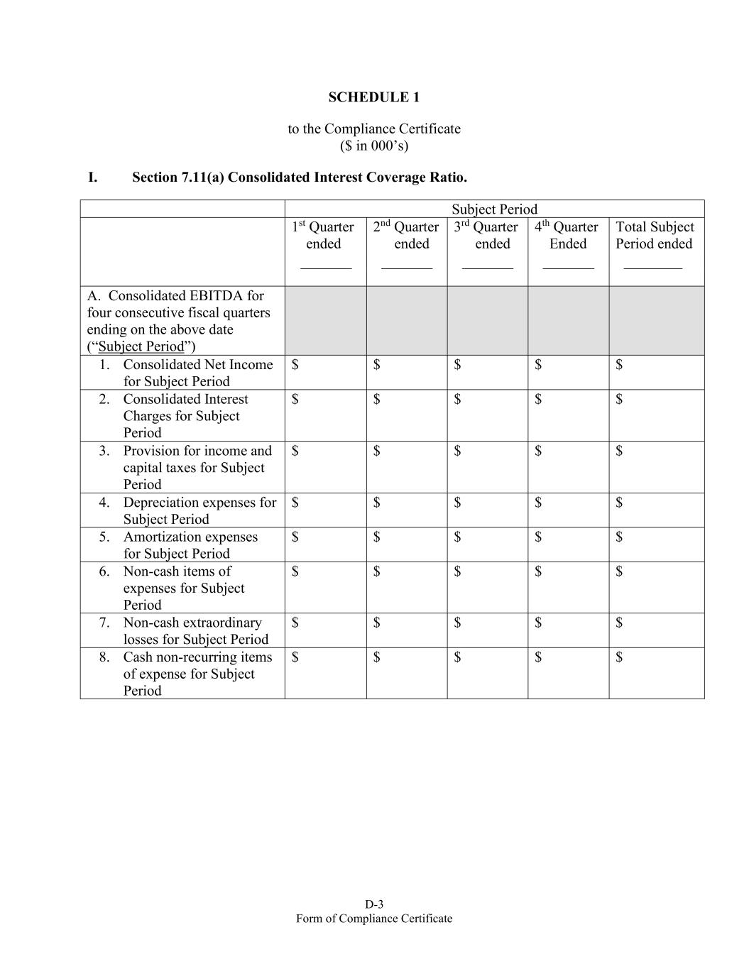 D-3 Form of Compliance Certificate SCHEDULE 1 to the Compliance Certificate ($ in 000’s) I. Section 7.11(a) Consolidated Interest Coverage Ratio. Subject Period 1st Quarter 2nd Quarter 3rd Quarter 4th Quarter Total Subject ended ended ended Ended Period ended A. Consolidated EBITDA for four consecutive fiscal quarters ending on the above date (“Subject Period”) 1. Consolidated Net Income for Subject Period $ $ $ $ $ 2. Consolidated Interest Charges for Subject Period $ $ $ $ $ 3. Provision for income and capital taxes for Subject Period $ $ $ $ $ 4. Depreciation expenses for Subject Period $ $ $ $ $ 5. Amortization expenses for Subject Period $ $ $ $ $ 6. Non-cash items of expenses for Subject Period $ $ $ $ $ 7. Non-cash extraordinary losses for Subject Period $ $ $ $ $ 8. Cash non-recurring items of expense for Subject Period $ $ $ $ $