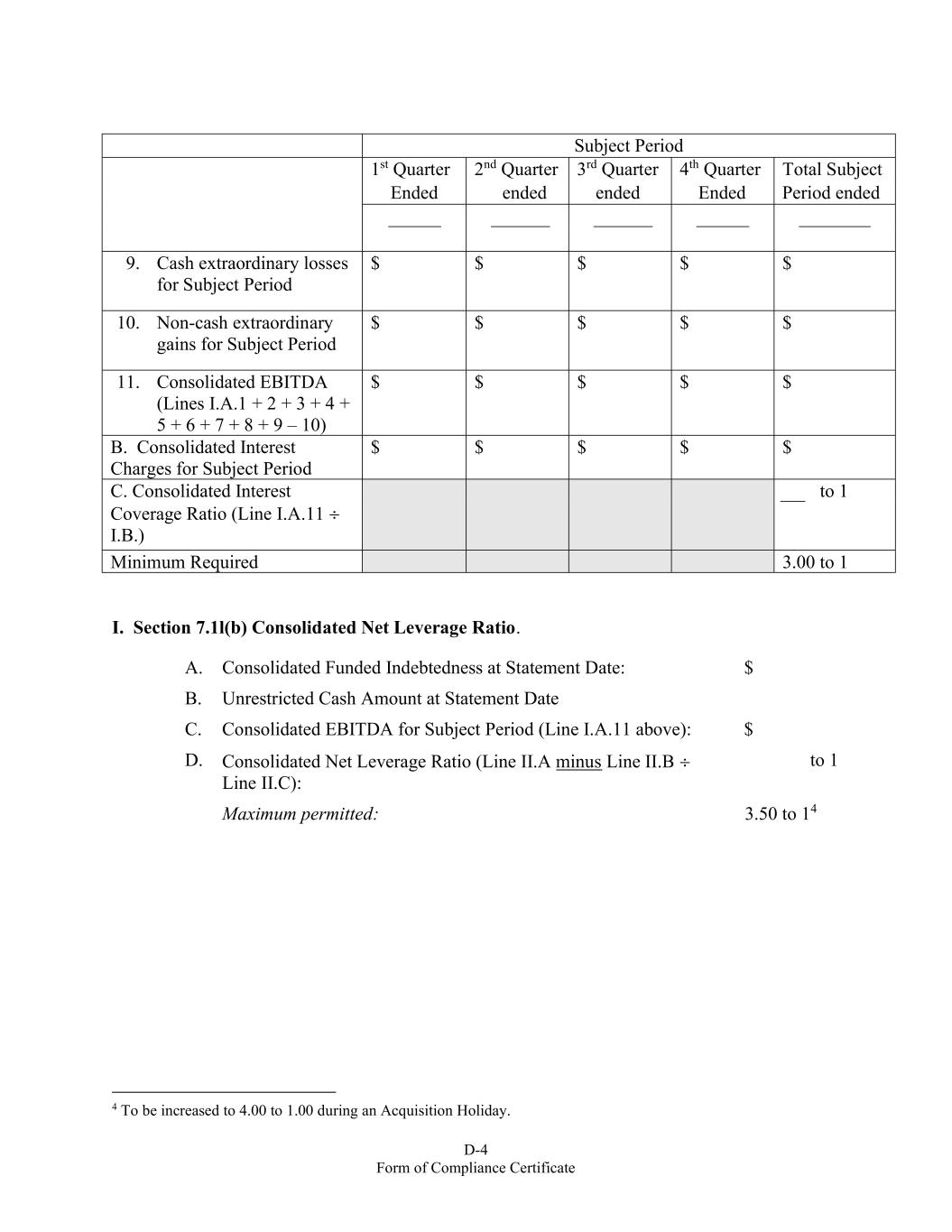 D-4 Form of Compliance Certificate Subject Period 1st Quarter 2nd Quarter 3rd Quarter 4th Quarter Total Subject Ended ended ended Ended Period ended 9. Cash extraordinary losses for Subject Period $ $ $ $ $ 10. Non-cash extraordinary gains for Subject Period $ $ $ $ $ 11. Consolidated EBITDA (Lines I.A.1 + 2 + 3 + 4 + 5 + 6 + 7 + 8 + 9 – 10) $ $ $ $ $ B. Consolidated Interest Charges for Subject Period $ $ $ $ $ C. Consolidated Interest Coverage Ratio (Line I.A.11  I.B.) to 1 Minimum Required 3.00 to 1 I. Section 7.1l(b) Consolidated Net Leverage Ratio. A. Consolidated Funded Indebtedness at Statement Date: $ B. Unrestricted Cash Amount at Statement Date C. Consolidated EBITDA for Subject Period (Line I.A.11 above): $ D. Consolidated Net Leverage Ratio (Line II.A minus Line II.B  Line II.C): to 1 Maximum permitted: 3.50 to 14 4 To be increased to 4.00 to 1.00 during an Acquisition Holiday.