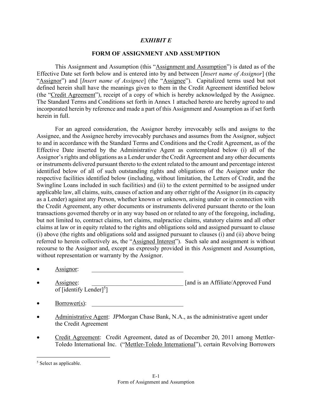 E-1 Form of Assignment and Assumption EXHIBIT E FORM OF ASSIGNMENT AND ASSUMPTION This Assignment and Assumption (this “Assignment and Assumption”) is dated as of the Effective Date set forth below and is entered into by and between [Insert name of Assignor] (the “Assignor”) and [Insert name of Assignee] (the “Assignee”). Capitalized terms used but not defined herein shall have the meanings given to them in the Credit Agreement identified below (the “Credit Agreement”), receipt of a copy of which is hereby acknowledged by the Assignee. The Standard Terms and Conditions set forth in Annex 1 attached hereto are hereby agreed to and incorporated herein by reference and made a part of this Assignment and Assumption as if set forth herein in full. For an agreed consideration, the Assignor hereby irrevocably sells and assigns to the Assignee, and the Assignee hereby irrevocably purchases and assumes from the Assignor, subject to and in accordance with the Standard Terms and Conditions and the Credit Agreement, as of the Effective Date inserted by the Administrative Agent as contemplated below (i) all of the Assignor’s rights and obligations as a Lender under the Credit Agreement and any other documents or instruments delivered pursuant thereto to the extent related to the amount and percentage interest identified below of all of such outstanding rights and obligations of the Assignor under the respective facilities identified below (including, without limitation, the Letters of Credit, and the Swingline Loans included in such facilities) and (ii) to the extent permitted to be assigned under applicable law, all claims, suits, causes of action and any other right of the Assignor (in its capacity as a Lender) against any Person, whether known or unknown, arising under or in connection with the Credit Agreement, any other documents or instruments delivered pursuant thereto or the loan transactions governed thereby or in any way based on or related to any of the foregoing, including, but not limited to, contract claims, tort claims, malpractice claims, statutory claims and all other claims at law or in equity related to the rights and obligations sold and assigned pursuant to clause (i) above (the rights and obligations sold and assigned pursuant to clauses (i) and (ii) above being referred to herein collectively as, the “Assigned Interest”). Such sale and assignment is without recourse to the Assignor and, except as expressly provided in this Assignment and Assumption, without representation or warranty by the Assignor.  Assignor: ______________________________  Assignee: ______________________________ [and is an Affiliate/Approved Fund of [identify Lender]5]  Borrower(s): ______________________________  Administrative Agent: JPMorgan Chase Bank, N.A., as the administrative agent under the Credit Agreement  Credit Agreement: Credit Agreement, dated as of December 20, 2011 among Mettler- Toledo International Inc. (“Mettler-Toledo International”), certain Revolving Borrowers 5 Select as applicable.