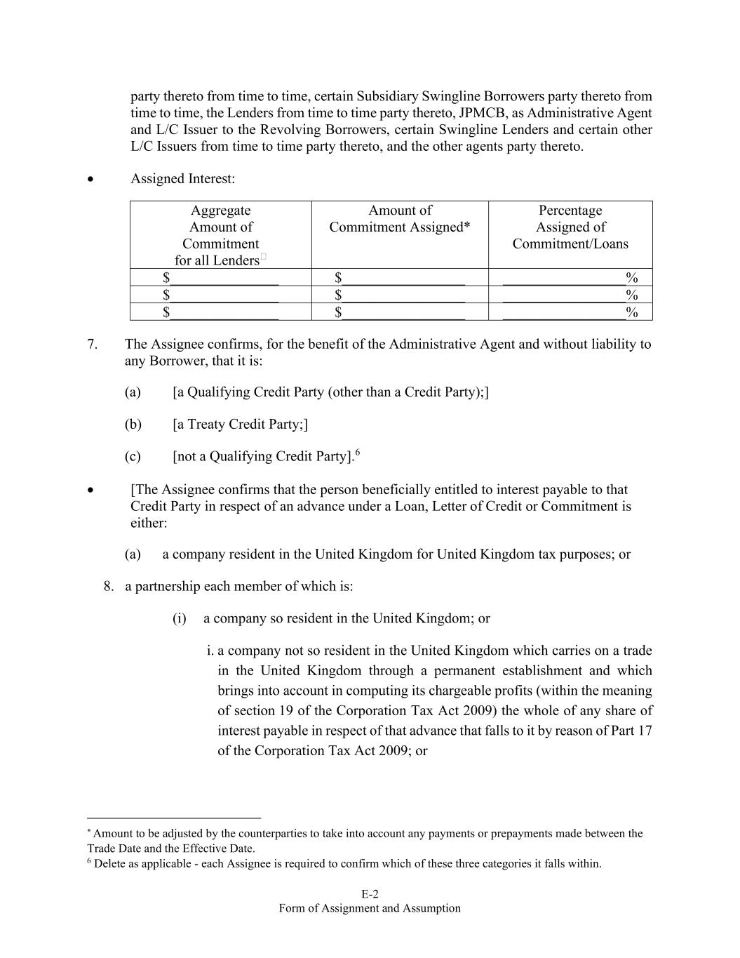 E-2 Form of Assignment and Assumption party thereto from time to time, certain Subsidiary Swingline Borrowers party thereto from time to time, the Lenders from time to time party thereto, JPMCB, as Administrative Agent and L/C Issuer to the Revolving Borrowers, certain Swingline Lenders and certain other L/C Issuers from time to time party thereto, and the other agents party thereto.  Assigned Interest: Aggregate Amount of Commitment for all Lenders Amount of Commitment Assigned* Percentage Assigned of Commitment/Loans $_______________ $_________________ _________________% $_______________ $_________________ _________________% $_______________ $_________________ _________________% 7. The Assignee confirms, for the benefit of the Administrative Agent and without liability to any Borrower, that it is: (a) [a Qualifying Credit Party (other than a Credit Party);] (b) [a Treaty Credit Party;] (c) [not a Qualifying Credit Party].6  [The Assignee confirms that the person beneficially entitled to interest payable to that Credit Party in respect of an advance under a Loan, Letter of Credit or Commitment is either: (a) a company resident in the United Kingdom for United Kingdom tax purposes; or 8. a partnership each member of which is: (i) a company so resident in the United Kingdom; or i. a company not so resident in the United Kingdom which carries on a trade in the United Kingdom through a permanent establishment and which brings into account in computing its chargeable profits (within the meaning of section 19 of the Corporation Tax Act 2009) the whole of any share of interest payable in respect of that advance that falls to it by reason of Part 17 of the Corporation Tax Act 2009; or Amount to be adjusted by the counterparties to take into account any payments or prepayments made between the Trade Date and the Effective Date. 6 Delete as applicable - each Assignee is required to confirm which of these three categories it falls within.