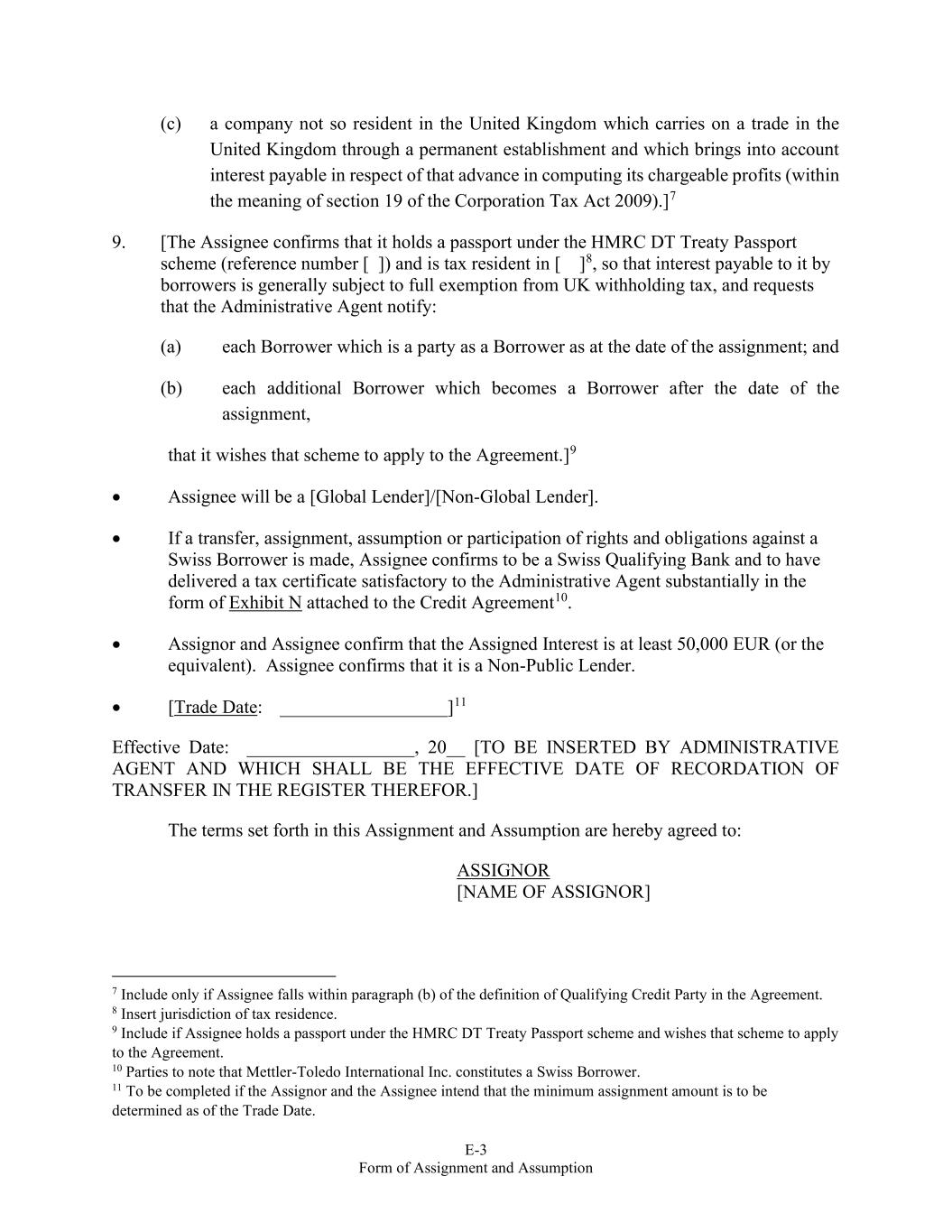 E-3 Form of Assignment and Assumption (c) a company not so resident in the United Kingdom which carries on a trade in the United Kingdom through a permanent establishment and which brings into account interest payable in respect of that advance in computing its chargeable profits (within the meaning of section 19 of the Corporation Tax Act 2009).]7 9. [The Assignee confirms that it holds a passport under the HMRC DT Treaty Passport scheme (reference number [ ]) and is tax resident in [ ]8, so that interest payable to it by borrowers is generally subject to full exemption from UK withholding tax, and requests that the Administrative Agent notify: (a) each Borrower which is a party as a Borrower as at the date of the assignment; and (b) each additional Borrower which becomes a Borrower after the date of the assignment, that it wishes that scheme to apply to the Agreement.]9  Assignee will be a [Global Lender]/[Non-Global Lender].  If a transfer, assignment, assumption or participation of rights and obligations against a Swiss Borrower is made, Assignee confirms to be a Swiss Qualifying Bank and to have delivered a tax certificate satisfactory to the Administrative Agent substantially in the form of Exhibit N attached to the Credit Agreement10.  Assignor and Assignee confirm that the Assigned Interest is at least 50,000 EUR (or the equivalent). Assignee confirms that it is a Non-Public Lender.  [Trade Date: __________________]11 Effective Date: __________________, 20__ [TO BE INSERTED BY ADMINISTRATIVE AGENT AND WHICH SHALL BE THE EFFECTIVE DATE OF RECORDATION OF TRANSFER IN THE REGISTER THEREFOR.] The terms set forth in this Assignment and Assumption are hereby agreed to: ASSIGNOR [NAME OF ASSIGNOR] 7 Include only if Assignee falls within paragraph (b) of the definition of Qualifying Credit Party in the Agreement. 8 Insert jurisdiction of tax residence. 9 Include if Assignee holds a passport under the HMRC DT Treaty Passport scheme and wishes that scheme to apply to the Agreement. 10 Parties to note that Mettler-Toledo International Inc. constitutes a Swiss Borrower. 11 To be completed if the Assignor and the Assignee intend that the minimum assignment amount is to be determined as of the Trade Date.