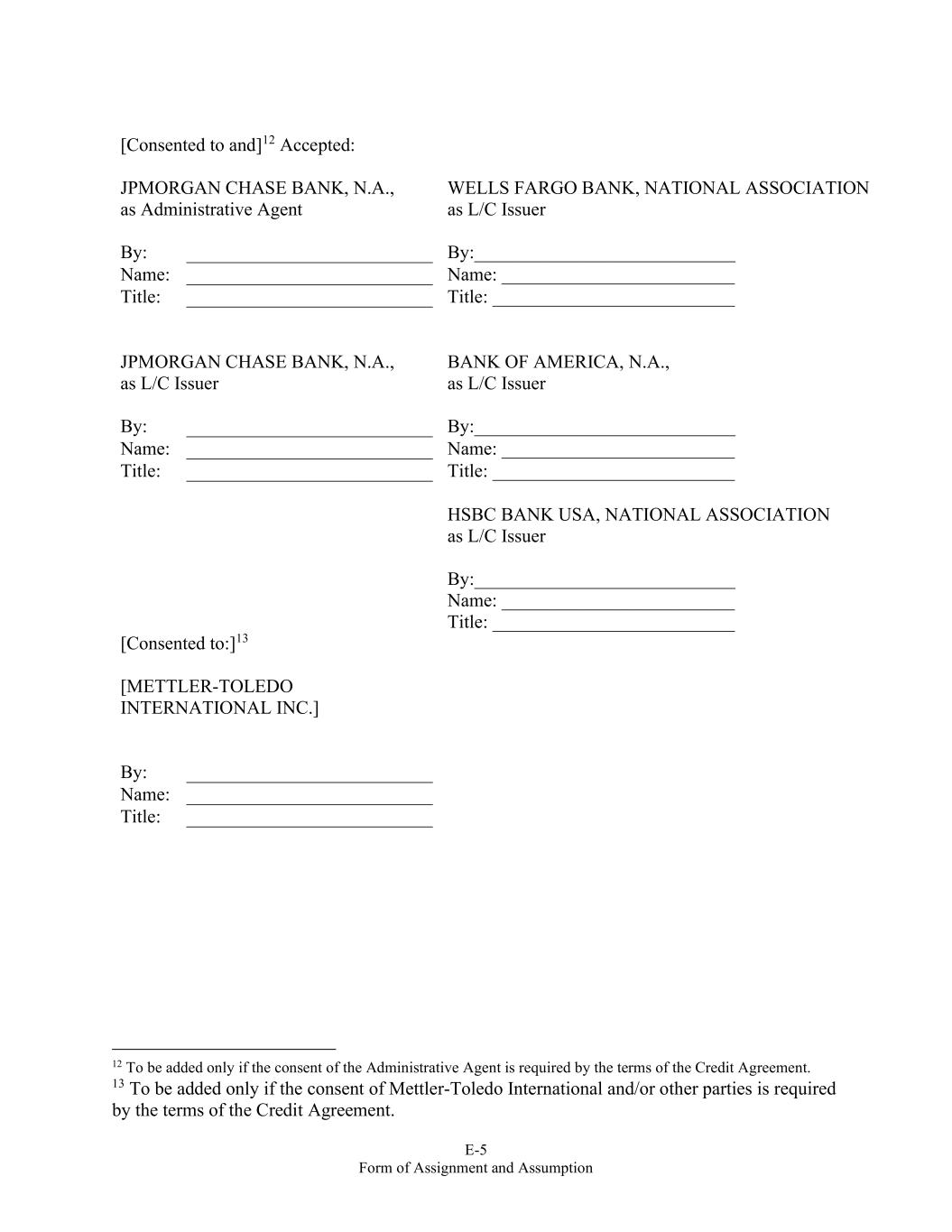 E-5 Form of Assignment and Assumption [Consented to and]12 Accepted: JPMORGAN CHASE BANK, N.A., WELLS FARGO BANK, NATIONAL ASSOCIATION as Administrative Agent as L/C Issuer By: By:____________________________ Name: Name: _________________________ Title: Title: __________________________ JPMORGAN CHASE BANK, N.A., BANK OF AMERICA, N.A., as L/C Issuer as L/C Issuer By: By:____________________________ Name: Name: _________________________ Title: Title: __________________________ HSBC BANK USA, NATIONAL ASSOCIATION as L/C Issuer By:____________________________ Name: _________________________ Title: __________________________ [Consented to:]13 [METTLER-TOLEDO INTERNATIONAL INC.] By: Name: Title: 12 To be added only if the consent of the Administrative Agent is required by the terms of the Credit Agreement. 13 To be added only if the consent of Mettler-Toledo International and/or other parties is required by the terms of the Credit Agreement.