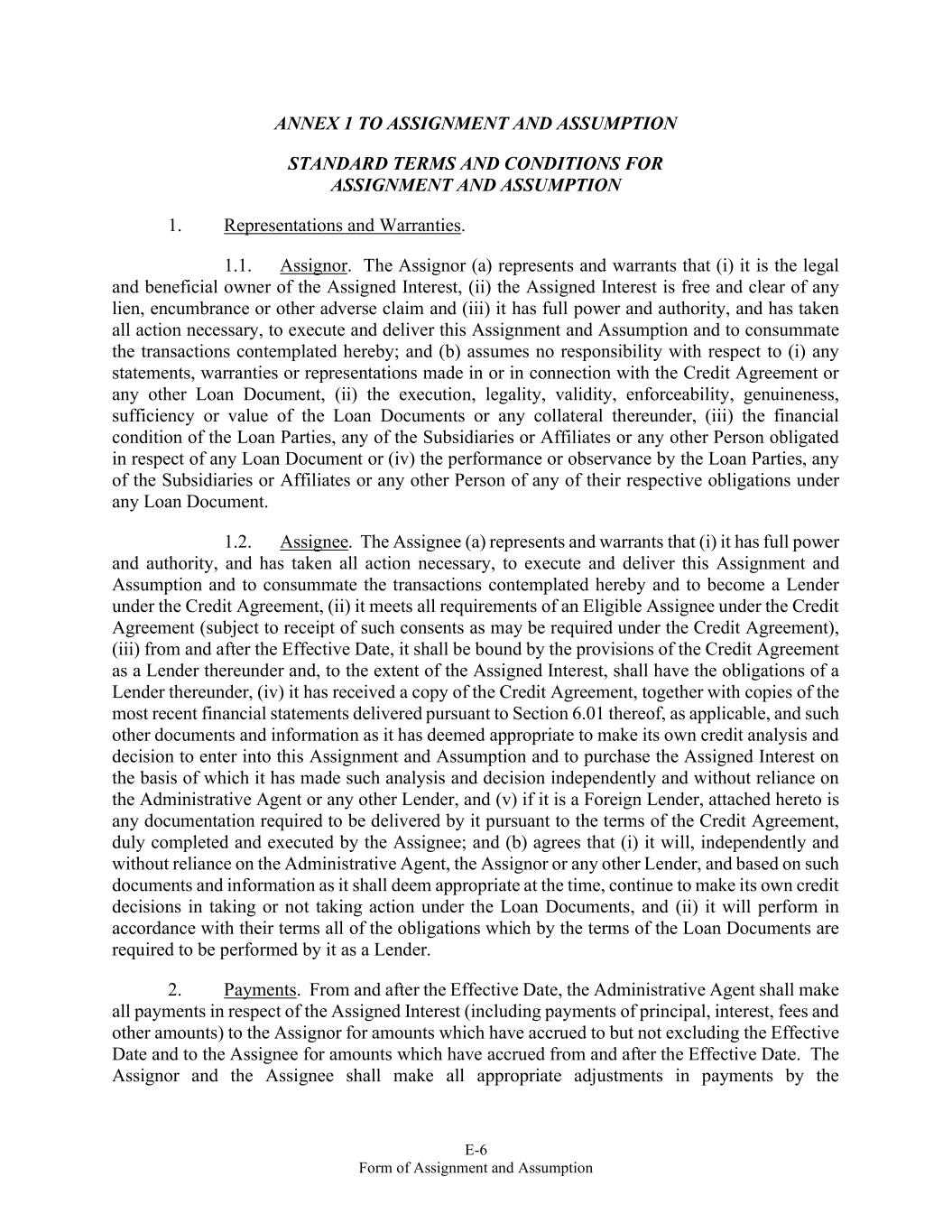 E-6 Form of Assignment and Assumption ANNEX 1 TO ASSIGNMENT AND ASSUMPTION STANDARD TERMS AND CONDITIONS FOR ASSIGNMENT AND ASSUMPTION 1. Representations and Warranties. 1.1. Assignor. The Assignor (a) represents and warrants that (i) it is the legal and beneficial owner of the Assigned Interest, (ii) the Assigned Interest is free and clear of any lien, encumbrance or other adverse claim and (iii) it has full power and authority, and has taken all action necessary, to execute and deliver this Assignment and Assumption and to consummate the transactions contemplated hereby; and (b) assumes no responsibility with respect to (i) any statements, warranties or representations made in or in connection with the Credit Agreement or any other Loan Document, (ii) the execution, legality, validity, enforceability, genuineness, sufficiency or value of the Loan Documents or any collateral thereunder, (iii) the financial condition of the Loan Parties, any of the Subsidiaries or Affiliates or any other Person obligated in respect of any Loan Document or (iv) the performance or observance by the Loan Parties, any of the Subsidiaries or Affiliates or any other Person of any of their respective obligations under any Loan Document. 1.2. Assignee. The Assignee (a) represents and warrants that (i) it has full power and authority, and has taken all action necessary, to execute and deliver this Assignment and Assumption and to consummate the transactions contemplated hereby and to become a Lender under the Credit Agreement, (ii) it meets all requirements of an Eligible Assignee under the Credit Agreement (subject to receipt of such consents as may be required under the Credit Agreement), (iii) from and after the Effective Date, it shall be bound by the provisions of the Credit Agreement as a Lender thereunder and, to the extent of the Assigned Interest, shall have the obligations of a Lender thereunder, (iv) it has received a copy of the Credit Agreement, together with copies of the most recent financial statements delivered pursuant to Section 6.01 thereof, as applicable, and such other documents and information as it has deemed appropriate to make its own credit analysis and decision to enter into this Assignment and Assumption and to purchase the Assigned Interest on the basis of which it has made such analysis and decision independently and without reliance on the Administrative Agent or any other Lender, and (v) if it is a Foreign Lender, attached hereto is any documentation required to be delivered by it pursuant to the terms of the Credit Agreement, duly completed and executed by the Assignee; and (b) agrees that (i) it will, independently and without reliance on the Administrative Agent, the Assignor or any other Lender, and based on such documents and information as it shall deem appropriate at the time, continue to make its own credit decisions in taking or not taking action under the Loan Documents, and (ii) it will perform in accordance with their terms all of the obligations which by the terms of the Loan Documents are required to be performed by it as a Lender. 2. Payments. From and after the Effective Date, the Administrative Agent shall make all payments in respect of the Assigned Interest (including payments of principal, interest, fees and other amounts) to the Assignor for amounts which have accrued to but not excluding the Effective Date and to the Assignee for amounts which have accrued from and after the Effective Date. The Assignor and the Assignee shall make all appropriate adjustments in payments by the
