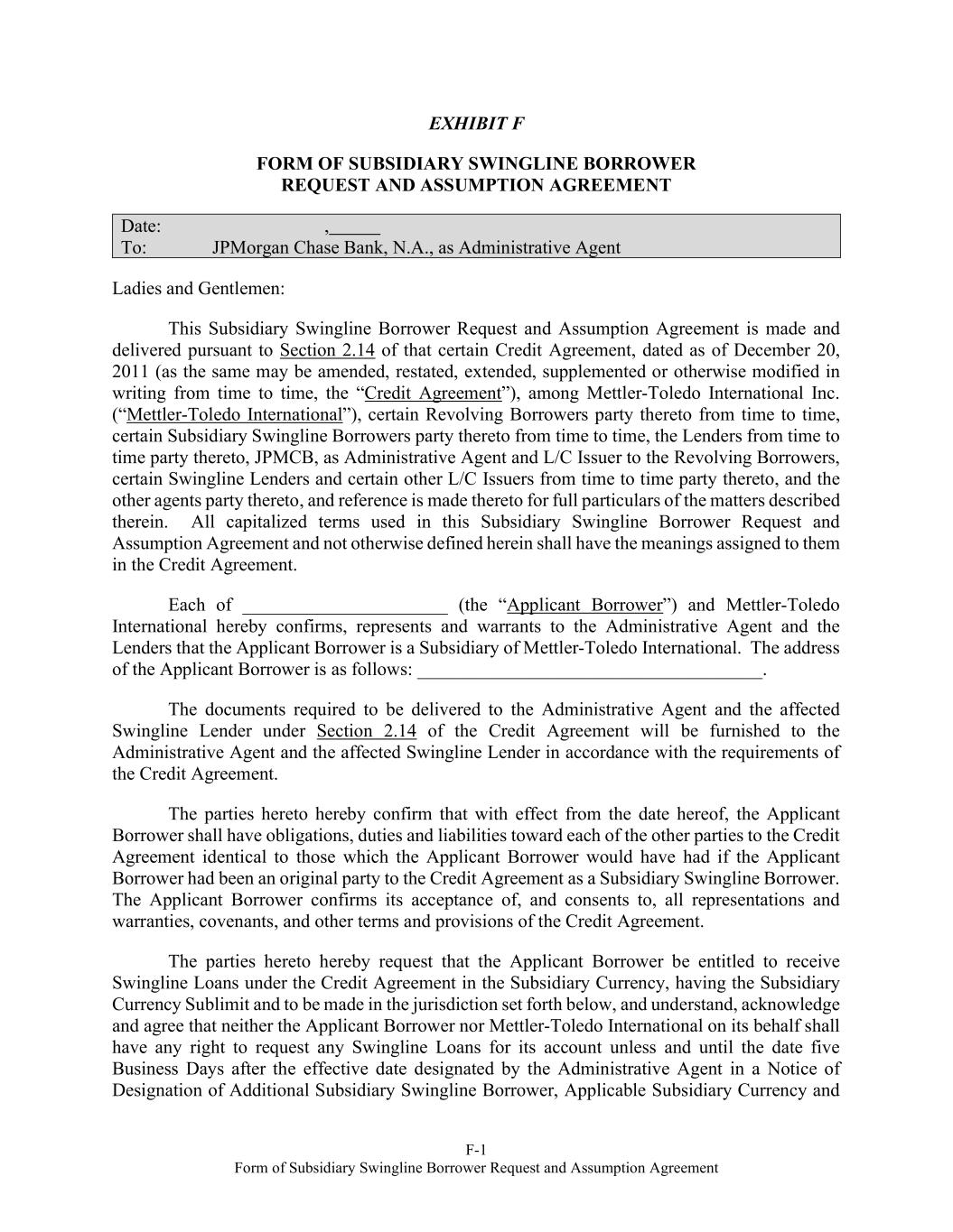 F-1 Form of Subsidiary Swingline Borrower Request and Assumption Agreement EXHIBIT F FORM OF SUBSIDIARY SWINGLINE BORROWER REQUEST AND ASSUMPTION AGREEMENT Date: , To: JPMorgan Chase Bank, N.A., as Administrative Agent Ladies and Gentlemen: This Subsidiary Swingline Borrower Request and Assumption Agreement is made and delivered pursuant to Section 2.14 of that certain Credit Agreement, dated as of December 20, 2011 (as the same may be amended, restated, extended, supplemented or otherwise modified in writing from time to time, the “Credit Agreement”), among Mettler-Toledo International Inc. (“Mettler-Toledo International”), certain Revolving Borrowers party thereto from time to time, certain Subsidiary Swingline Borrowers party thereto from time to time, the Lenders from time to time party thereto, JPMCB, as Administrative Agent and L/C Issuer to the Revolving Borrowers, certain Swingline Lenders and certain other L/C Issuers from time to time party thereto, and the other agents party thereto, and reference is made thereto for full particulars of the matters described therein. All capitalized terms used in this Subsidiary Swingline Borrower Request and Assumption Agreement and not otherwise defined herein shall have the meanings assigned to them in the Credit Agreement. Each of ______________________ (the “Applicant Borrower”) and Mettler-Toledo International hereby confirms, represents and warrants to the Administrative Agent and the Lenders that the Applicant Borrower is a Subsidiary of Mettler-Toledo International. The address of the Applicant Borrower is as follows: _____________________________________. The documents required to be delivered to the Administrative Agent and the affected Swingline Lender under Section 2.14 of the Credit Agreement will be furnished to the Administrative Agent and the affected Swingline Lender in accordance with the requirements of the Credit Agreement. The parties hereto hereby confirm that with effect from the date hereof, the Applicant Borrower shall have obligations, duties and liabilities toward each of the other parties to the Credit Agreement identical to those which the Applicant Borrower would have had if the Applicant Borrower had been an original party to the Credit Agreement as a Subsidiary Swingline Borrower. The Applicant Borrower confirms its acceptance of, and consents to, all representations and warranties, covenants, and other terms and provisions of the Credit Agreement. The parties hereto hereby request that the Applicant Borrower be entitled to receive Swingline Loans under the Credit Agreement in the Subsidiary Currency, having the Subsidiary Currency Sublimit and to be made in the jurisdiction set forth below, and understand, acknowledge and agree that neither the Applicant Borrower nor Mettler-Toledo International on its behalf shall have any right to request any Swingline Loans for its account unless and until the date five Business Days after the effective date designated by the Administrative Agent in a Notice of Designation of Additional Subsidiary Swingline Borrower, Applicable Subsidiary Currency and