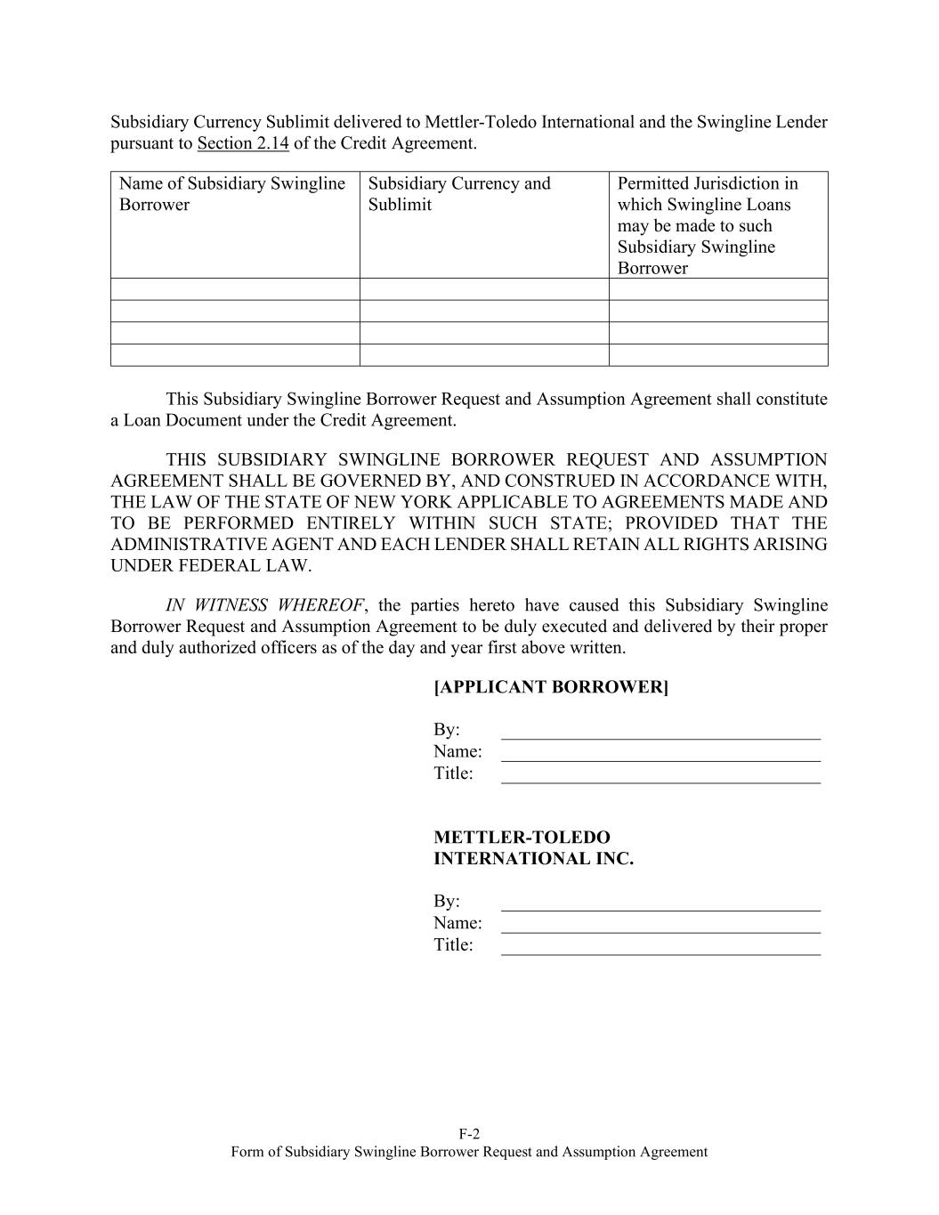 F-2 Form of Subsidiary Swingline Borrower Request and Assumption Agreement Subsidiary Currency Sublimit delivered to Mettler-Toledo International and the Swingline Lender pursuant to Section 2.14 of the Credit Agreement. Name of Subsidiary Swingline Borrower Subsidiary Currency and Sublimit Permitted Jurisdiction in which Swingline Loans may be made to such Subsidiary Swingline Borrower This Subsidiary Swingline Borrower Request and Assumption Agreement shall constitute a Loan Document under the Credit Agreement. THIS SUBSIDIARY SWINGLINE BORROWER REQUEST AND ASSUMPTION AGREEMENT SHALL BE GOVERNED BY, AND CONSTRUED IN ACCORDANCE WITH, THE LAW OF THE STATE OF NEW YORK APPLICABLE TO AGREEMENTS MADE AND TO BE PERFORMED ENTIRELY WITHIN SUCH STATE; PROVIDED THAT THE ADMINISTRATIVE AGENT AND EACH LENDER SHALL RETAIN ALL RIGHTS ARISING UNDER FEDERAL LAW. IN WITNESS WHEREOF, the parties hereto have caused this Subsidiary Swingline Borrower Request and Assumption Agreement to be duly executed and delivered by their proper and duly authorized officers as of the day and year first above written. [APPLICANT BORROWER] By: Name: Title: METTLER-TOLEDO INTERNATIONAL INC. By: Name: Title: