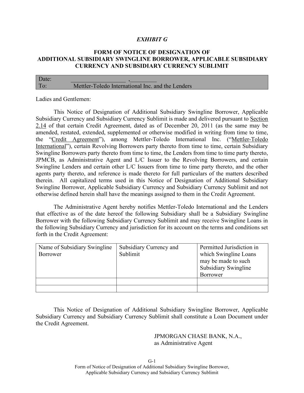 G-1 Form of Notice of Designation of Additional Subsidiary Swingline Borrower, Applicable Subsidiary Currency and Subsidiary Currency Sublimit EXHIBIT G FORM OF NOTICE OF DESIGNATION OF ADDITIONAL SUBSIDIARY SWINGLINE BORROWER, APPLICABLE SUBSIDIARY CURRENCY AND SUBSIDIARY CURRENCY SUBLIMIT Date: To: ,_________ Mettler-Toledo International Inc. and the Lenders Ladies and Gentlemen: This Notice of Designation of Additional Subsidiary Swingline Borrower, Applicable Subsidiary Currency and Subsidiary Currency Sublimit is made and delivered pursuant to Section 2.14 of that certain Credit Agreement, dated as of December 20, 2011 (as the same may be amended, restated, extended, supplemented or otherwise modified in writing from time to time, the “Credit Agreement”), among Mettler-Toledo International Inc. (“Mettler-Toledo International”), certain Revolving Borrowers party thereto from time to time, certain Subsidiary Swingline Borrowers party thereto from time to time, the Lenders from time to time party thereto, JPMCB, as Administrative Agent and L/C Issuer to the Revolving Borrowers, and certain Swingline Lenders and certain other L/C Issuers from time to time party thereto, and the other agents party thereto, and reference is made thereto for full particulars of the matters described therein. All capitalized terms used in this Notice of Designation of Additional Subsidiary Swingline Borrower, Applicable Subsidiary Currency and Subsidiary Currency Sublimit and not otherwise defined herein shall have the meanings assigned to them in the Credit Agreement. The Administrative Agent hereby notifies Mettler-Toledo International and the Lenders that effective as of the date hereof the following Subsidiary shall be a Subsidiary Swingline Borrower with the following Subsidiary Currency Sublimit and may receive Swingline Loans in the following Subsidiary Currency and jurisdiction for its account on the terms and conditions set forth in the Credit Agreement: Name of Subsidiary Swingline Borrower Subsidiary Currency and Sublimit Permitted Jurisdiction in which Swingline Loans may be made to such Subsidiary Swingline Borrower This Notice of Designation of Additional Subsidiary Swingline Borrower, Applicable Subsidiary Currency and Subsidiary Currency Sublimit shall constitute a Loan Document under the Credit Agreement. JPMORGAN CHASE BANK, N.A., as Administrative Agent
