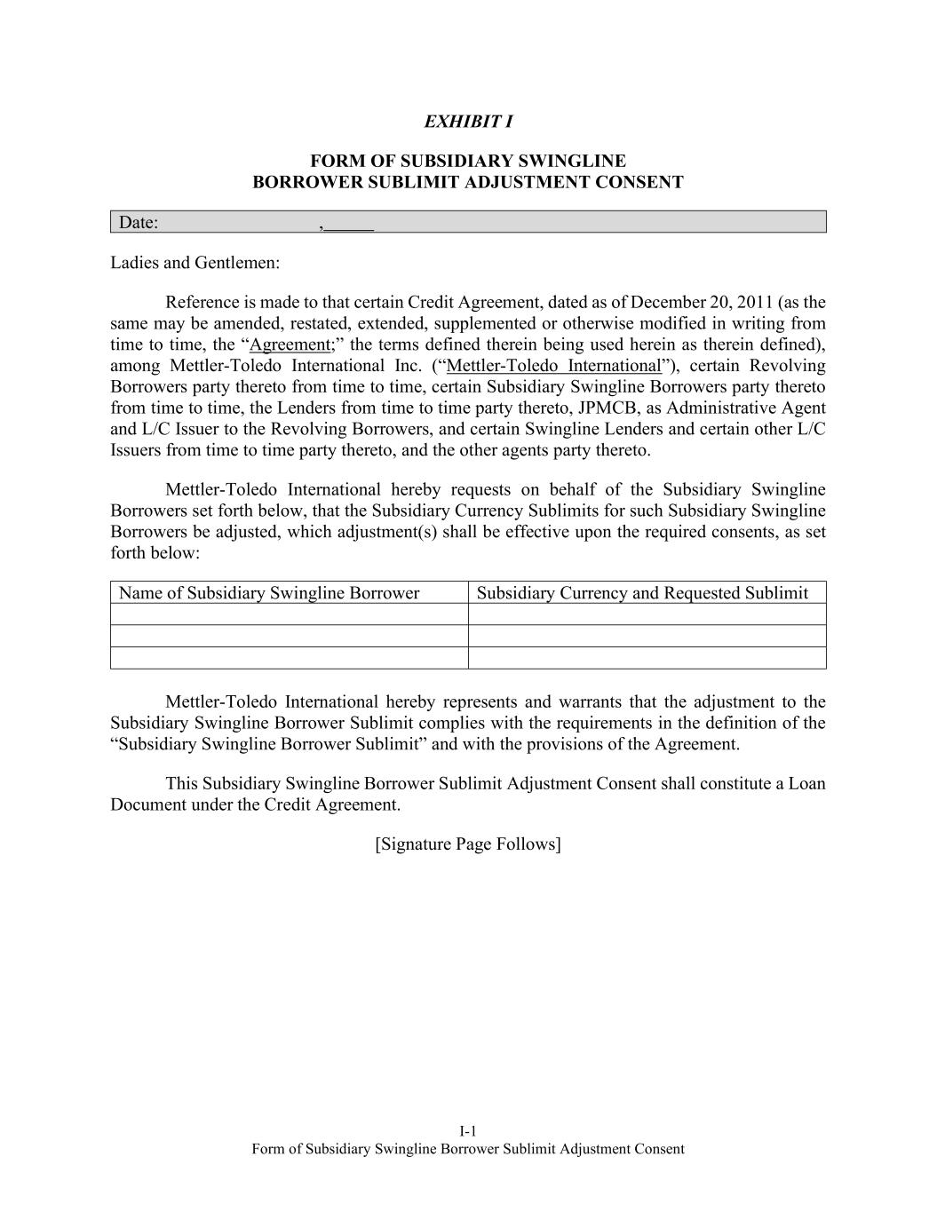 I-1 Form of Subsidiary Swingline Borrower Sublimit Adjustment Consent EXHIBIT I FORM OF SUBSIDIARY SWINGLINE BORROWER SUBLIMIT ADJUSTMENT CONSENT Date: , Ladies and Gentlemen: Reference is made to that certain Credit Agreement, dated as of December 20, 2011 (as the same may be amended, restated, extended, supplemented or otherwise modified in writing from time to time, the “Agreement;” the terms defined therein being used herein as therein defined), among Mettler-Toledo International Inc. (“Mettler-Toledo International”), certain Revolving Borrowers party thereto from time to time, certain Subsidiary Swingline Borrowers party thereto from time to time, the Lenders from time to time party thereto, JPMCB, as Administrative Agent and L/C Issuer to the Revolving Borrowers, and certain Swingline Lenders and certain other L/C Issuers from time to time party thereto, and the other agents party thereto. Mettler-Toledo International hereby requests on behalf of the Subsidiary Swingline Borrowers set forth below, that the Subsidiary Currency Sublimits for such Subsidiary Swingline Borrowers be adjusted, which adjustment(s) shall be effective upon the required consents, as set forth below: Name of Subsidiary Swingline Borrower Subsidiary Currency and Requested Sublimit Mettler-Toledo International hereby represents and warrants that the adjustment to the Subsidiary Swingline Borrower Sublimit complies with the requirements in the definition of the “Subsidiary Swingline Borrower Sublimit” and with the provisions of the Agreement. This Subsidiary Swingline Borrower Sublimit Adjustment Consent shall constitute a Loan Document under the Credit Agreement. [Signature Page Follows]