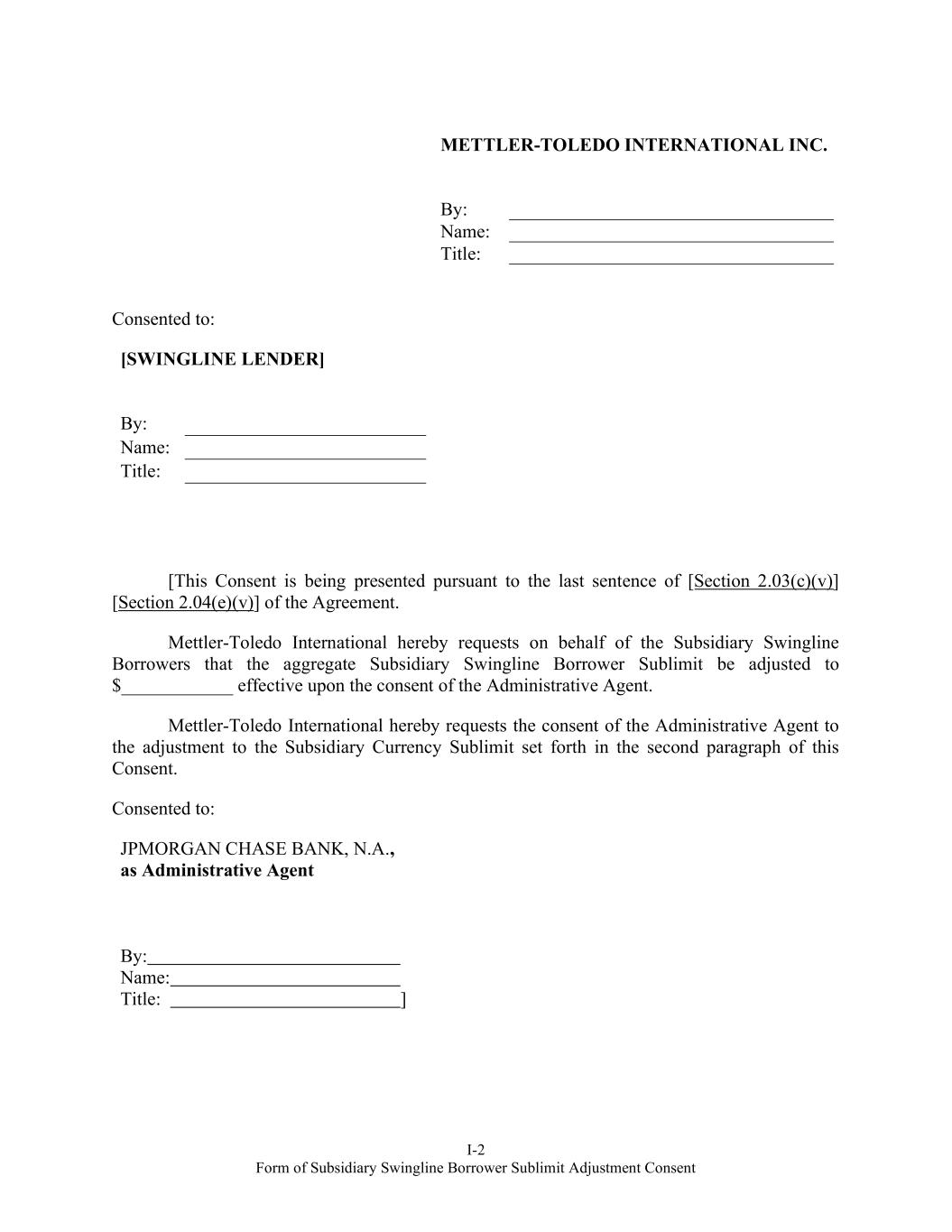 I-2 Form of Subsidiary Swingline Borrower Sublimit Adjustment Consent METTLER-TOLEDO INTERNATIONAL INC. By: Name: Title: Consented to: [SWINGLINE LENDER] By: Name: Title: [This Consent is being presented pursuant to the last sentence of [Section 2.03(c)(v)] [Section 2.04(e)(v)] of the Agreement. Mettler-Toledo International hereby requests on behalf of the Subsidiary Swingline Borrowers that the aggregate Subsidiary Swingline Borrower Sublimit be adjusted to $____________ effective upon the consent of the Administrative Agent. Mettler-Toledo International hereby requests the consent of the Administrative Agent to the adjustment to the Subsidiary Currency Sublimit set forth in the second paragraph of this Consent. Consented to: JPMORGAN CHASE BANK, N.A., as Administrative Agent By: Name: Title: ]
