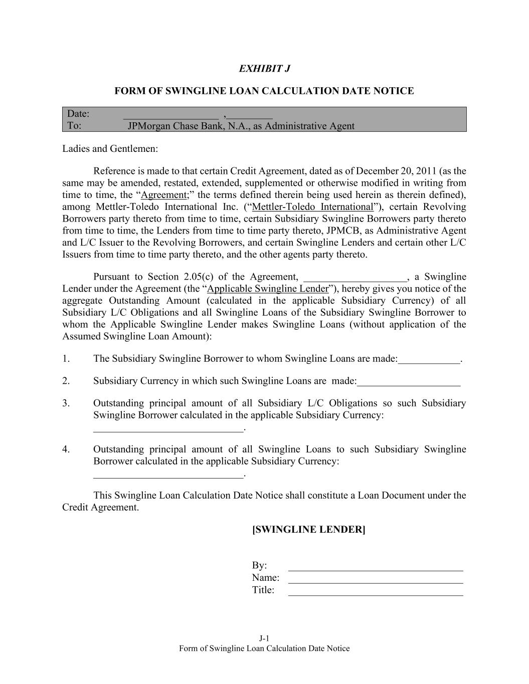 J-1 Form of Swingline Loan Calculation Date Notice EXHIBIT J FORM OF SWINGLINE LOAN CALCULATION DATE NOTICE Date: To: ,_________ JPMorgan Chase Bank, N.A., as Administrative Agent Ladies and Gentlemen: Reference is made to that certain Credit Agreement, dated as of December 20, 2011 (as the same may be amended, restated, extended, supplemented or otherwise modified in writing from time to time, the “Agreement;” the terms defined therein being used herein as therein defined), among Mettler-Toledo International Inc. (“Mettler-Toledo International”), certain Revolving Borrowers party thereto from time to time, certain Subsidiary Swingline Borrowers party thereto from time to time, the Lenders from time to time party thereto, JPMCB, as Administrative Agent and L/C Issuer to the Revolving Borrowers, and certain Swingline Lenders and certain other L/C Issuers from time to time party thereto, and the other agents party thereto. Pursuant to Section 2.05(c) of the Agreement, ____________________, a Swingline Lender under the Agreement (the “Applicable Swingline Lender”), hereby gives you notice of the aggregate Outstanding Amount (calculated in the applicable Subsidiary Currency) of all Subsidiary L/C Obligations and all Swingline Loans of the Subsidiary Swingline Borrower to whom the Applicable Swingline Lender makes Swingline Loans (without application of the Assumed Swingline Loan Amount): 1. The Subsidiary Swingline Borrower to whom Swingline Loans are made:____________. 2. Subsidiary Currency in which such Swingline Loans are made:____________________ 3. Outstanding principal amount of all Subsidiary L/C Obligations so such Subsidiary Swingline Borrower calculated in the applicable Subsidiary Currency: _____________________________. 4. Outstanding principal amount of all Swingline Loans to such Subsidiary Swingline Borrower calculated in the applicable Subsidiary Currency: _____________________________. This Swingline Loan Calculation Date Notice shall constitute a Loan Document under the Credit Agreement. [SWINGLINE LENDER] By: Name: Title: