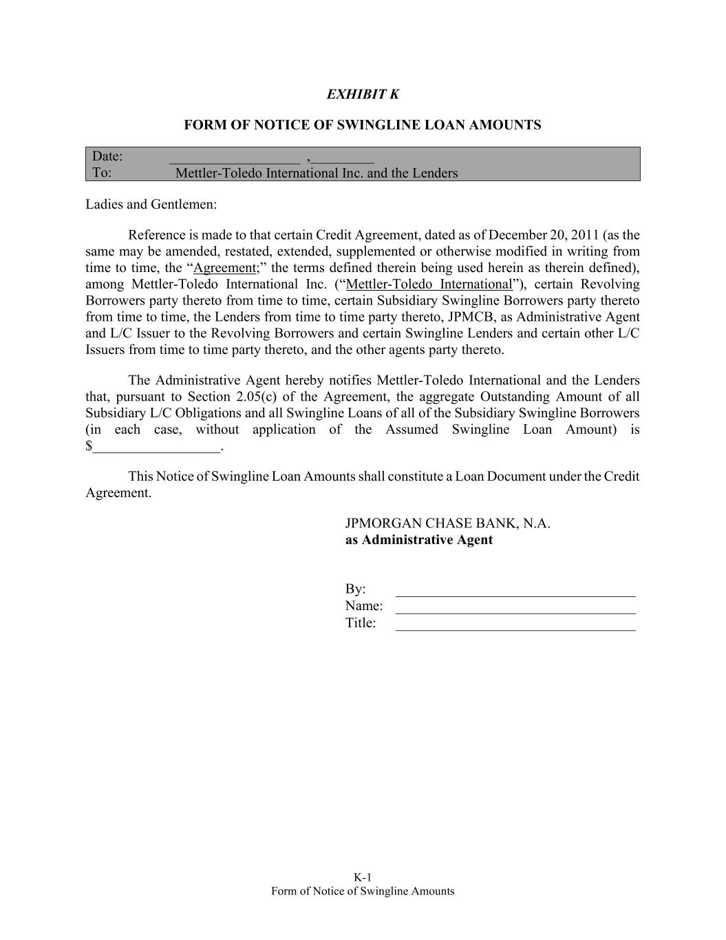 K-1 Form of Notice of Swingline Amounts EXHIBIT K FORM OF NOTICE OF SWINGLINE LOAN AMOUNTS Date: To: ,_________ Mettler-Toledo International Inc. and the Lenders Ladies and Gentlemen: Reference is made to that certain Credit Agreement, dated as of December 20, 2011 (as the same may be amended, restated, extended, supplemented or otherwise modified in writing from time to time, the “Agreement;” the terms defined therein being used herein as therein defined), among Mettler-Toledo International Inc. (“Mettler-Toledo International”), certain Revolving Borrowers party thereto from time to time, certain Subsidiary Swingline Borrowers party thereto from time to time, the Lenders from time to time party thereto, JPMCB, as Administrative Agent and L/C Issuer to the Revolving Borrowers and certain Swingline Lenders and certain other L/C Issuers from time to time party thereto, and the other agents party thereto. The Administrative Agent hereby notifies Mettler-Toledo International and the Lenders that, pursuant to Section 2.05(c) of the Agreement, the aggregate Outstanding Amount of all Subsidiary L/C Obligations and all Swingline Loans of all of the Subsidiary Swingline Borrowers (in each case, without application of the Assumed Swingline Loan Amount) is $__________________. This Notice of Swingline Loan Amounts shall constitute a Loan Document under the Credit Agreement. JPMORGAN CHASE BANK, N.A. as Administrative Agent By: Name: Title: