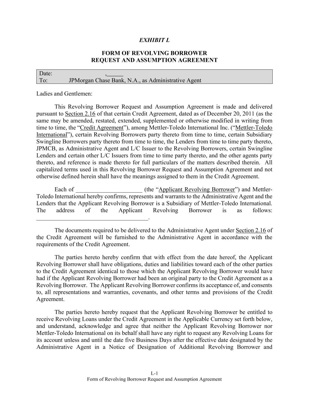 L-1 Form of Revolving Borrower Request and Assumption Agreement EXHIBIT L FORM OF REVOLVING BORROWER REQUEST AND ASSUMPTION AGREEMENT Date: , To: JPMorgan Chase Bank, N.A., as Administrative Agent Ladies and Gentlemen: This Revolving Borrower Request and Assumption Agreement is made and delivered pursuant to Section 2.16 of that certain Credit Agreement, dated as of December 20, 2011 (as the same may be amended, restated, extended, supplemented or otherwise modified in writing from time to time, the “Credit Agreement”), among Mettler-Toledo International Inc. (“Mettler-Toledo International”), certain Revolving Borrowers party thereto from time to time, certain Subsidiary Swingline Borrowers party thereto from time to time, the Lenders from time to time party thereto, JPMCB, as Administrative Agent and L/C Issuer to the Revolving Borrowers, certain Swingline Lenders and certain other L/C Issuers from time to time party thereto, and the other agents party thereto, and reference is made thereto for full particulars of the matters described therein. All capitalized terms used in this Revolving Borrower Request and Assumption Agreement and not otherwise defined herein shall have the meanings assigned to them in the Credit Agreement. Each of ______________________ (the “Applicant Revolving Borrower”) and Mettler- Toledo International hereby confirms, represents and warrants to the Administrative Agent and the Lenders that the Applicant Revolving Borrower is a Subsidiary of Mettler-Toledo International. The address of the Applicant Revolving Borrower is as follows: _____________________________________. The documents required to be delivered to the Administrative Agent under Section 2.16 of the Credit Agreement will be furnished to the Administrative Agent in accordance with the requirements of the Credit Agreement. The parties hereto hereby confirm that with effect from the date hereof, the Applicant Revolving Borrower shall have obligations, duties and liabilities toward each of the other parties to the Credit Agreement identical to those which the Applicant Revolving Borrower would have had if the Applicant Revolving Borrower had been an original party to the Credit Agreement as a Revolving Borrower. The Applicant Revolving Borrower confirms its acceptance of, and consents to, all representations and warranties, covenants, and other terms and provisions of the Credit Agreement. The parties hereto hereby request that the Applicant Revolving Borrower be entitled to receive Revolving Loans under the Credit Agreement in the Applicable Currency set forth below, and understand, acknowledge and agree that neither the Applicant Revolving Borrower nor Mettler-Toledo International on its behalf shall have any right to request any Revolving Loans for its account unless and until the date five Business Days after the effective date designated by the Administrative Agent in a Notice of Designation of Additional Revolving Borrower and